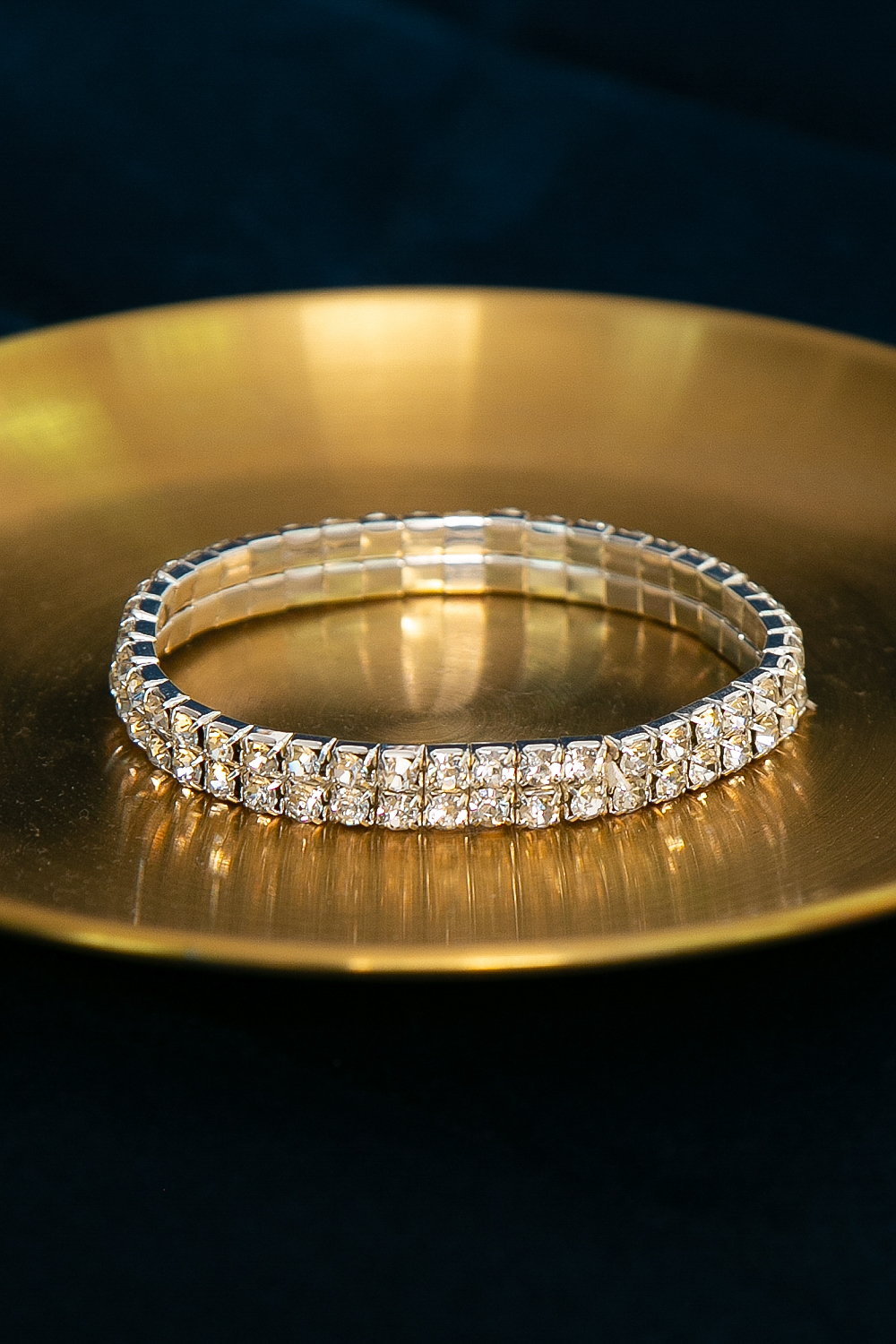 Браслет состоит из двух рядов сверкающих кристаллов. За счёт своей конструкции хорошо растягивается.