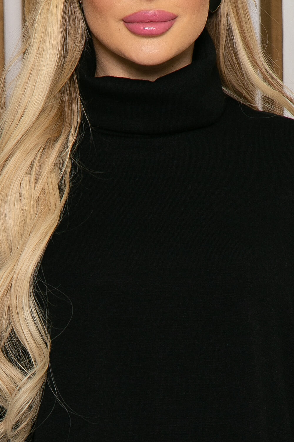 Горловина оформлена воротником "Хомут". По бокам джемпера есть разрезы.