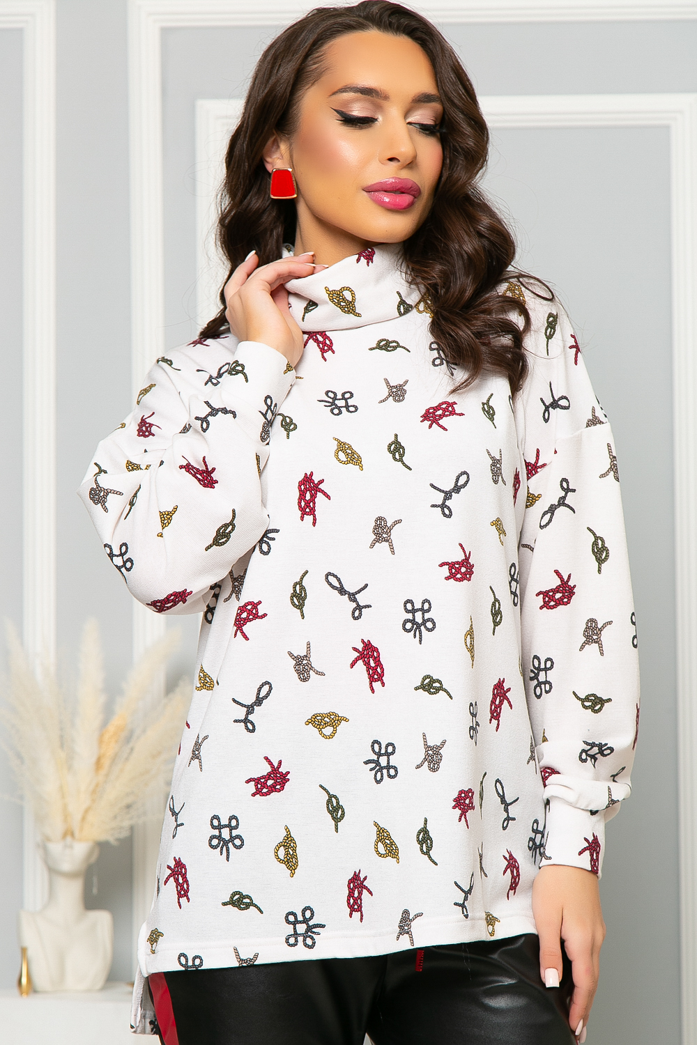 Горловина оформлена воротником "Хомут". По бокам джемпера есть разрезы, спинка удлинена.