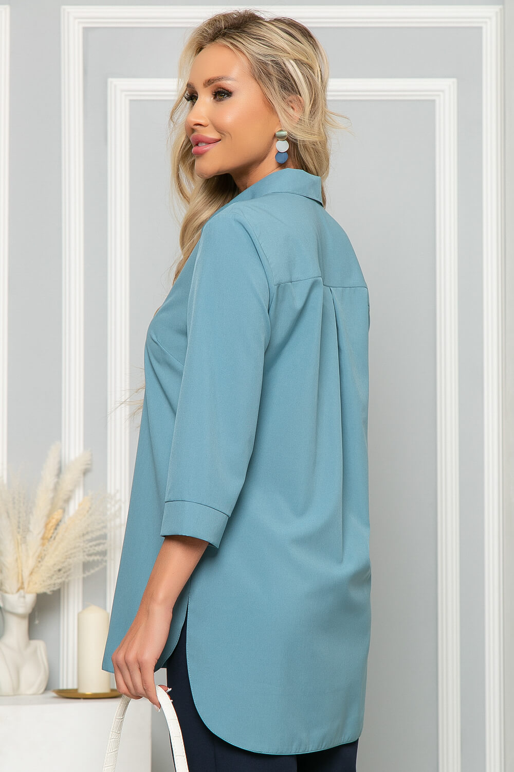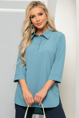 Лёгкая блуза свободного кроя в новом оттенке. Блуза с удлиненной спинкой, края скруглены, по бокам разрезы. Классический отложной воротник, по переду застёгивается на 4 пуговицы. Рукав три четверти, на манжете. Такая блуза подойдёт для создания офисного образа, а также её можно использовать в повседневных ансамблях.