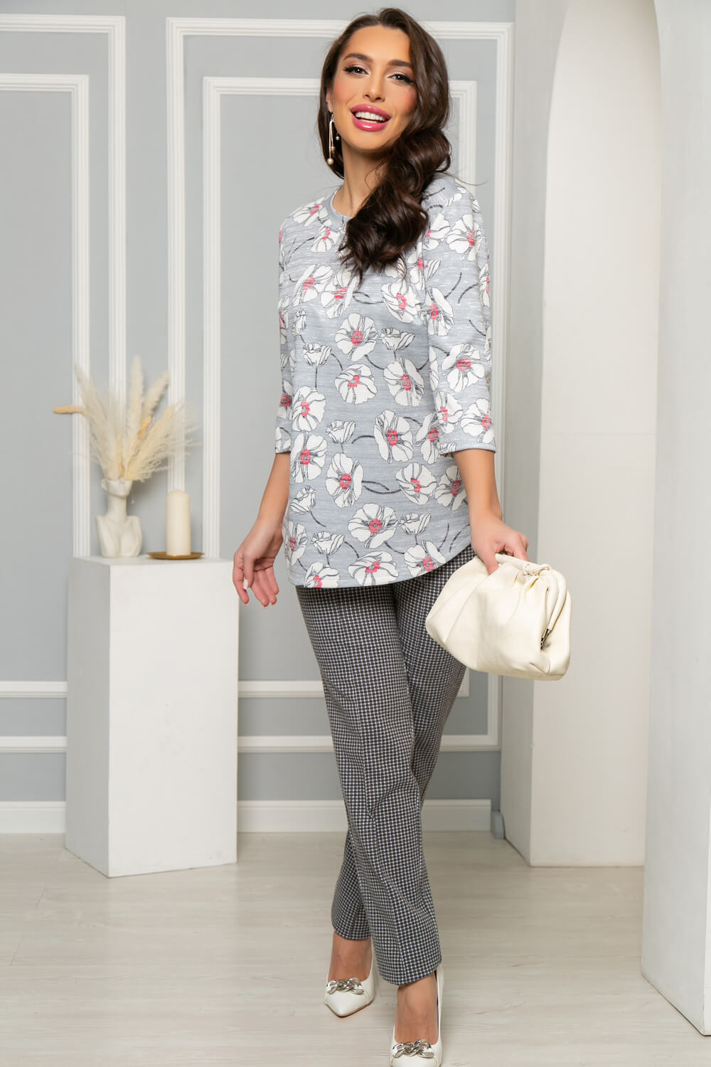 Джемпер из мягкого трикотажного полотна в светло-сером оттенке с нежным цветочным принтом. Подойдёт для создания расслабленного повседневного образа и будет гармонично смотреться и с джинсами и с брюками классических оттенков. Джемпер имеет втачной укороченный рукав. Горловина обработана обтачкой. Низ по переду и спинке скруглён.