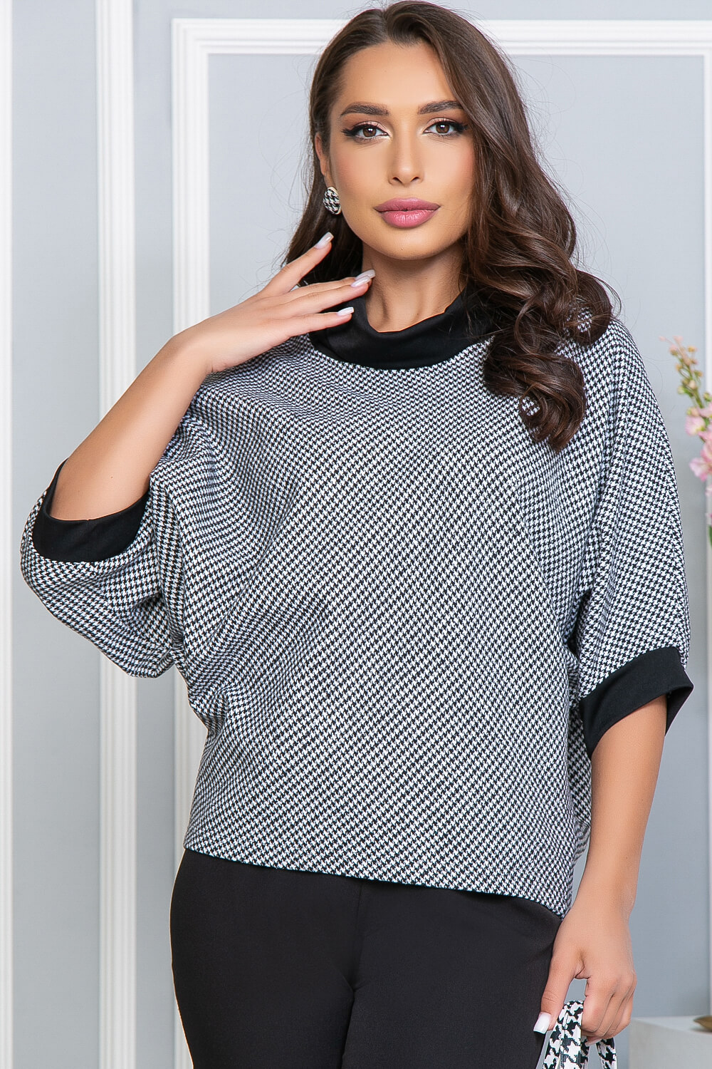Джемпер из плотной костюмной ткани для создания стильного делового образа. Акцентом данной модели является пройма рукава - "Летучая мышь". Комфортная горловина - широкая стойка с отворотом. Спинка удлинена.