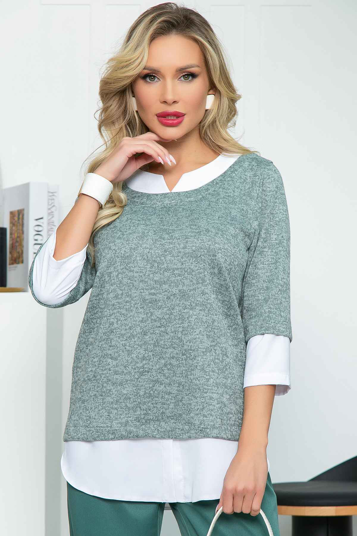Джемпер из мягкого трикотажа украсит ваш повседневный образ и сделает его максимально комфортным. Сочетание двух видов ткани создаёт эффект многослойного образа. Джемпер прекрасно подойдёт для создания повседневного и офисного образа.