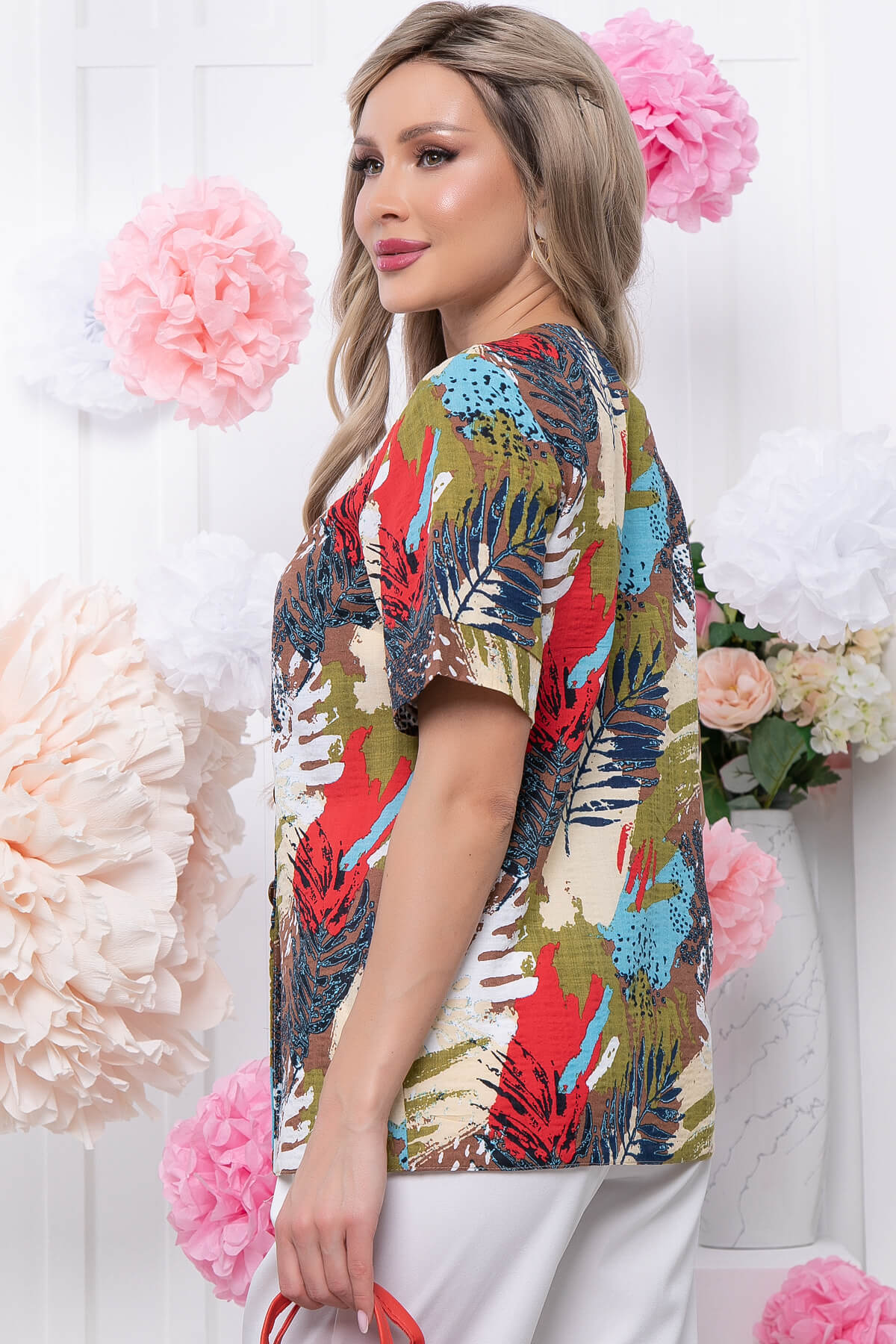 Легкие летние блузы гармонично подойдут на каждый день. Такая блуза будет отлично смотреться с джинсами и кедами. Изделие дополняют акцентные кокосовые пуговицы. Рукав укороченный, втачной.