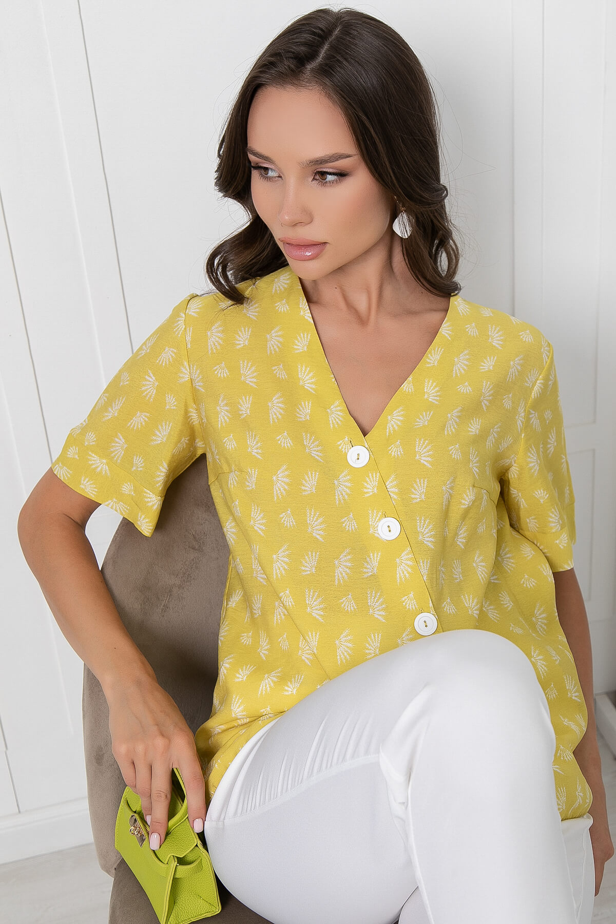 Легкие летние блузы гармонично подойдут на каждый день. Такая блуза будет отлично смотреться с джинсами и кедами. Изделие дополняют акцентные кокосовые пуговицы. Рукав укороченный, втачной.