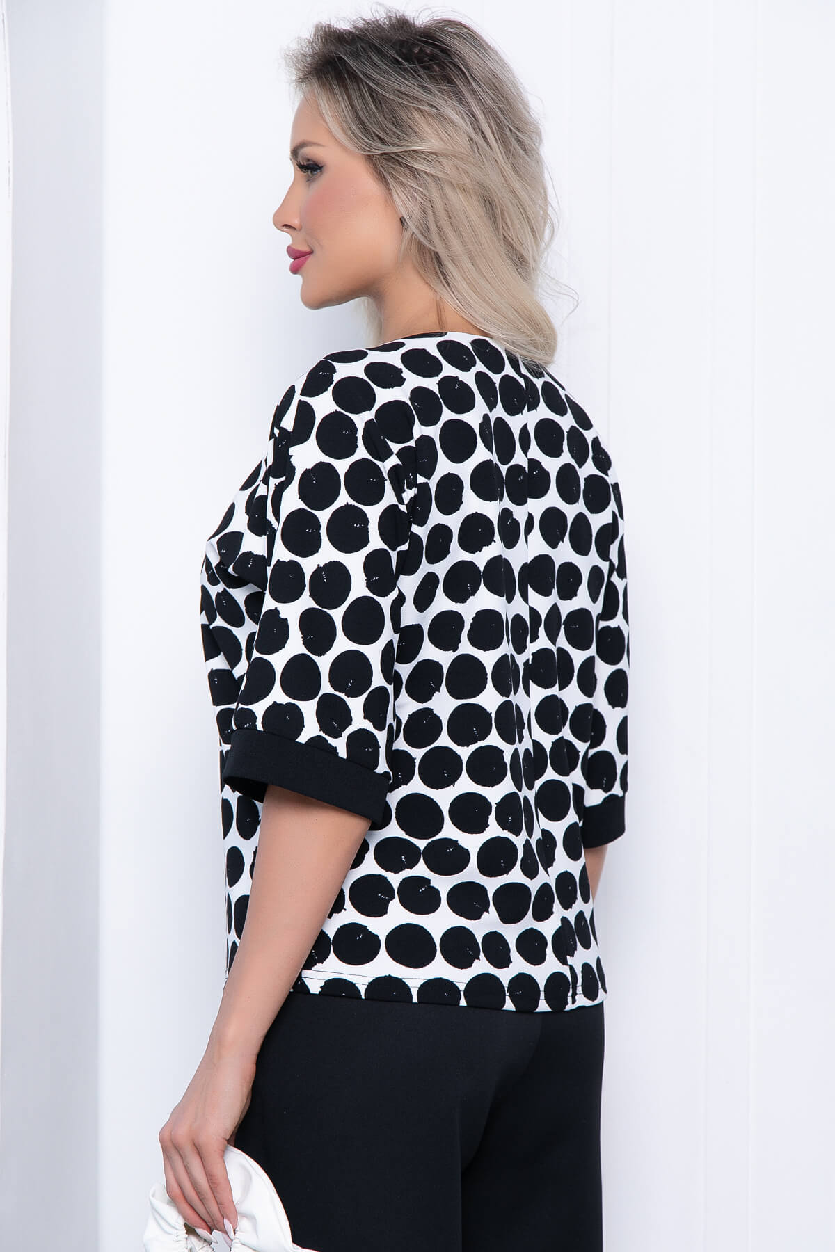 Очаровательная блуза свободного кроя из трикотажа - настоящая находка в прохладную погоду! Она отлично смотрится с джинсами, брюками и даже юбками! Рукав три четверти, цельнокроенный, обработан манжетом.