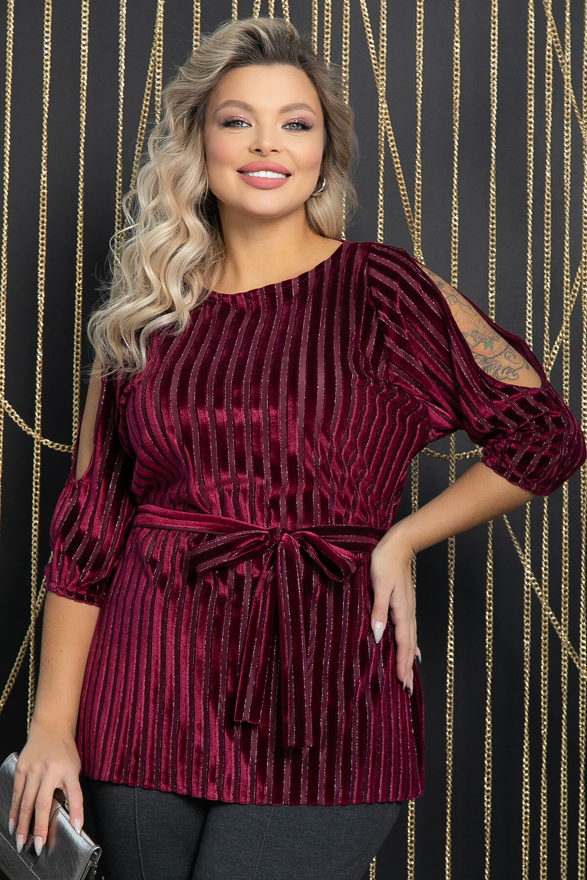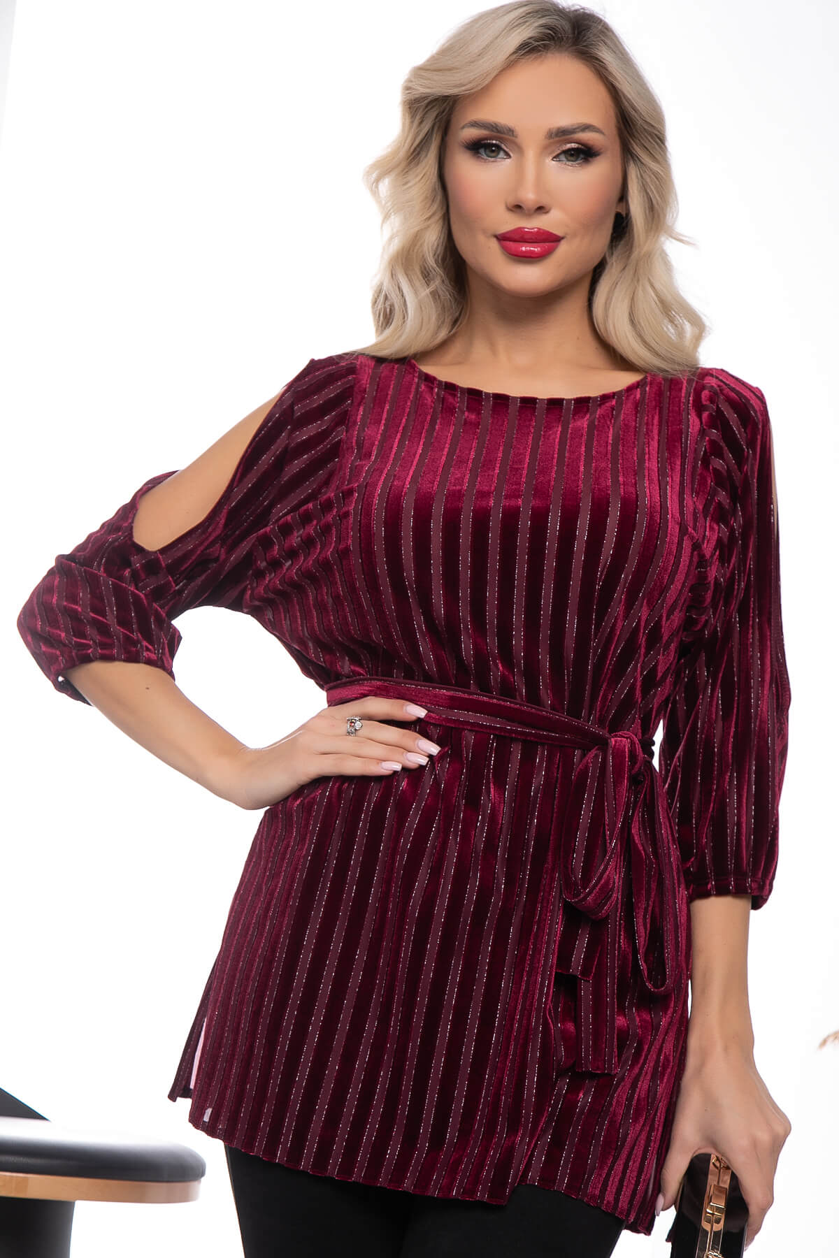 Туника для создания стильного праздничного образа. Такая модель будет интересно смотреться в сочетании с прилегающим низом. Украшением модели служат рукава с вырезами, которые и не открывают полностью руку, и слегка приоткрывают плечи. По бокам туники есть разрезы, в комплект входит пояс из основной ткани.