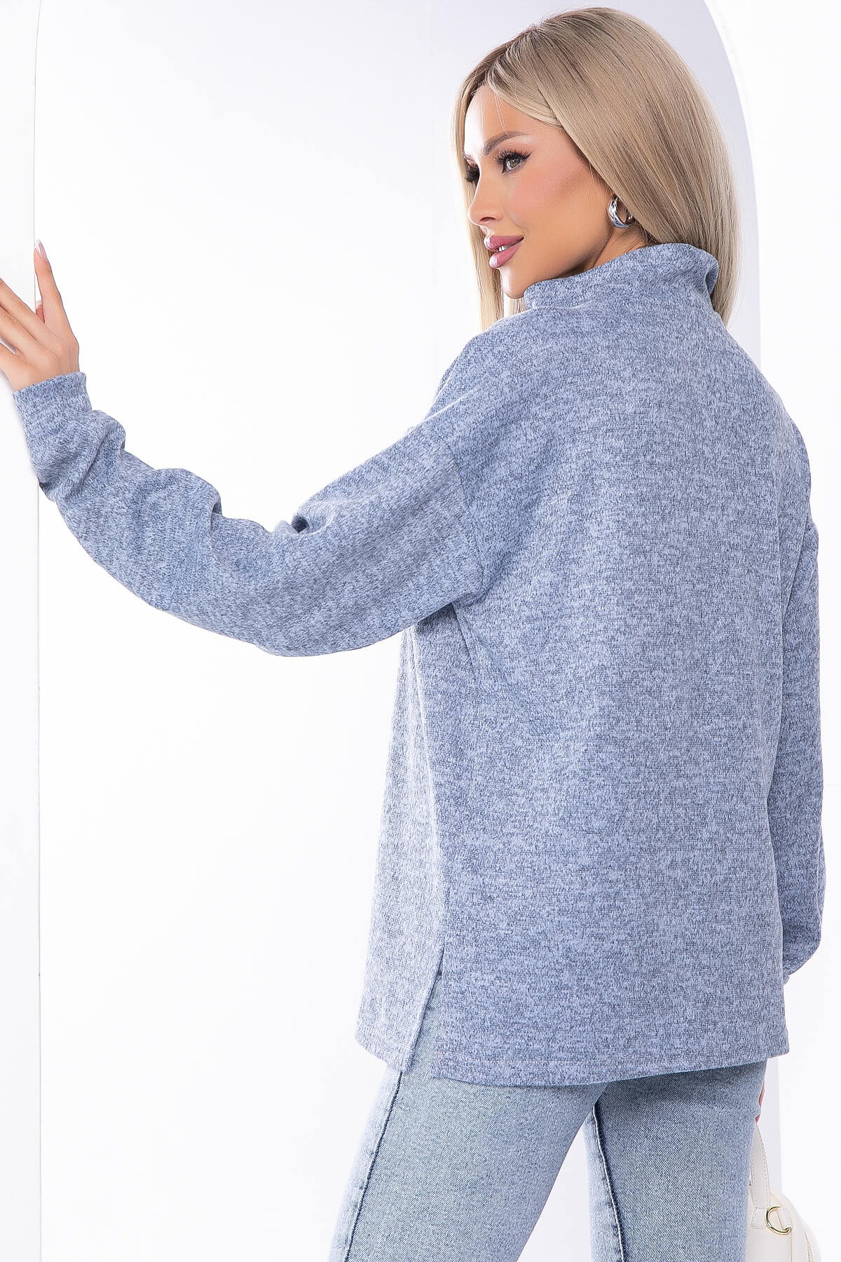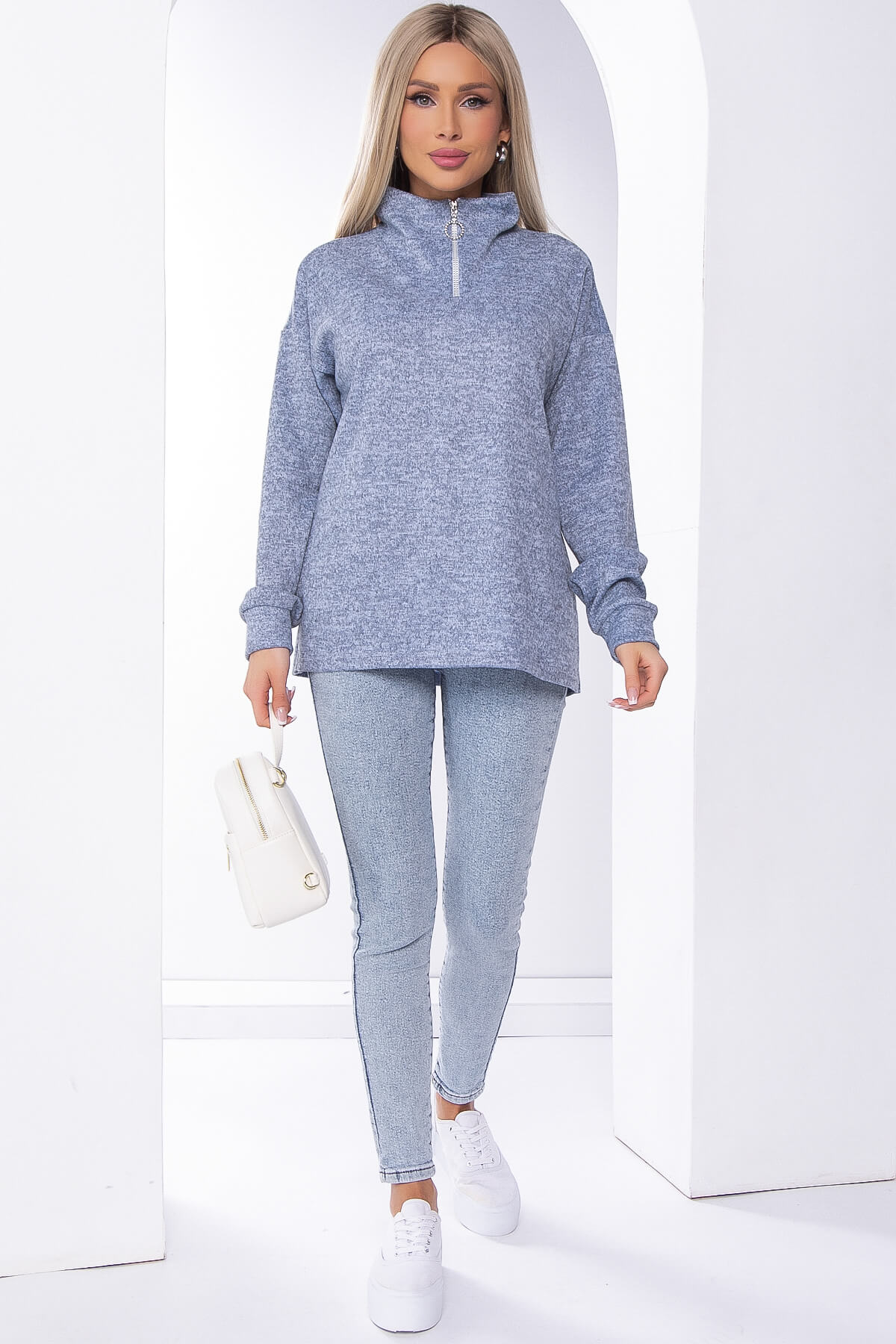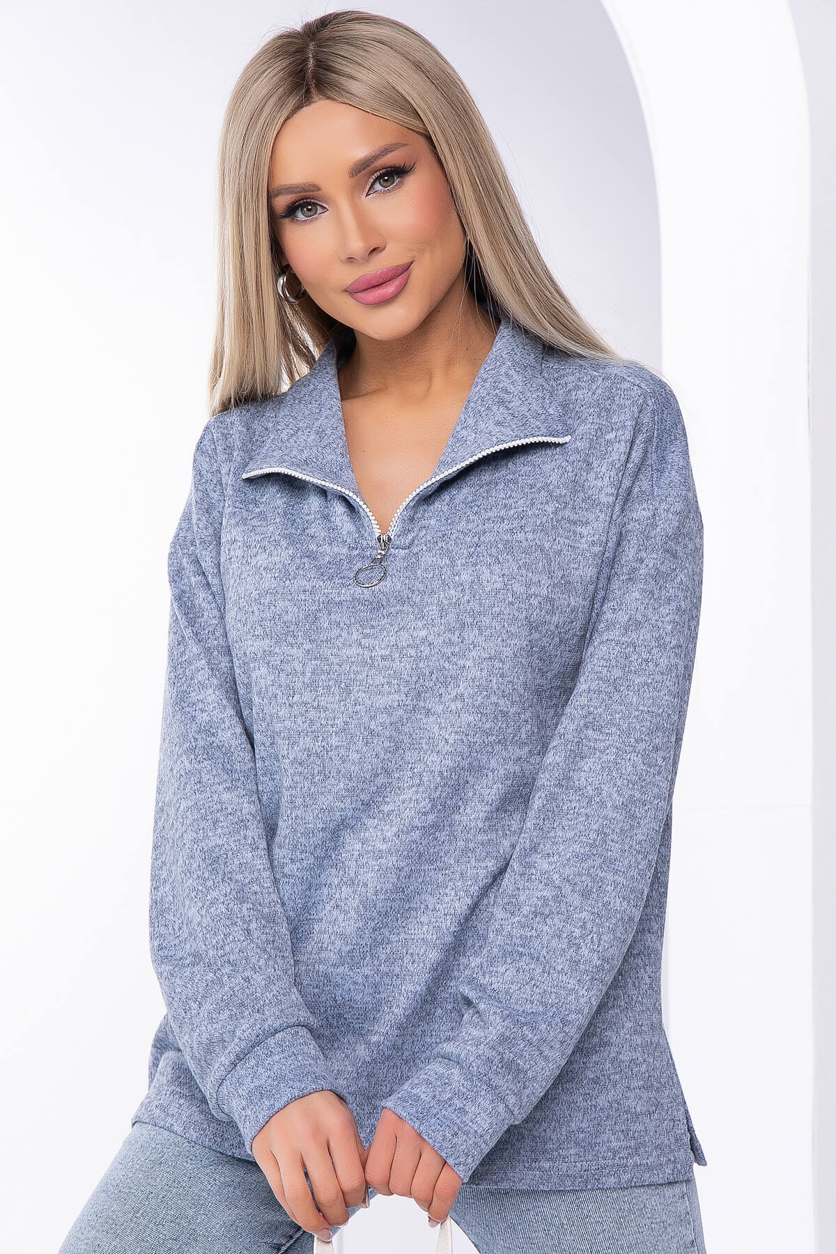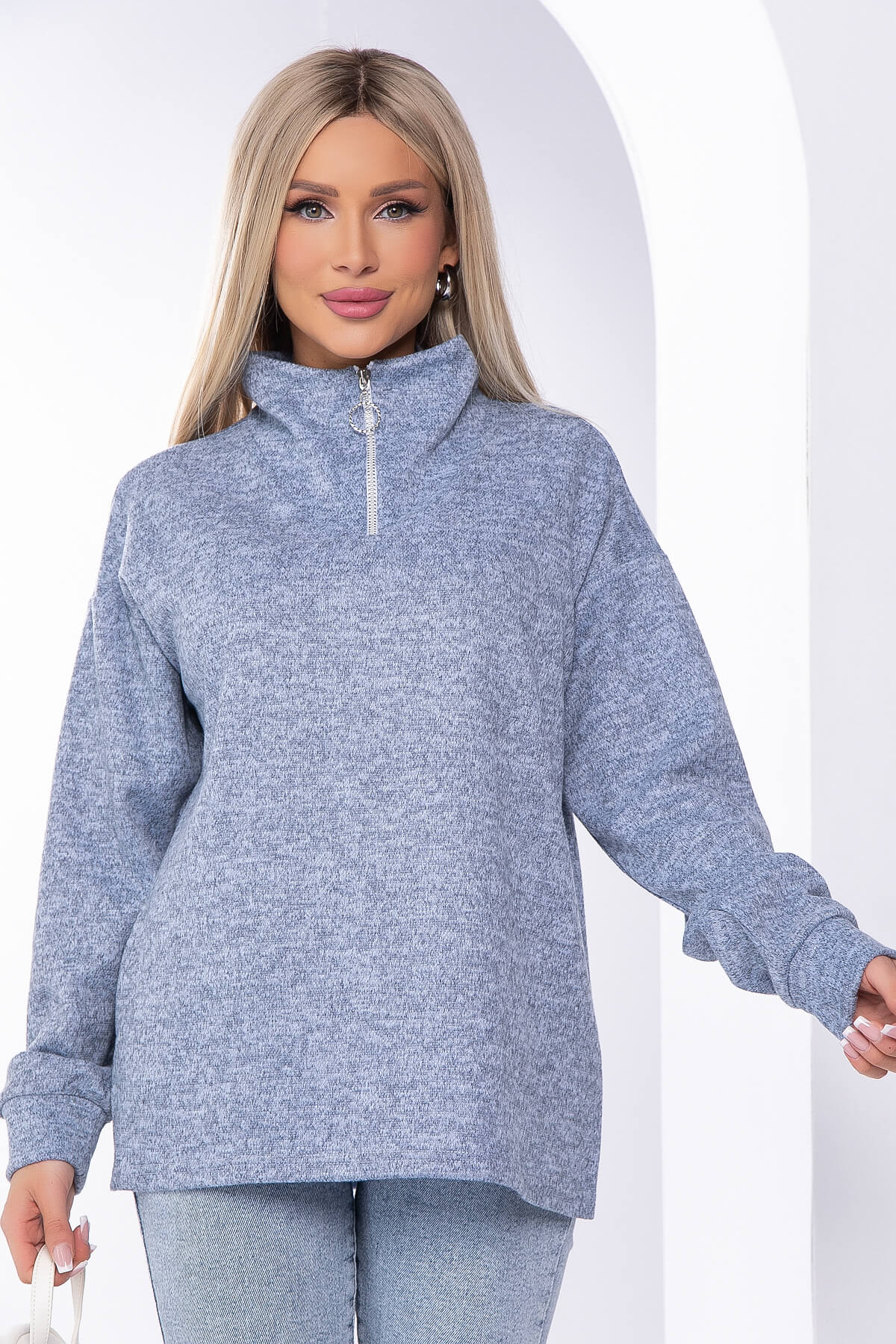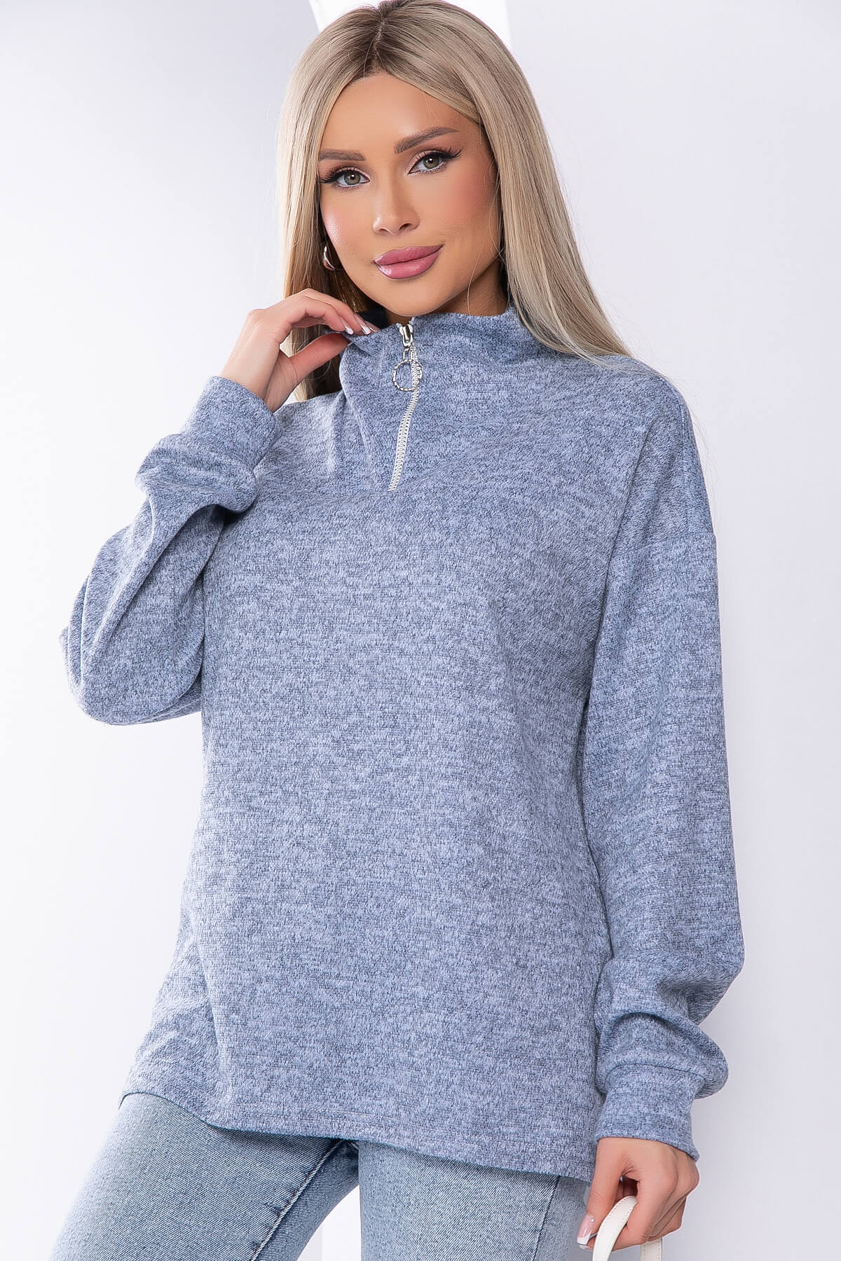 Универсальная модель джемпера, которая прекрасно подойдёт для повседневных образов. Длинный рукав на манжетах и воротник-стойка на молнии подарит дополнительный комфорт при ношении. Изделие отлично смотрится с брюками или джинсами.