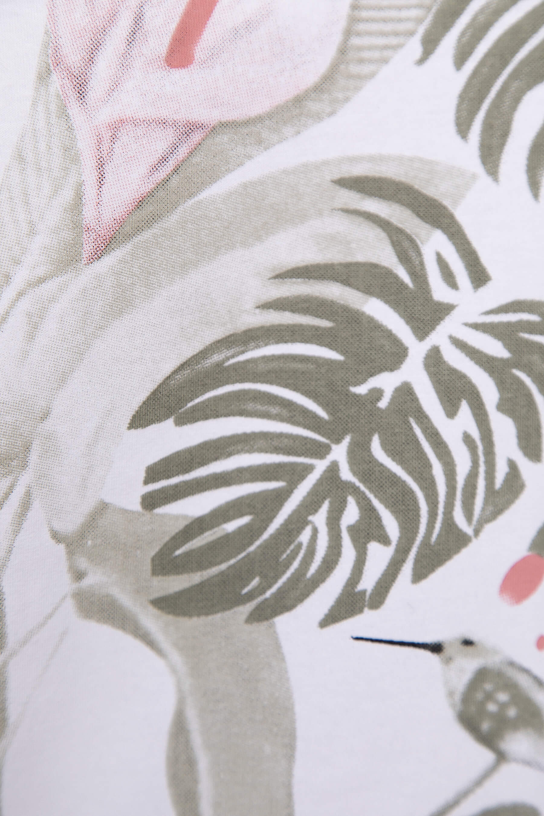 Футболка спереди украшена тропическим принтом, спинка однотонная. Идеально сочетается с джинсами, шортами и леггинсами.