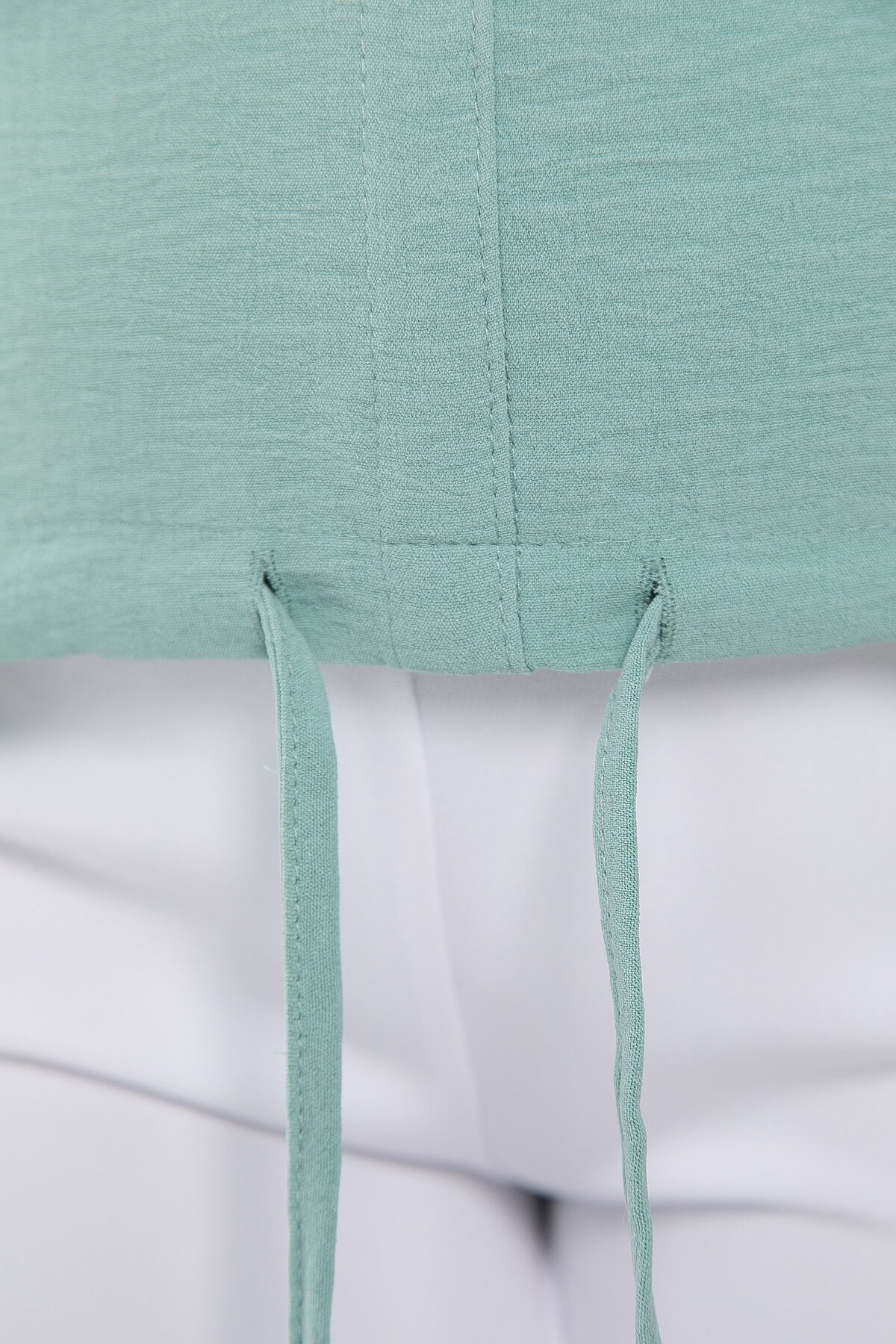 Туника нежного мятного цвета, которая прекрасно смотрится в повседневной жизни. Вороник рубашечного типа на стойке. По низу изделия шнурок из основной ткани. Подвеска в комлекте.