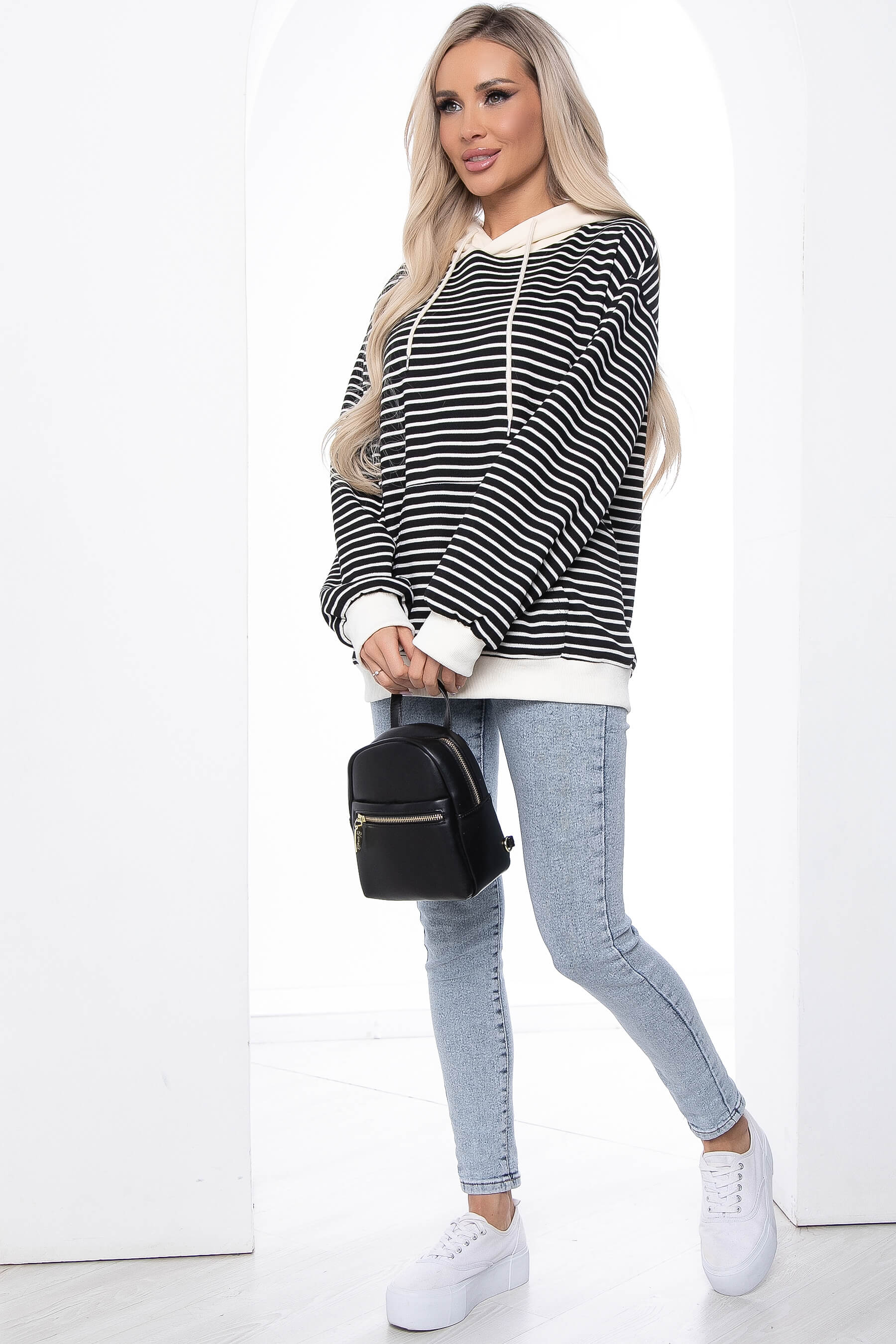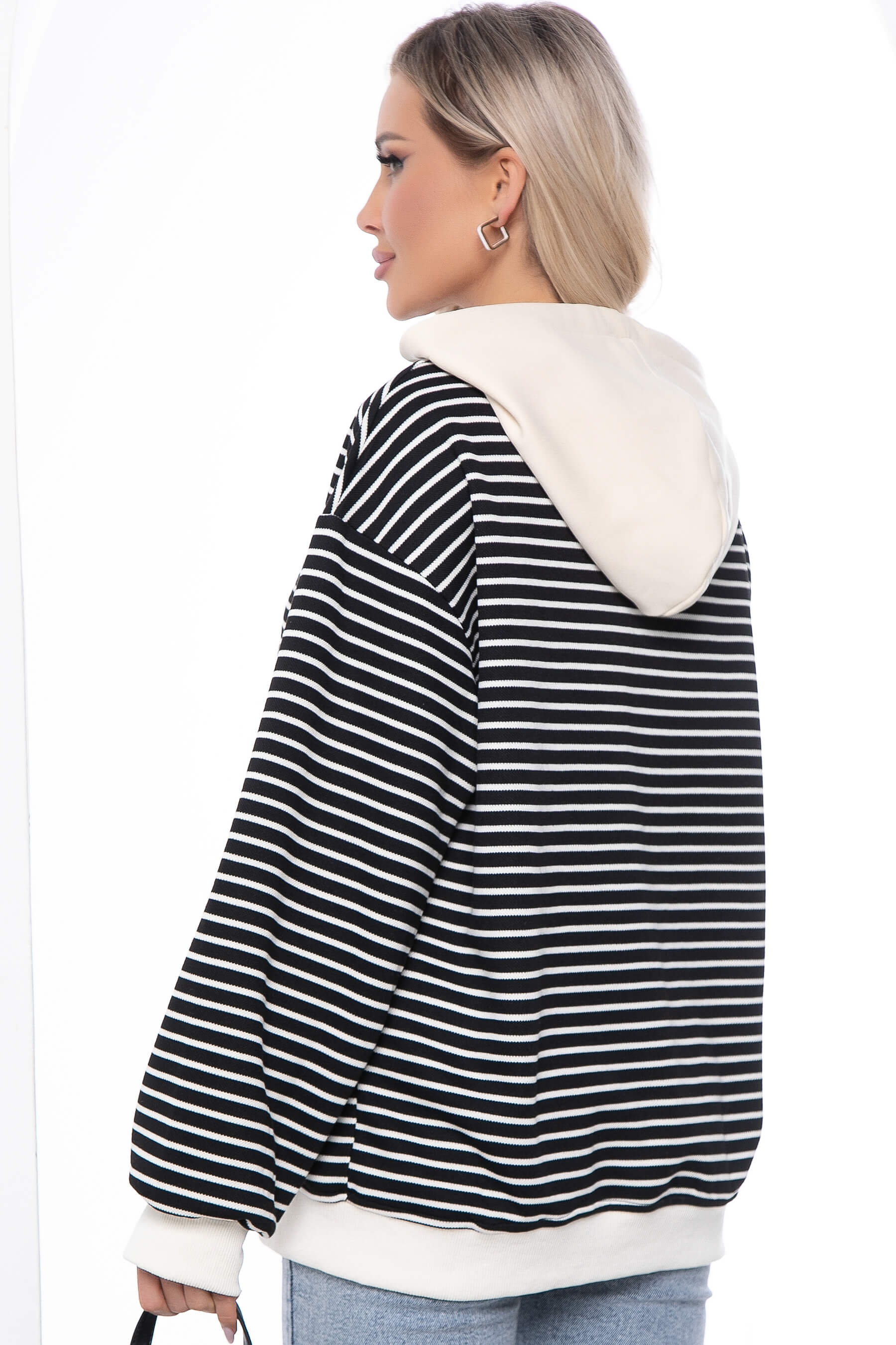Трикотажное худи в полоску с капюшоном стильное и универсальное решение для вашего гардероба. Сочетать его можно с классическими брюками, с кожаными штанами, с базовыми джинсами, и с женственными юбками.