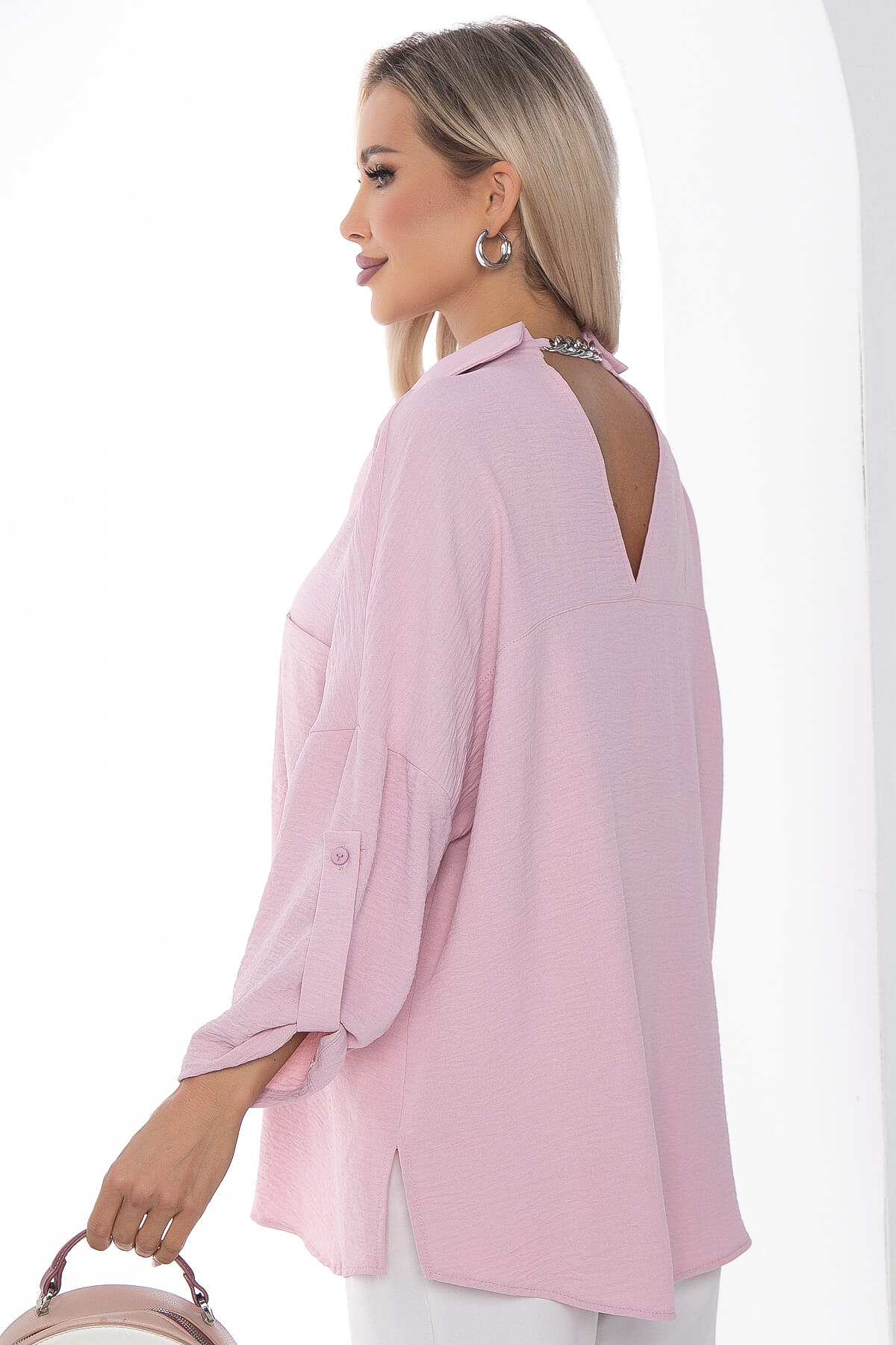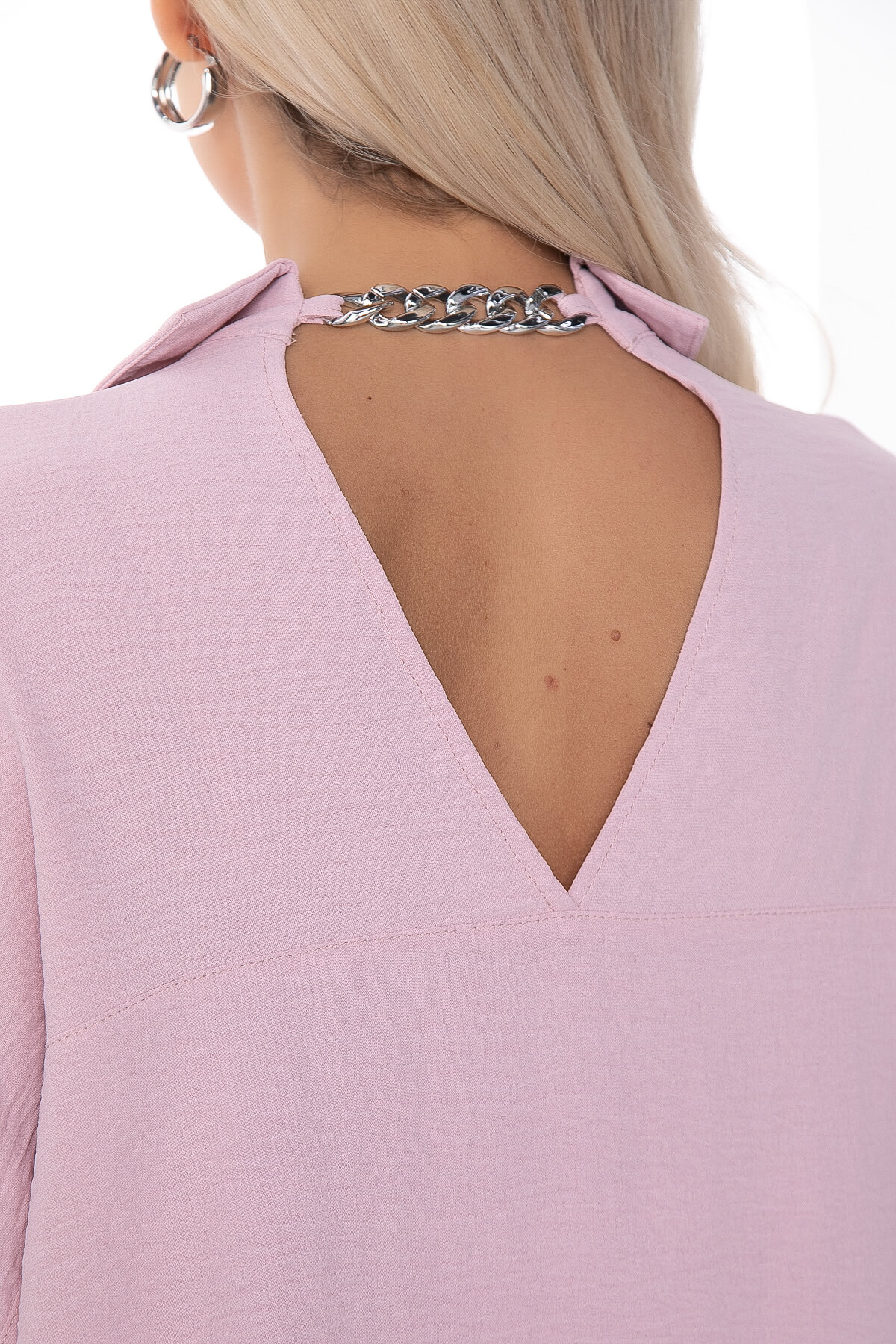 Лёгкая рубашка свободного кроя вс акцентной спинкой. Классический отложной воротник по переду, по спинке украшен цепочкой серебряного цвета. Рукав втачной, 7/8, на пате. По бокам есть разрезы. Такая рубашка подойдёт для создания стильного летнего образа и будет гармонично смотреться в сочетаниях с джинсами, шортами и брюками.