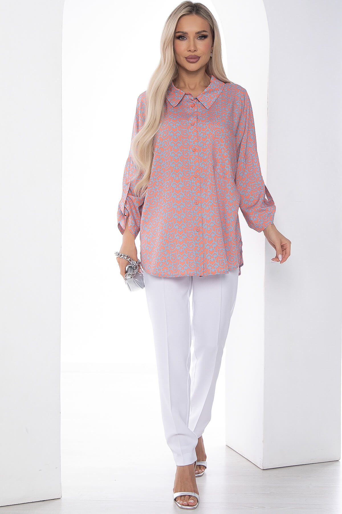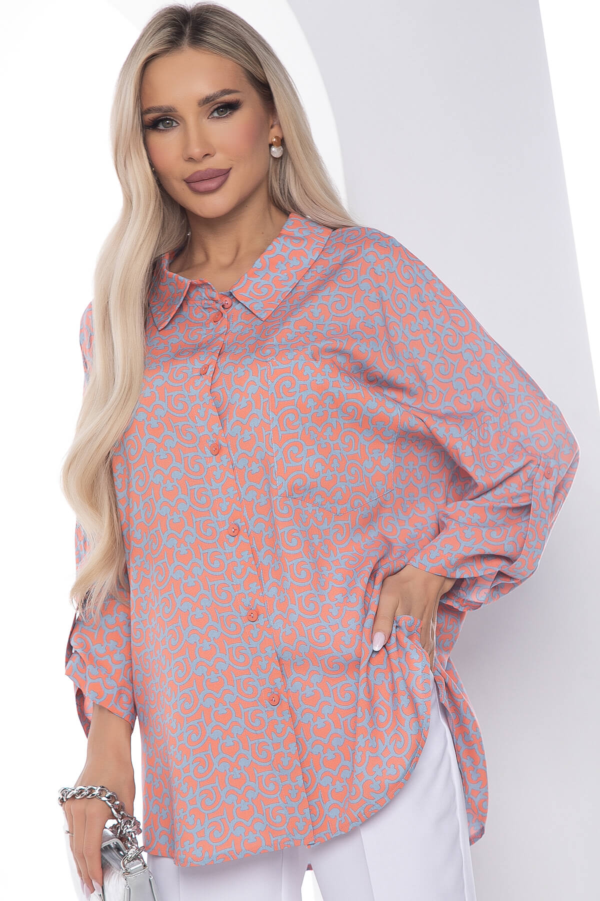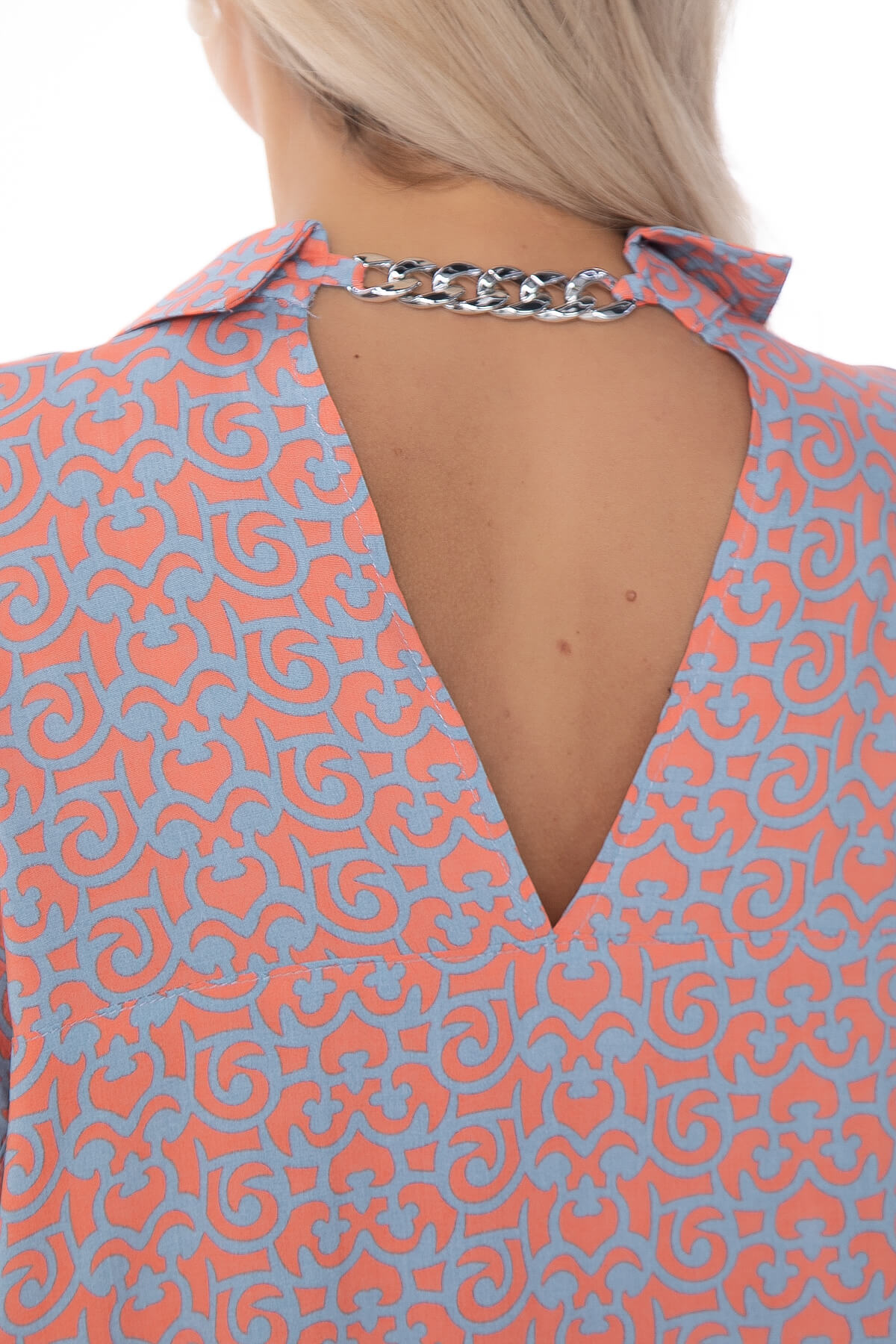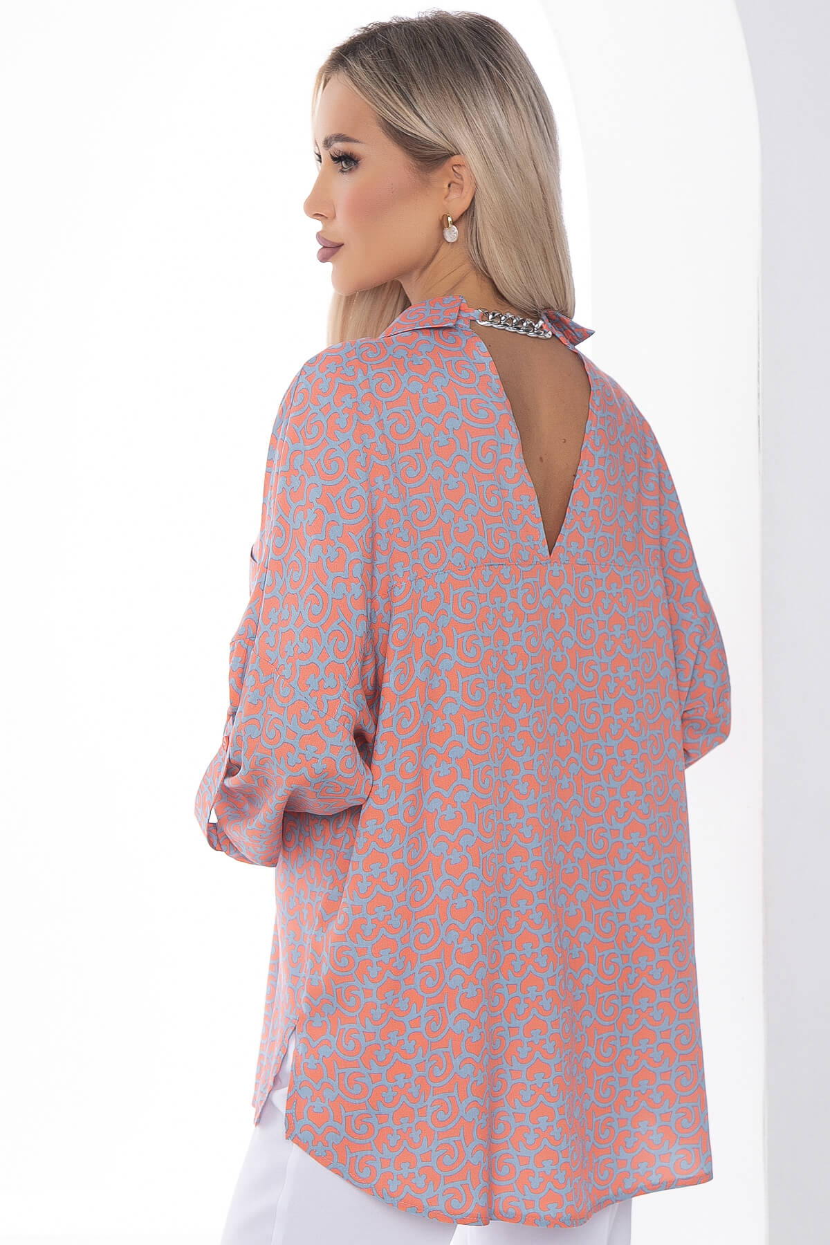 Лёгкая рубашка свободного кроя с акцентной спинкой. Классический отложной воротник по переду, по спинке украшен цепочкой серебряного цвета. Рукав втачной, 7/8, на пате. По бокам есть разрезы. Такая рубашка подойдёт для создания стильного летнего образа и будет гармонично смотреться в сочетаниях с джинсами, шортами и брюками.