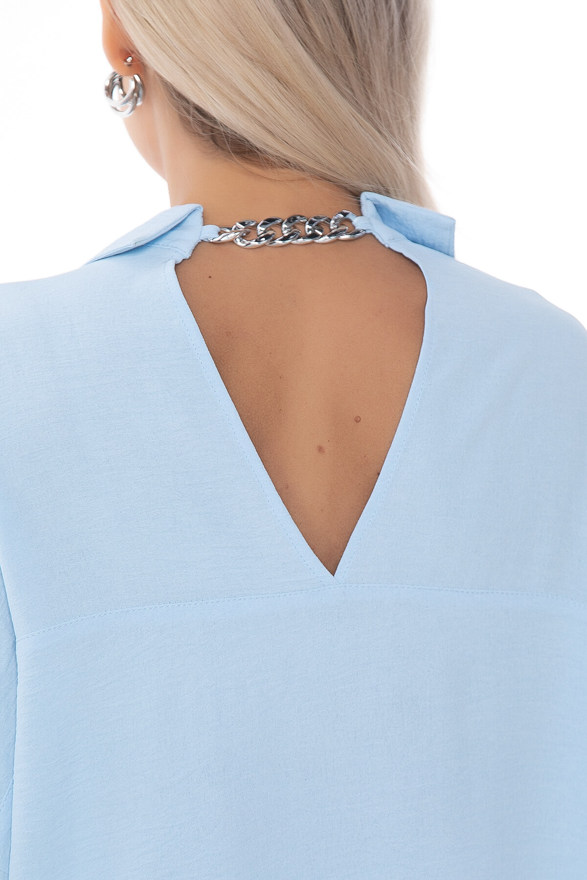 Лёгкая рубашка свободного кроя вс акцентной спинкой. Классический отложной воротник по переду, по спинке украшен цепочкой серебряного цвета. Рукав втачной, 7/8, на пате. По бокам есть разрезы. Такая рубашка подойдёт для создания стильного летнего образа и будет гармонично смотреться в сочетаниях с джинсами, шортами и брюками.