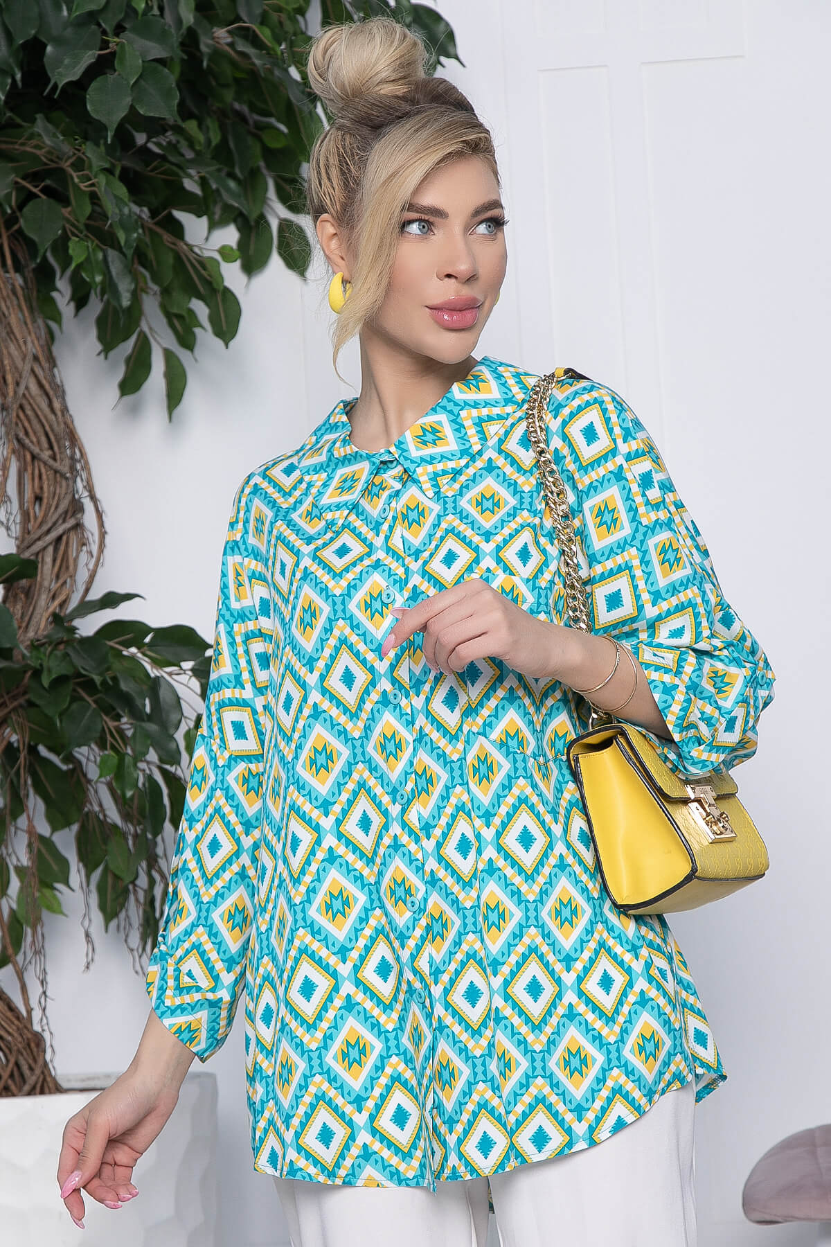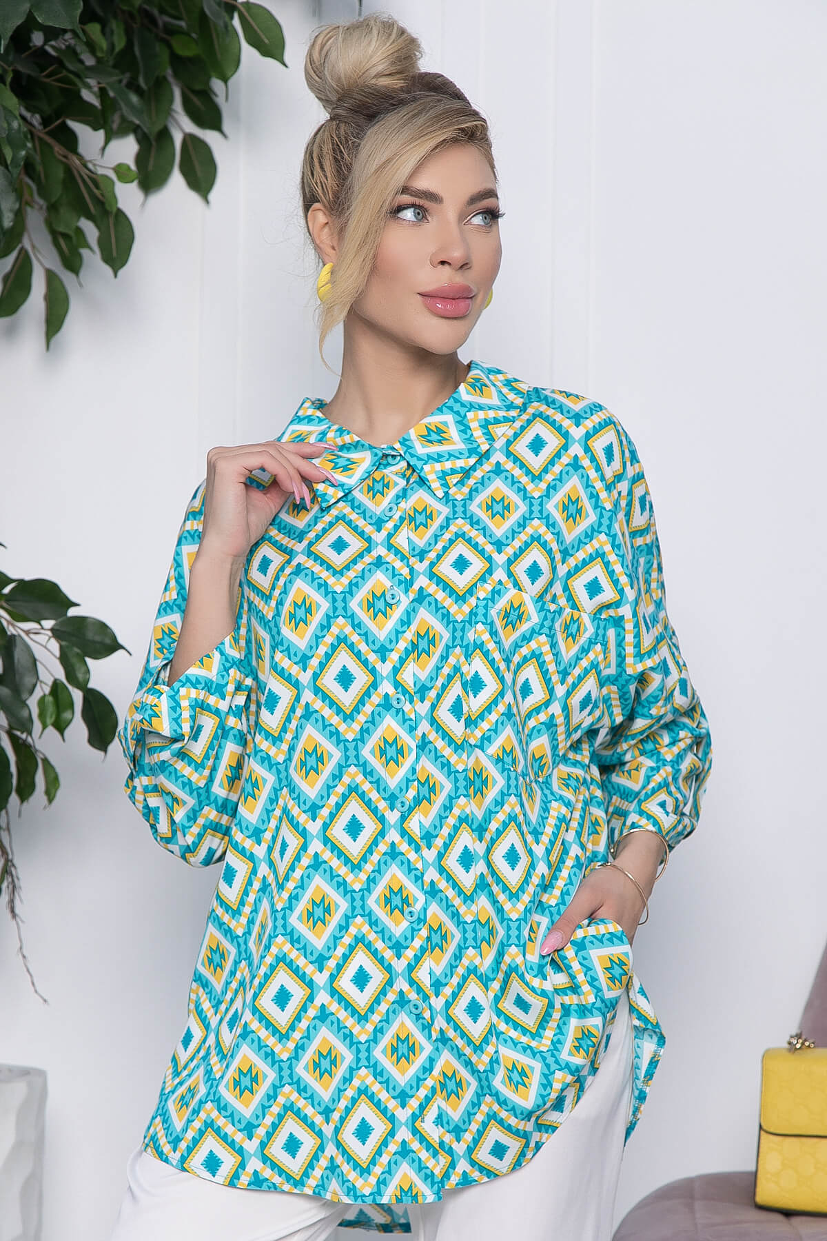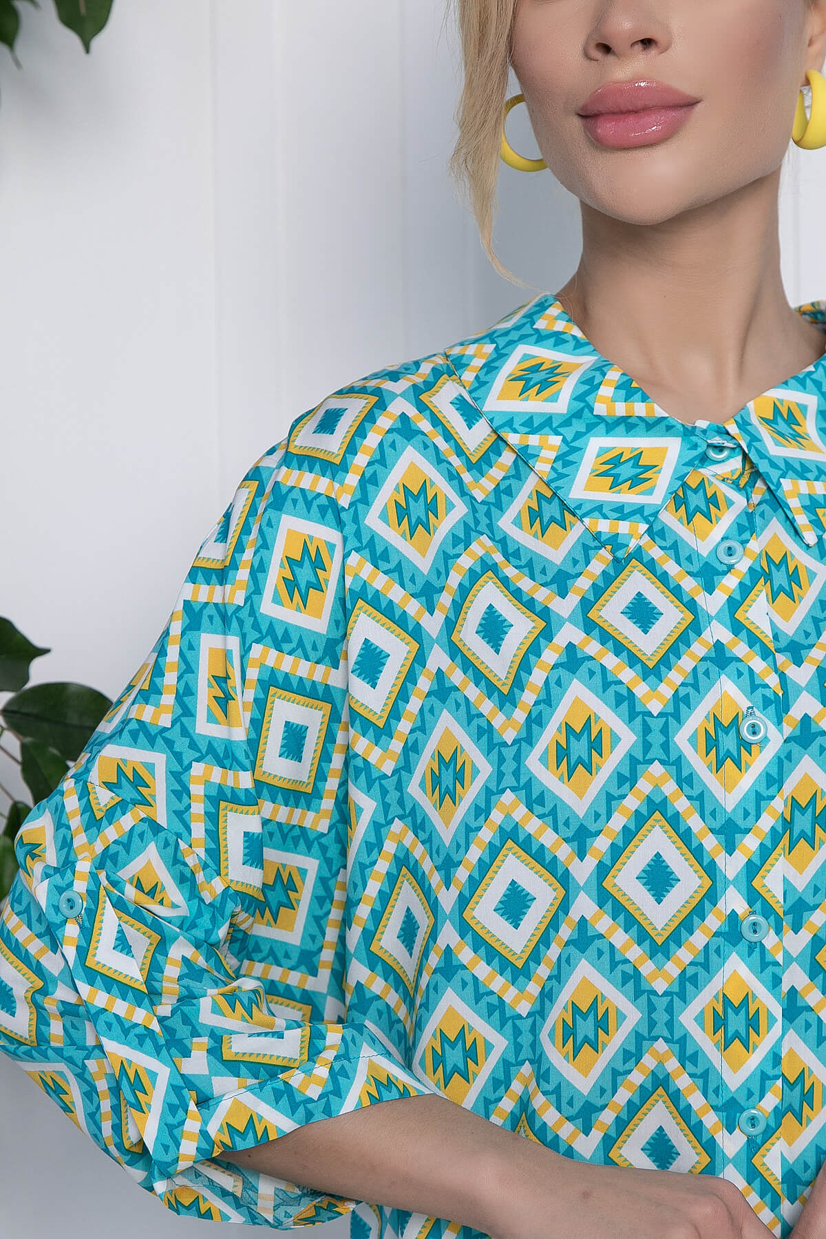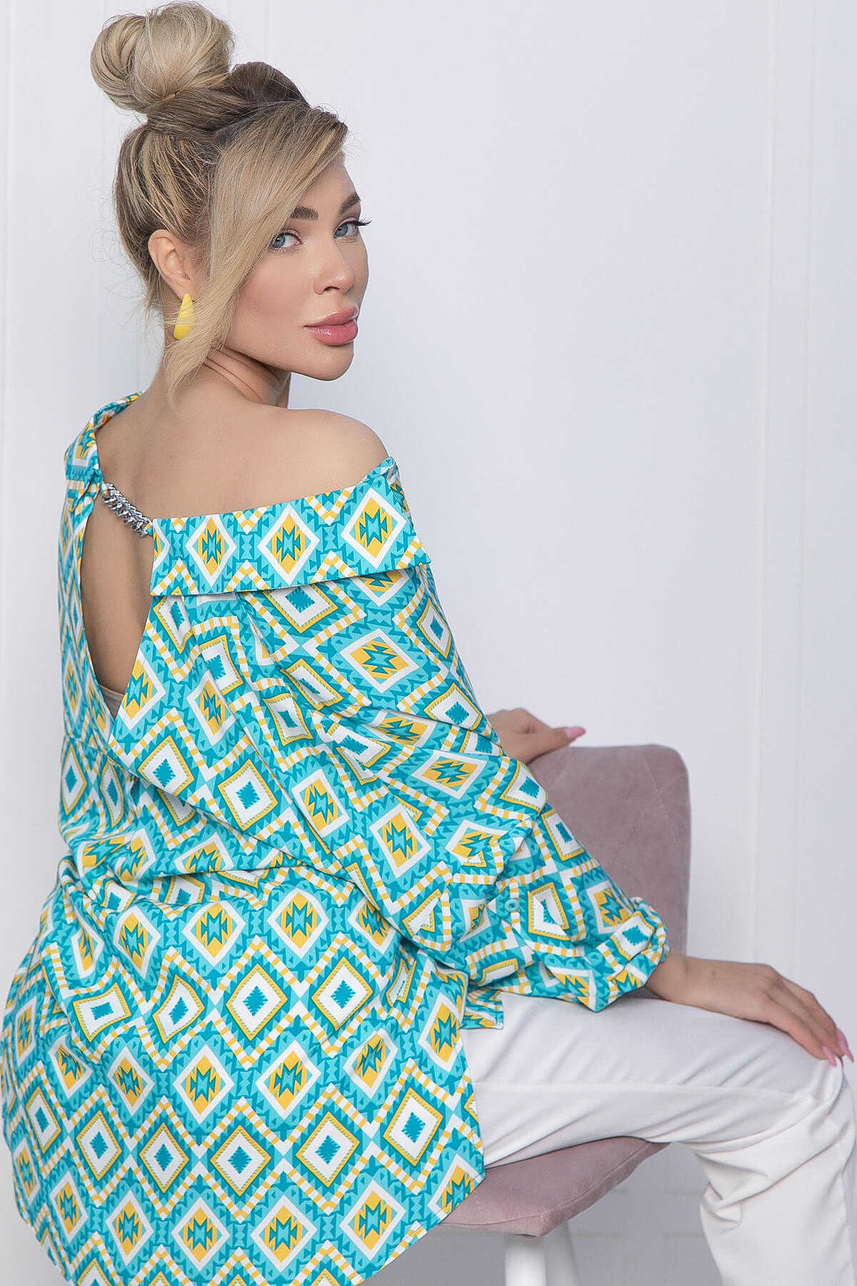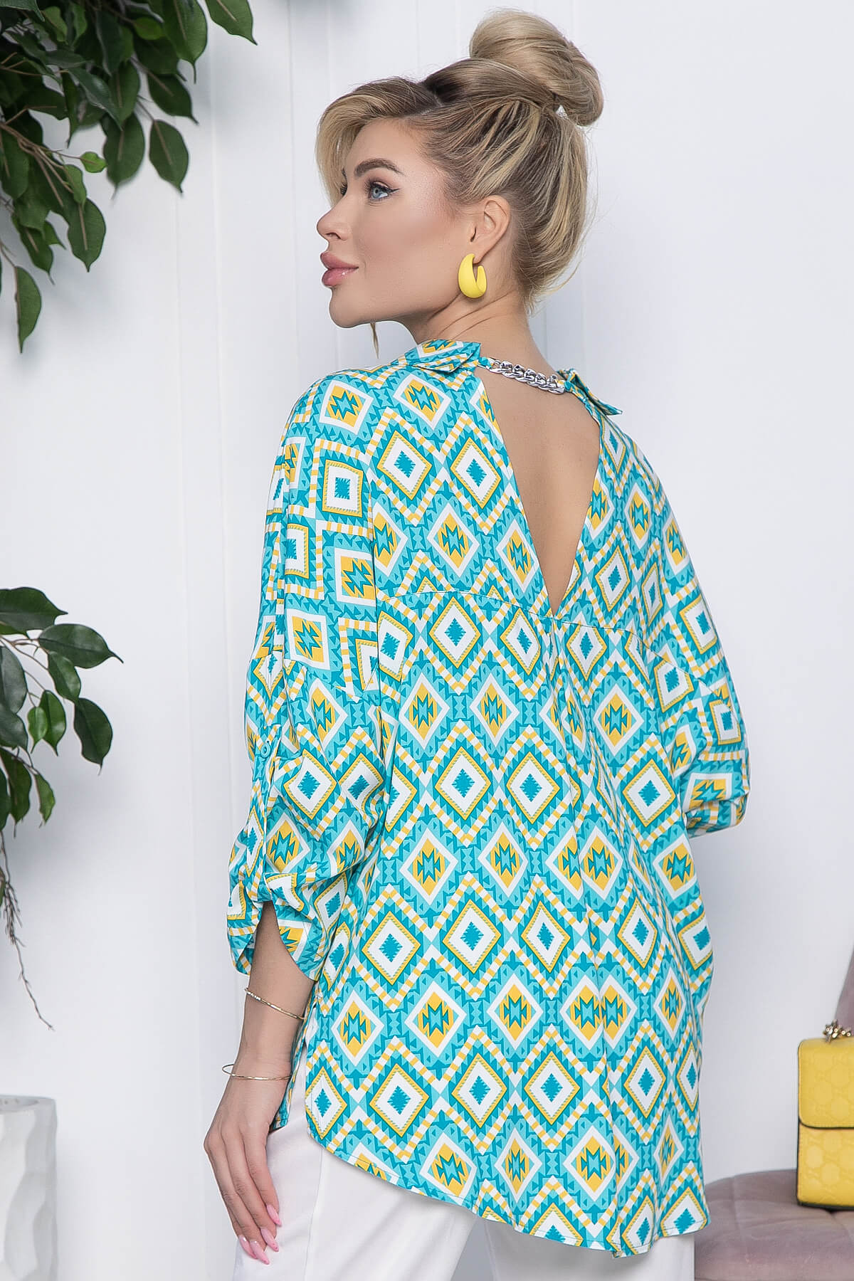 Лёгкая рубашка свободного кроя с акцентной спинкой. Классический отложной воротник по переду, по спинке украшен цепочкой серебряного цвета. Такая рубашка подойдёт для создания стильного летнего образа и будет гармонично смотреться в сочетаниях с джинсами, шортами и брюками.