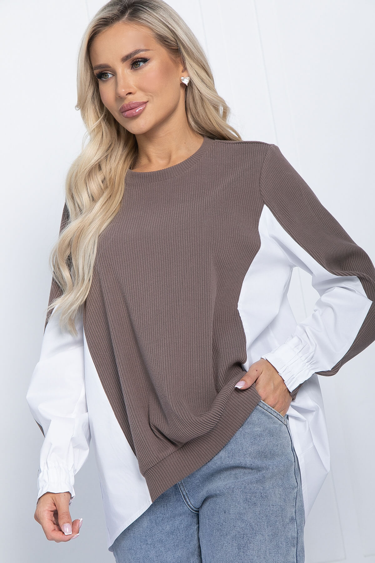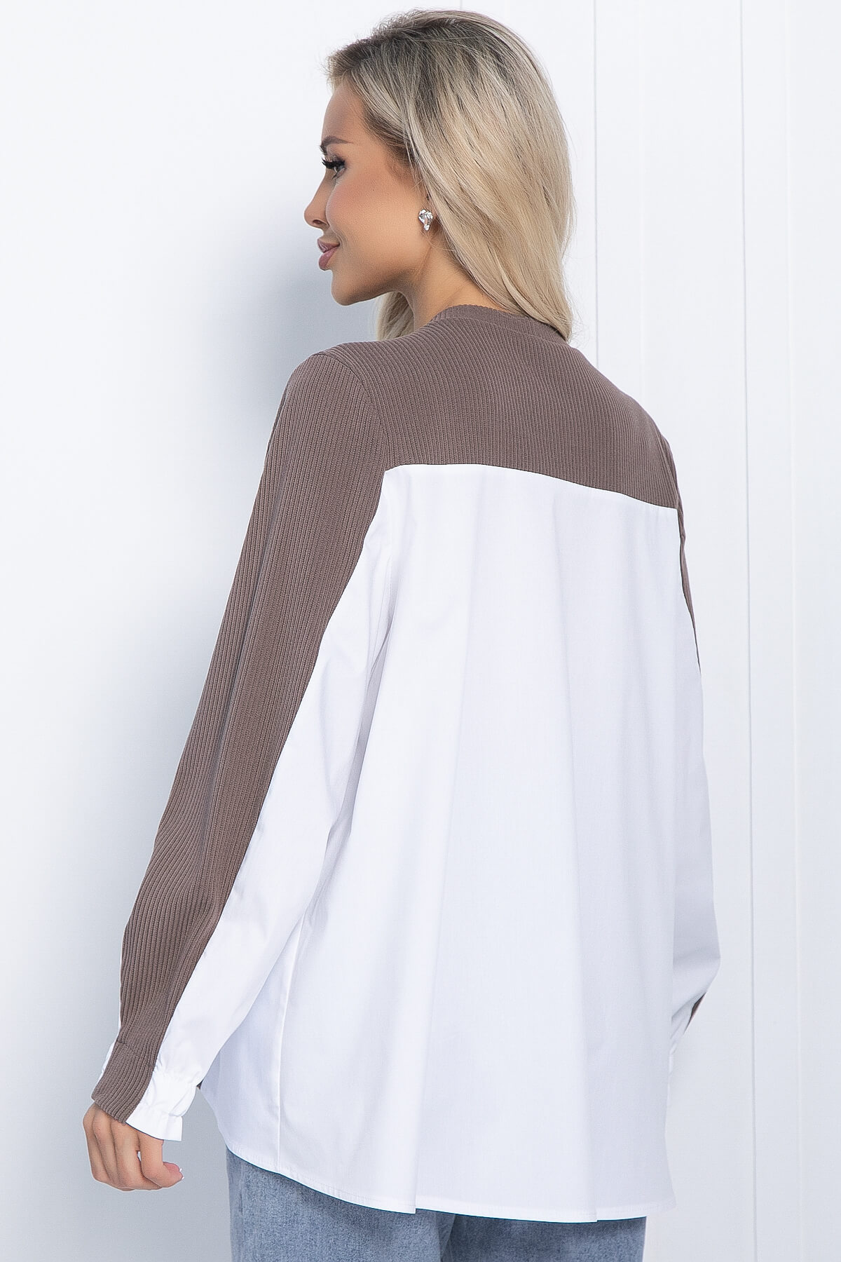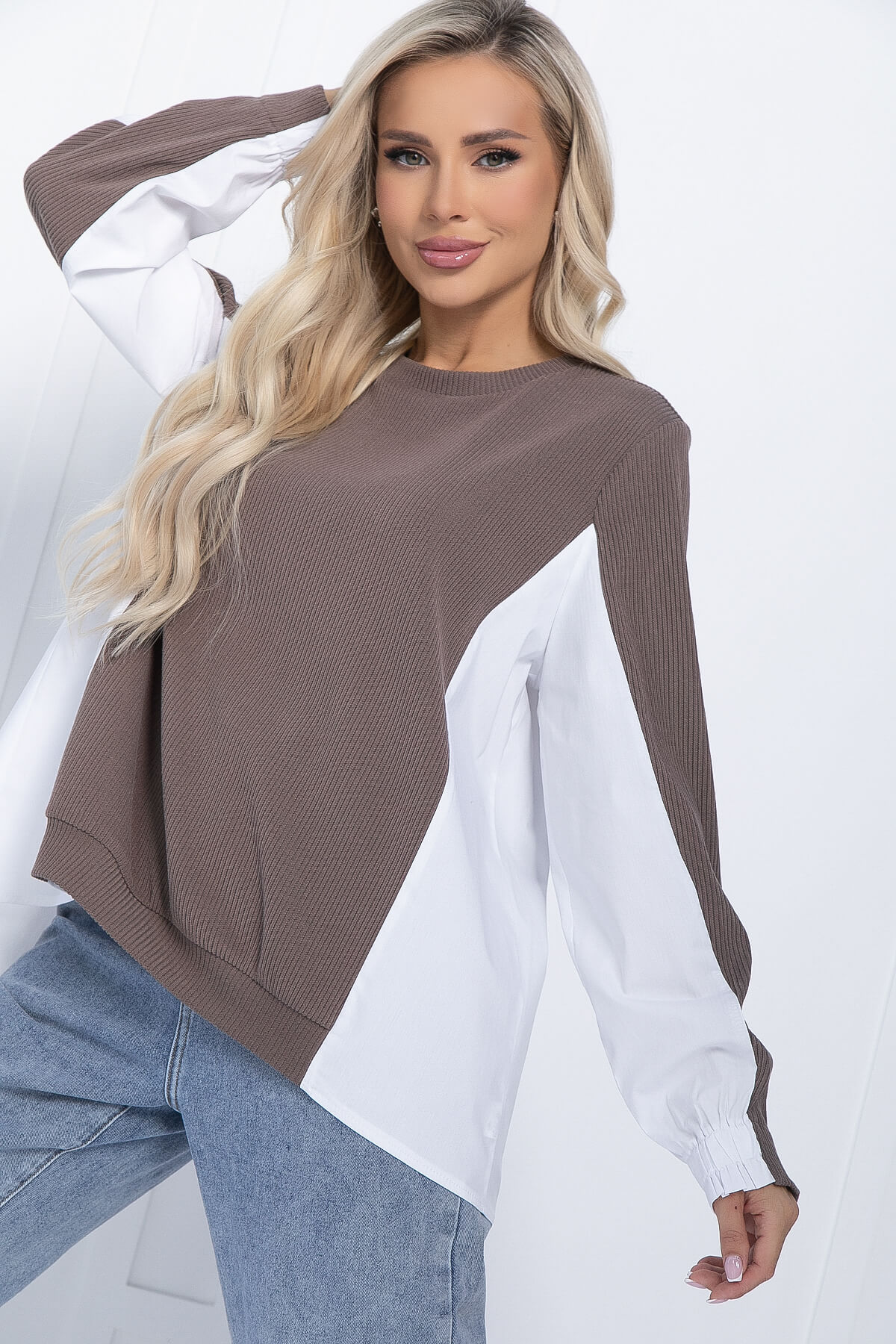 Оригинальный комбинированный джемпер - перед и часть рукава выполнены из трикотажа «Лапша», спинка и рукава сзади из рубашечной ткани. Округлая горловина, спинка удлиненная. Хорошо стилизуется с классическими брюками или зауженными джинсами.
