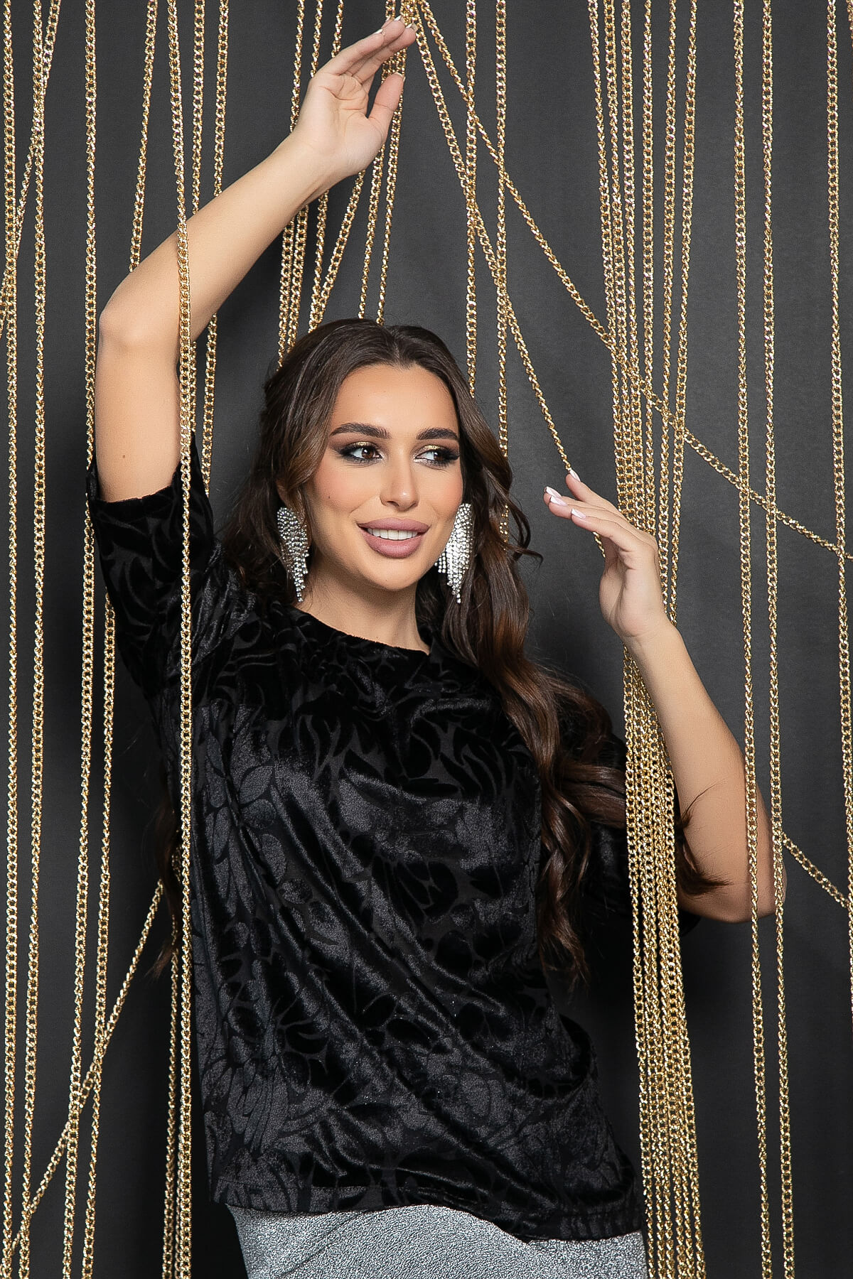 Модель выполнена из мягкого и приятного к телу панбархата, отличается комфортом и удобством в носке. Благодаря необычному дизайну, эта блузка выглядит празднично и привлекательно. Прекрасно сочетается как с брюками, так и с юбкой, позволяя создавать как вечерние, так и более строгие повседневные образы. Если добавить к ней пиджак, то она станет основой для создания офисного стиля. Горловина округлая. Рукава втачные.