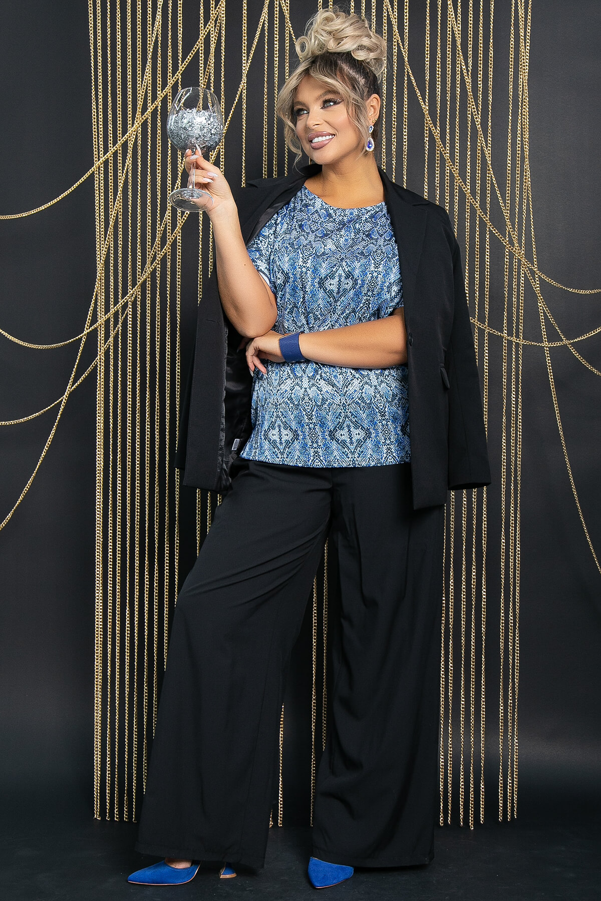 Блуза с эффектным принтом станет отличным дополнением в вашем гардеробе! Её легко сочетать с брюками, джинсами или юбкой. Также можно надеть под пиджак или жакет. Модель свободного кроя с цельнокроеным рукавом и округлым вырезом. Она подходит для повседневных образов и для домашнего использования. Благодаря своему свободному крою она обеспечит комфорт и свободу движения. Длина переда короче.