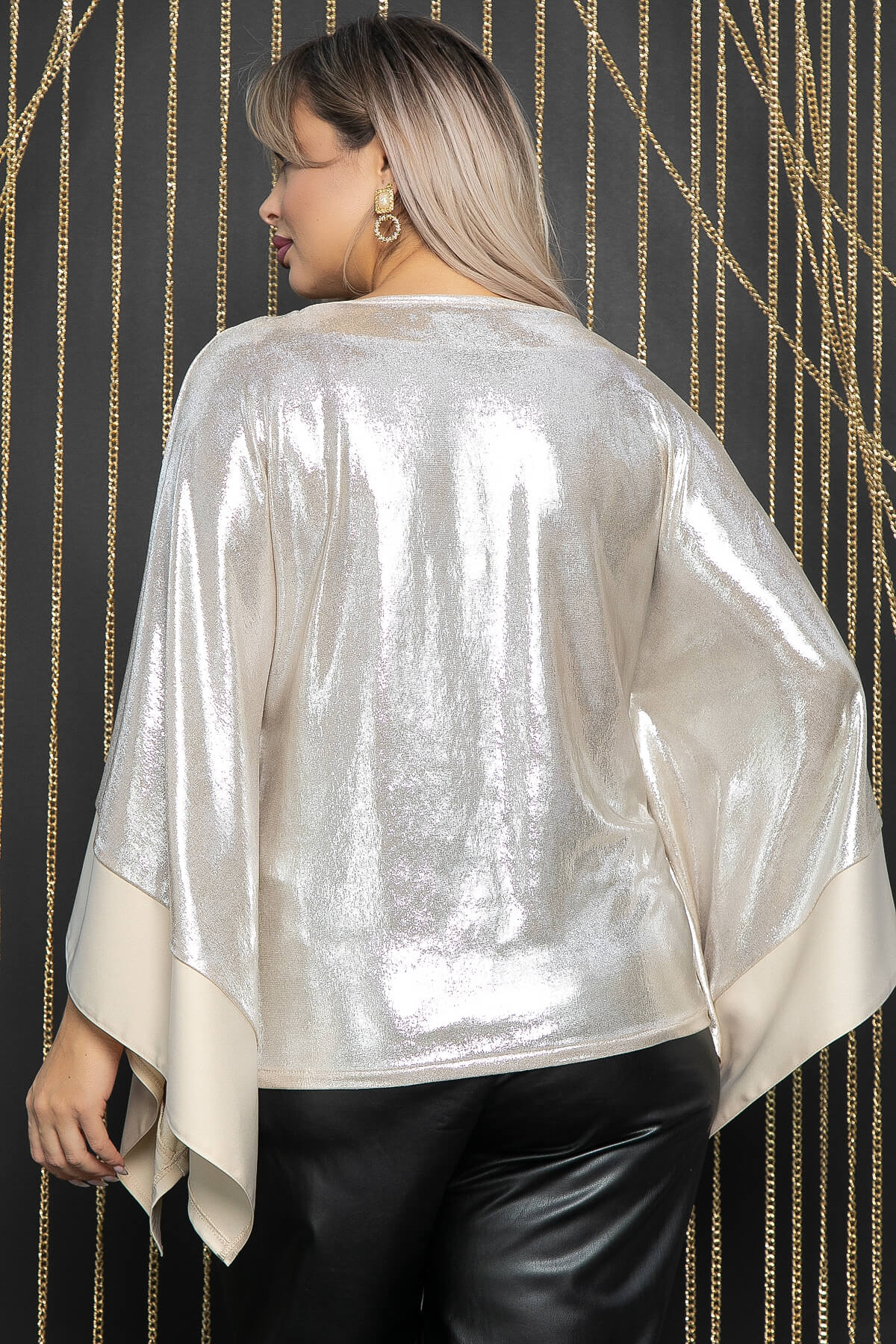 Нарядная блузка-кимоно Дидже из трикотажа «Масло» с эффектом золотого напыления, рукав кимоно отделан мягким нежным японским шелком. Блузка из трикотажа с золотым напылением идеально подходит для торжественных мероприятий, таких как новый год, выпускной, корпоратив, день рождения или романтический вечер!