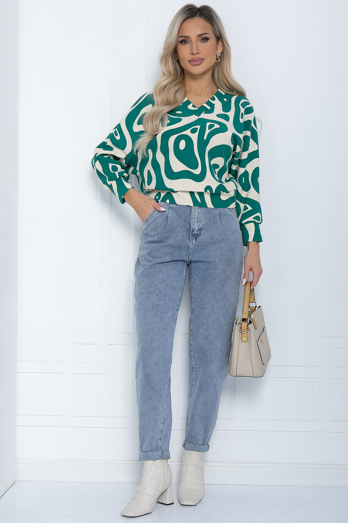Трикотажный джемпер свободного силуэта с абстрактным принтом и V-образной горловиной — идеальное сочетание комфорта и шика! Отлично подойдет для повседневной носки и будущим мамам.