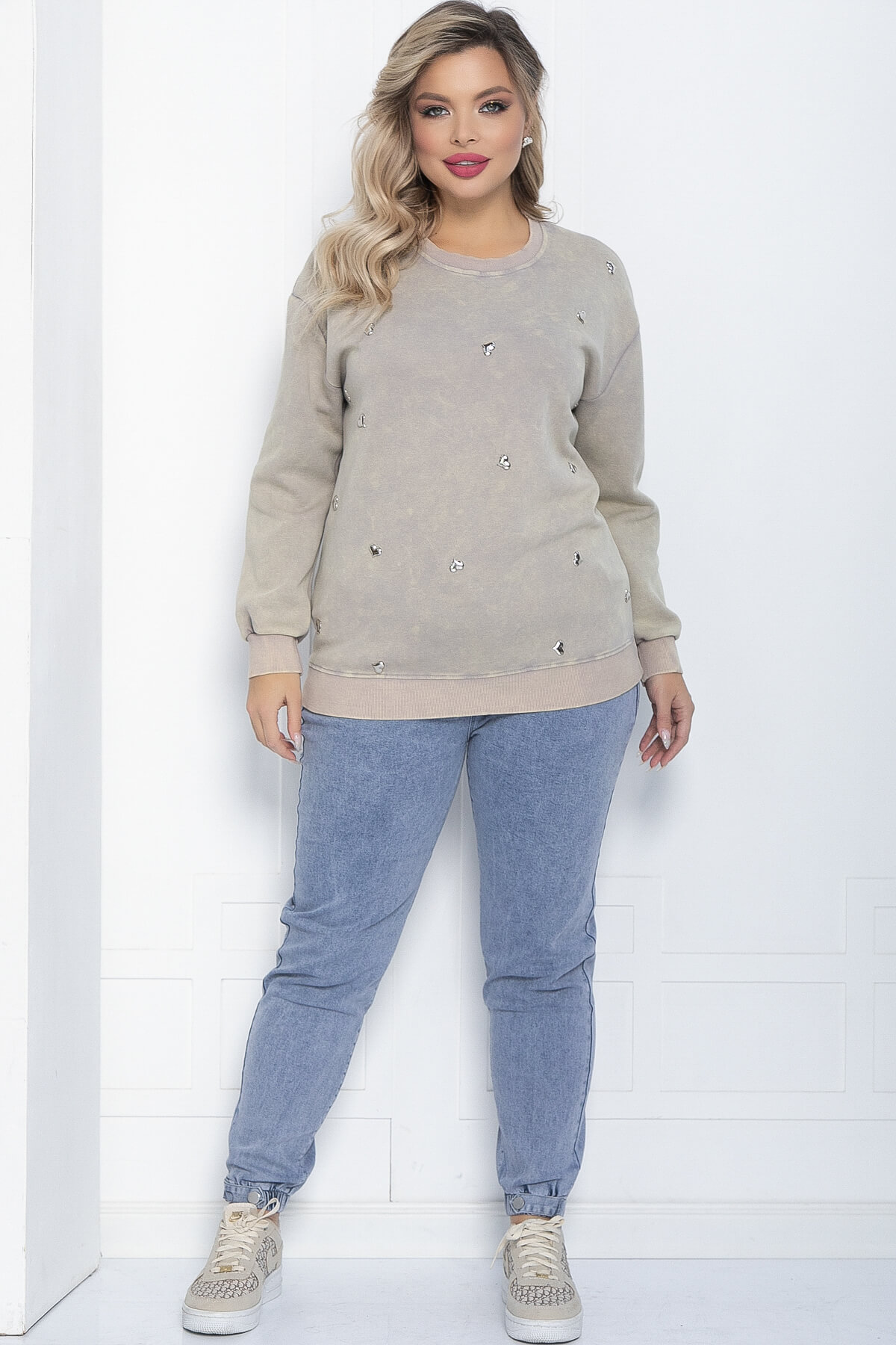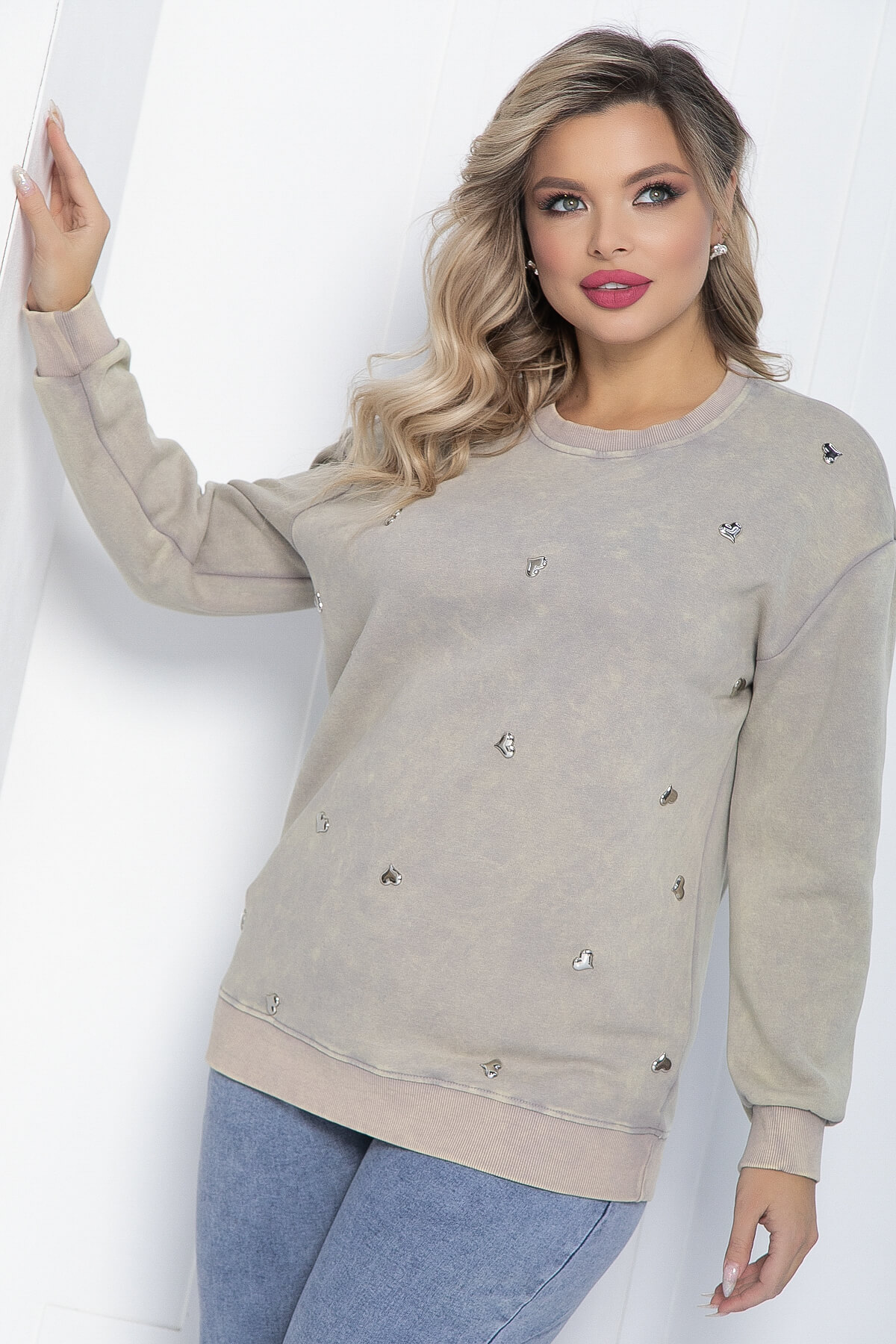 Джемпер в бежевом оттенке с эффектом «варёной» ткани обладает свободным кроем, что обеспечивает комфорт и свободу движений. Декоративные сердечки придают ему игривость и романтичность. Идеально сочетается с джинсами, леггинсами или юбками, позволяя создавать разнообразные образы как для прогулок по городу, так и для вечерних встреч с друзьями. В сочетании с кедами или уютными ботинками он станет основой лёгкого и стильного образа.