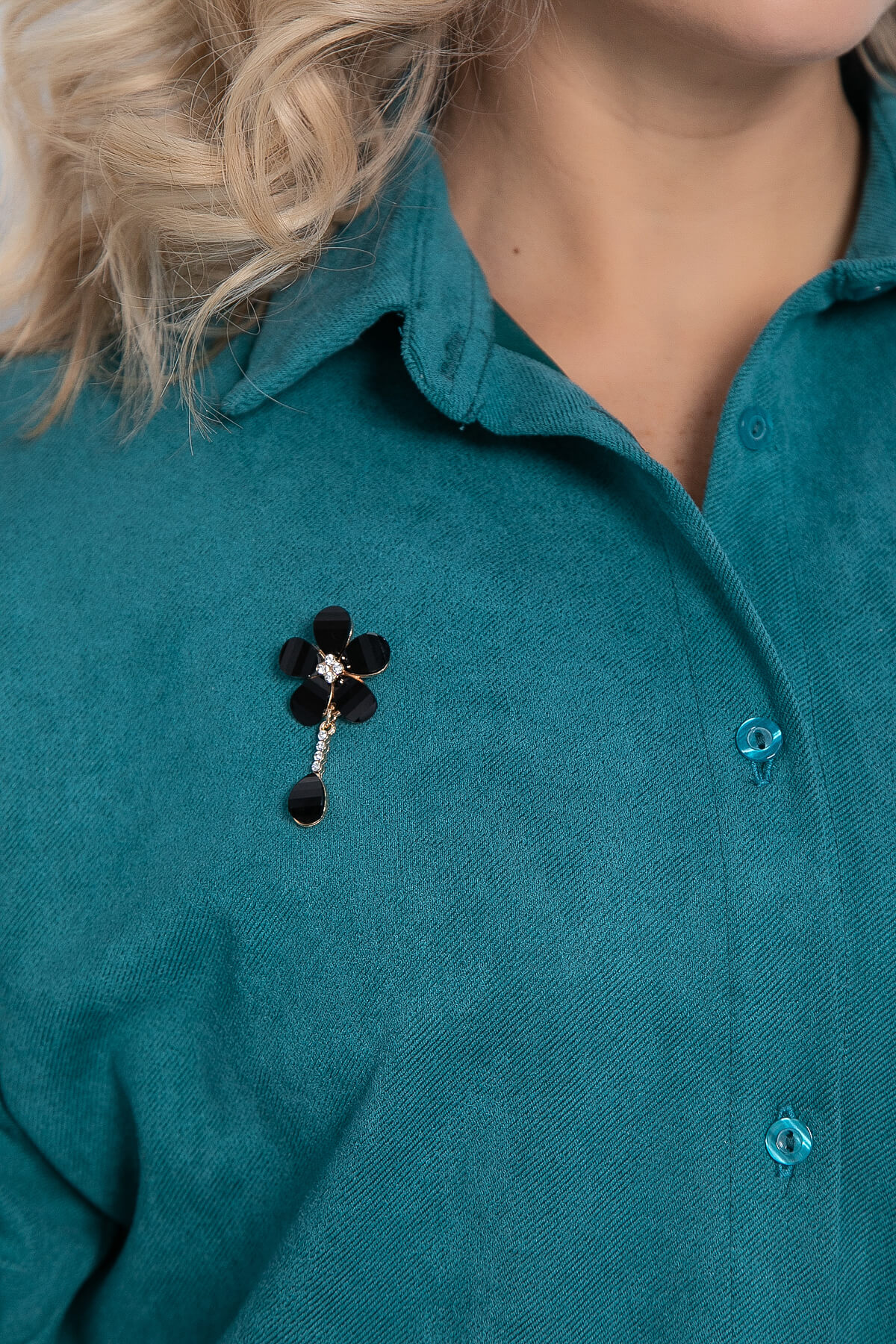 Рубашка прямого кроя из микровельвета — это воплощение комфорта и уюта. Она станет отличным выбором для любого случая — будь то деловой день или вечерняя прогулка с семьёй. Вы можете носить её как самостоятельный элемент или сочетать с другими вещами из вашего гардероба. Завершающим штрихом этой рубашки станет брошь, которая входит в комплект.