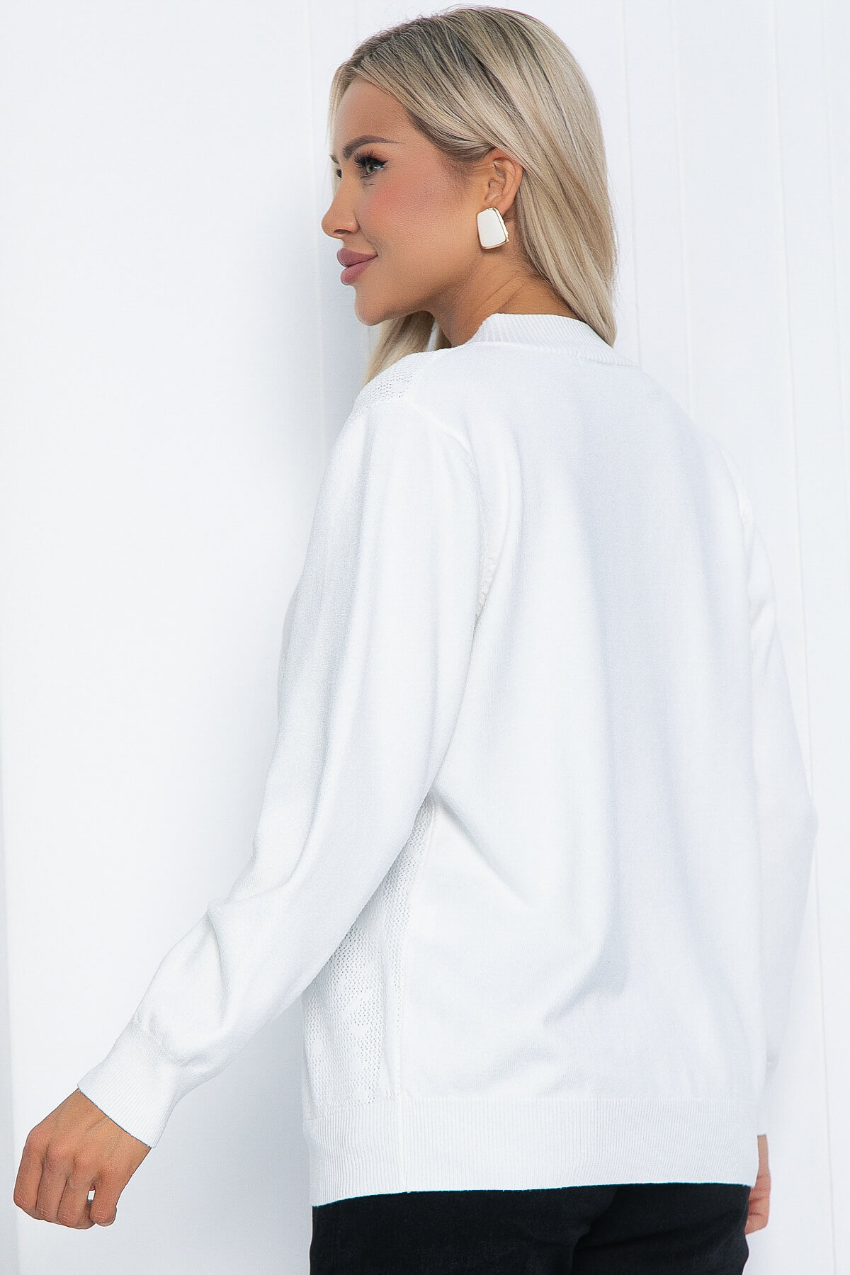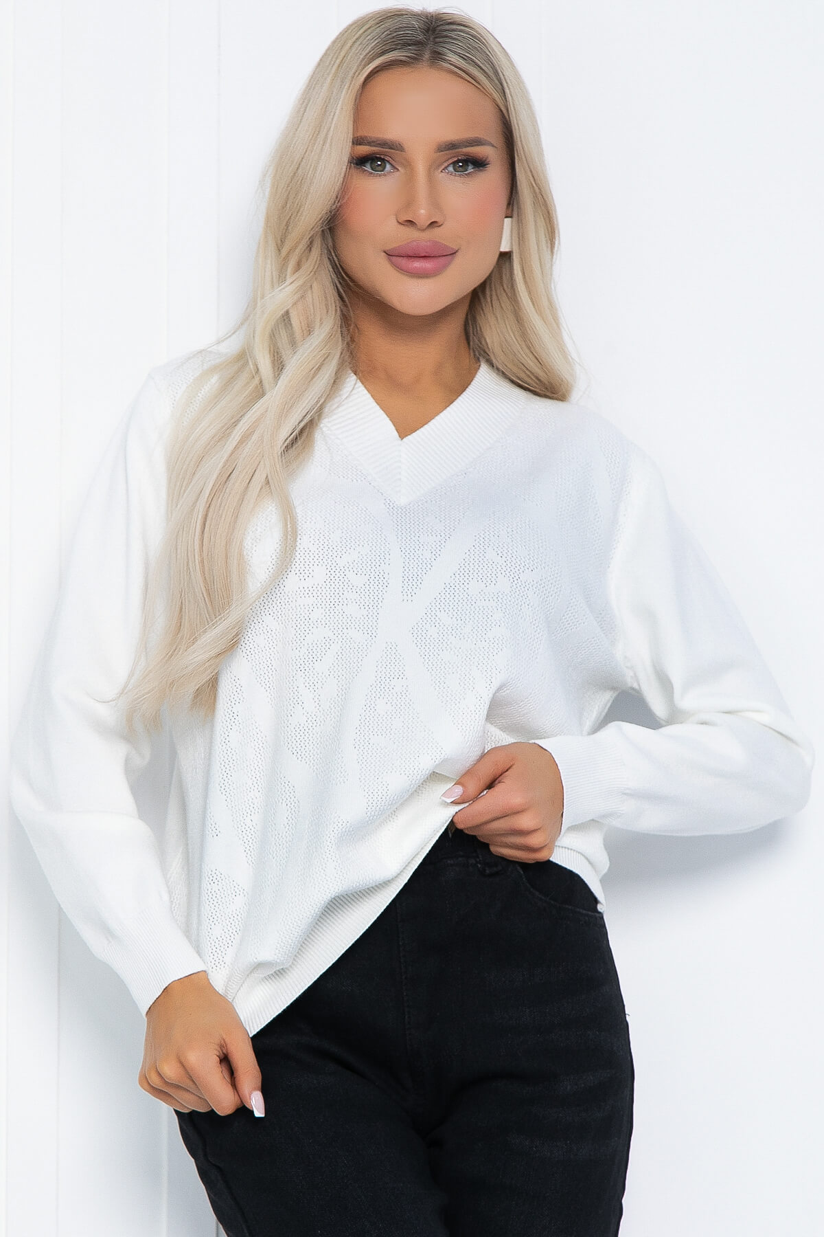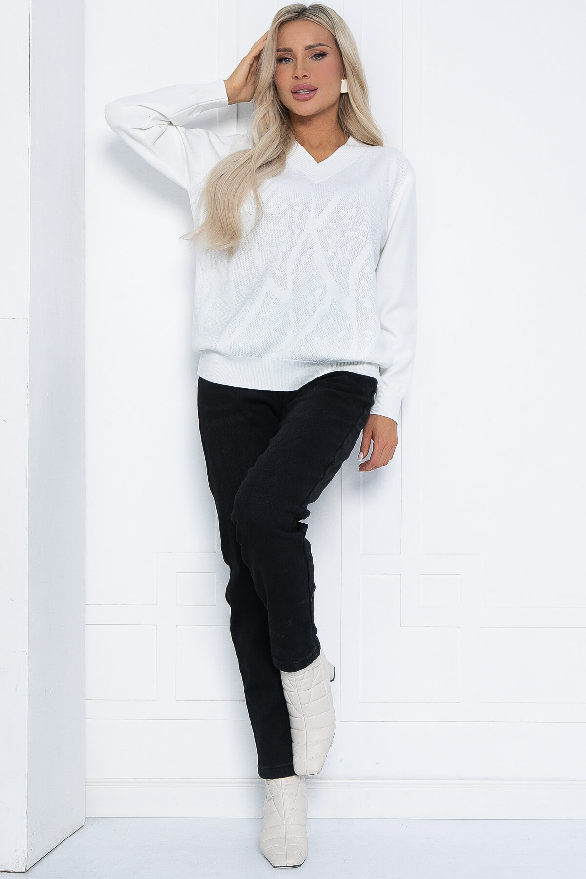 Женский джемпер в белом оттенке с декоративной вязкой на передней части изделия. Горловина украшена V-образным вырезом, а рукава втачные. Эта модель прекрасно дополнит любой гардероб и станет его основой для осенне-зимнего сезона. Носите джемпер как самостоятельный предмет одежды или как второй слой поверх топов и рубашек.