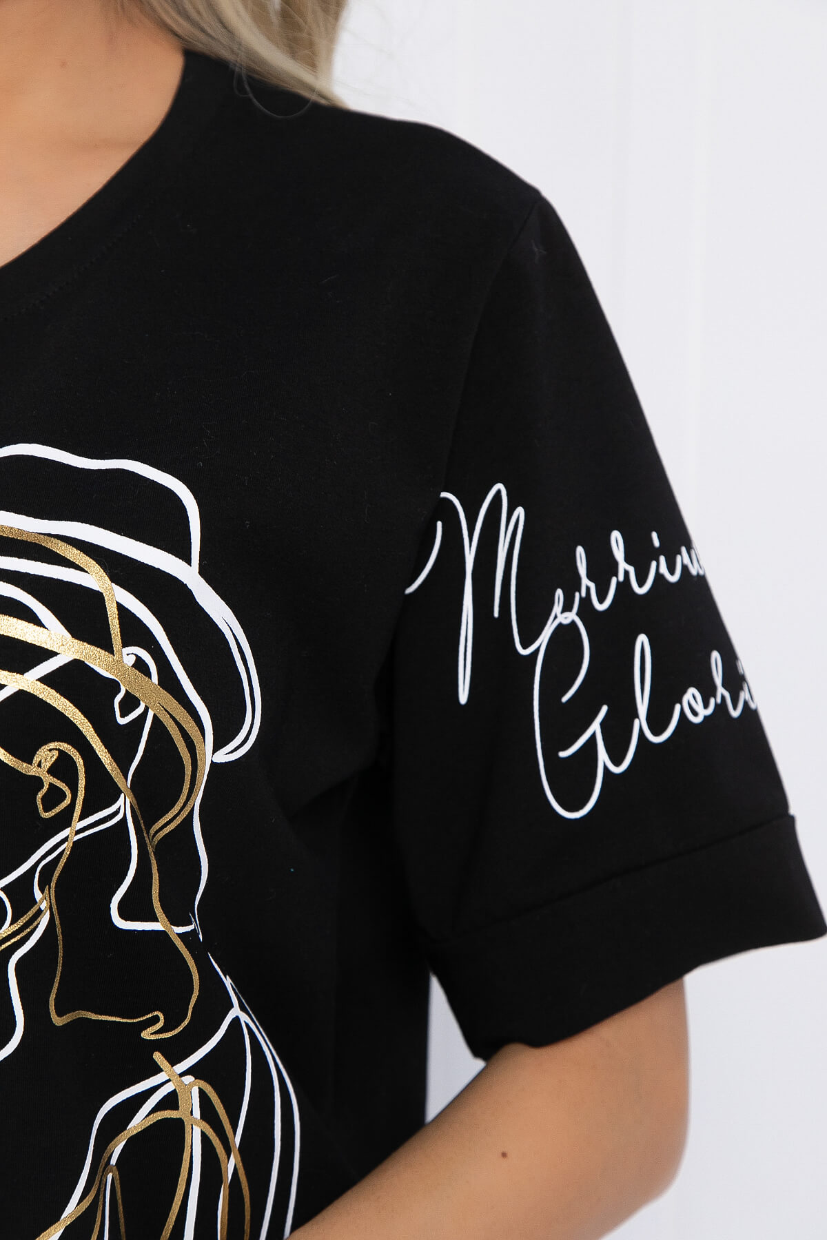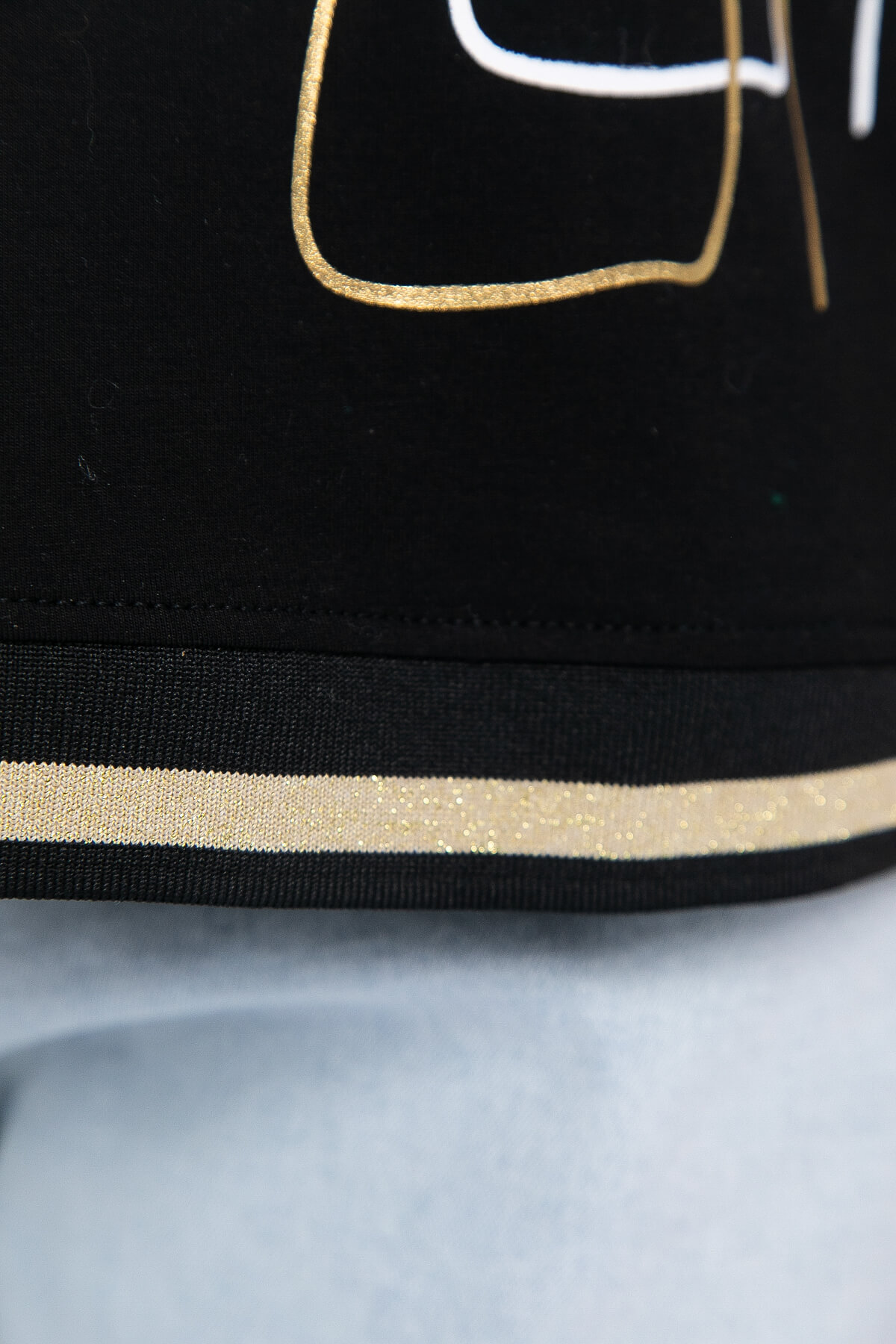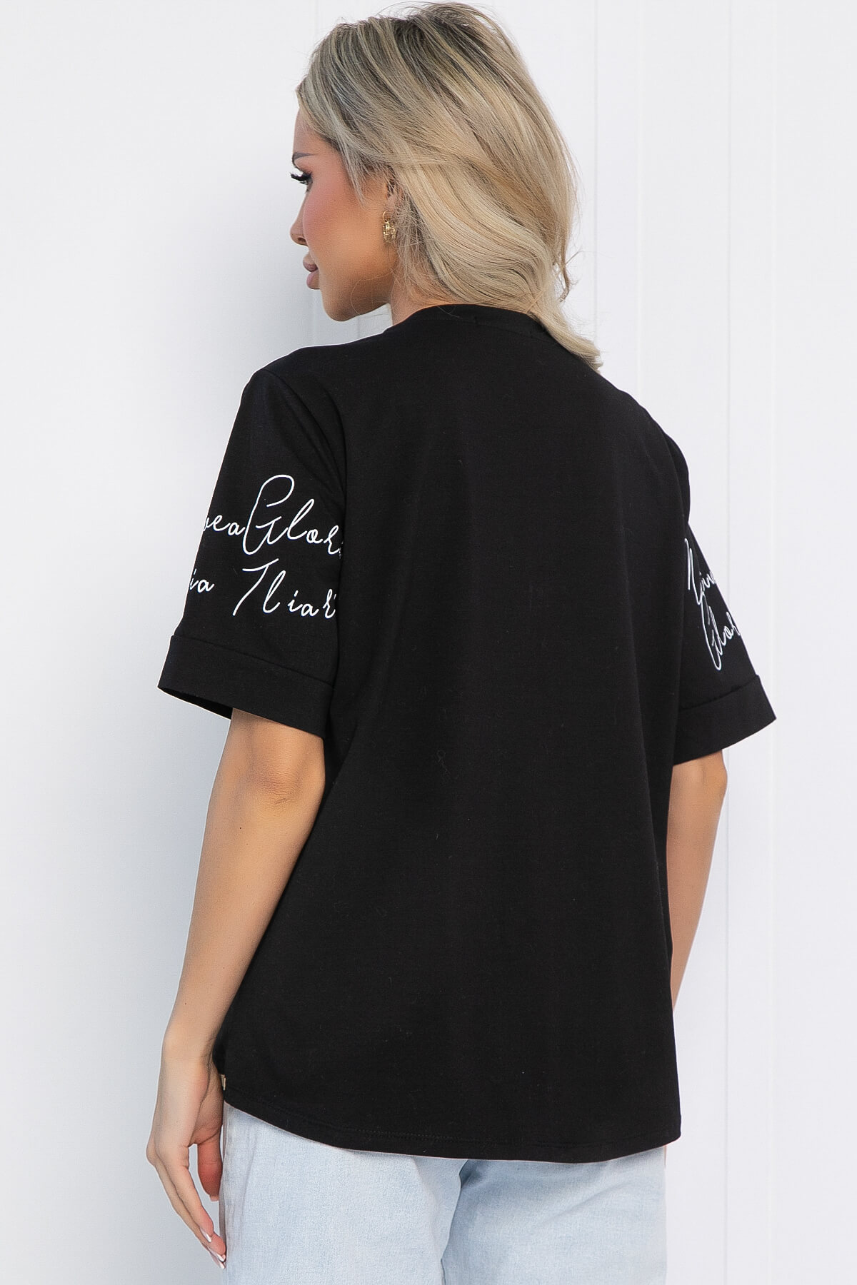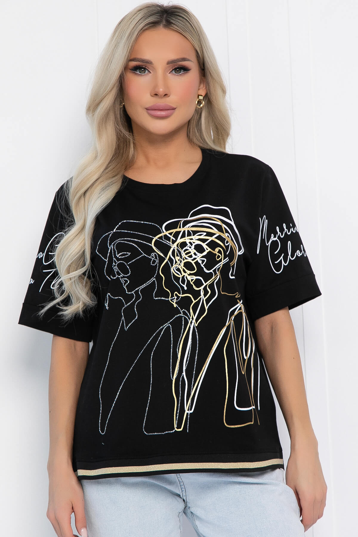 Чёрная блузка — это прекрасное дополнение к вашему гардеробу, которое поможет создать стильный и модный образ. Она выполнена из натуральной ткани, что обеспечивает комфорт и удобство в носке. Блузка украшена уникальным абстрактным рисунком и стразами, которые придают ей изюминку. Декоративная резинка на передней части подчеркивает фигуру и создает эффектный силуэт.