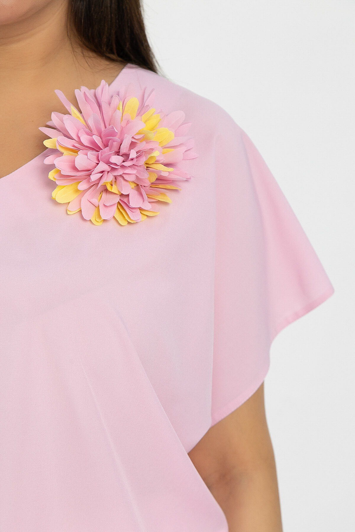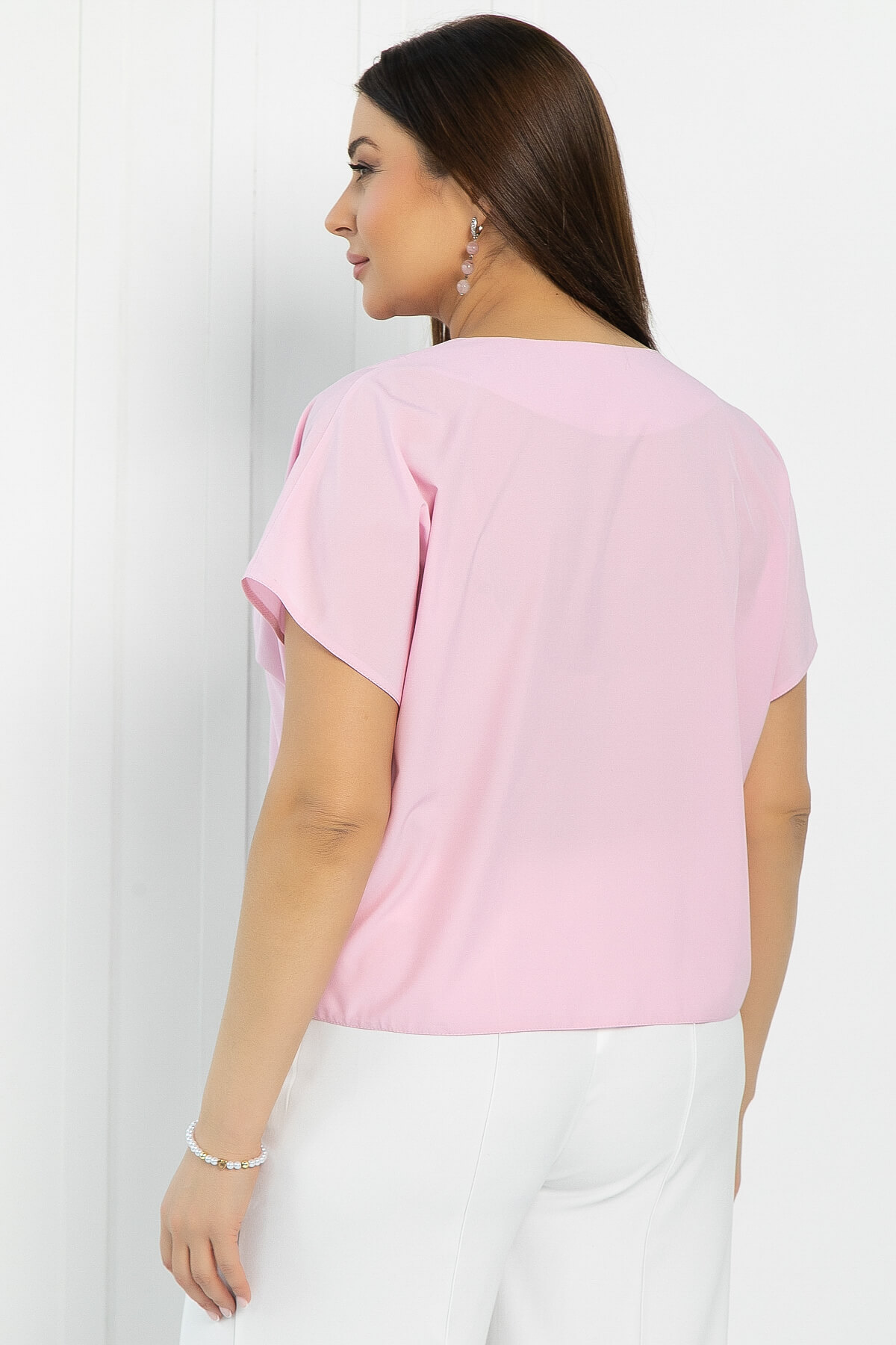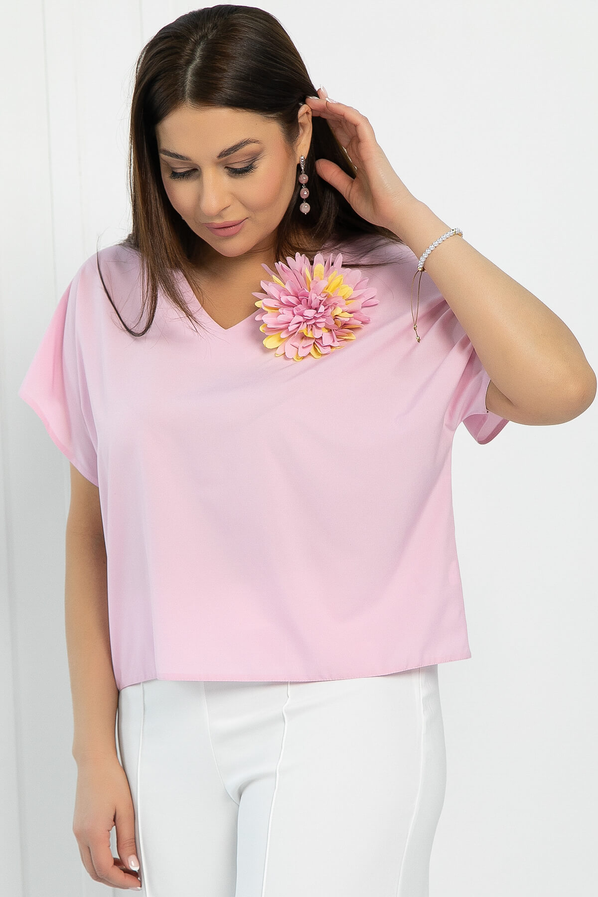 Блузка в розовом оттенке, украшенная брошью в виде цветка, — это идеальное решение для тех, кто стремится выглядеть женственно и уникально! Удлинённая линия плеча создаёт элегантный силуэт, а V-образный вырез придаёт образу стильный акцент. Эта блузка отлично сочетается как с юбками, так и с брюками, позволяя создавать разнообразные стильные образы для любого случая!