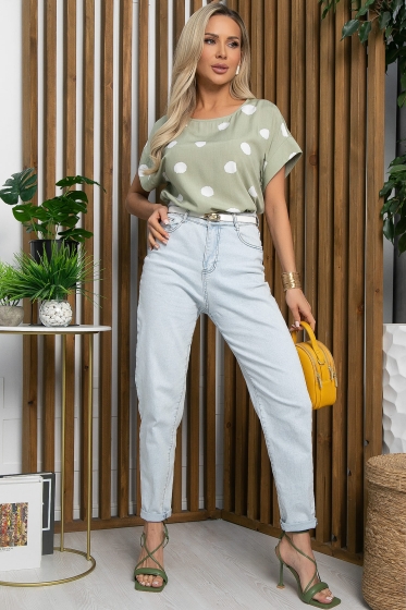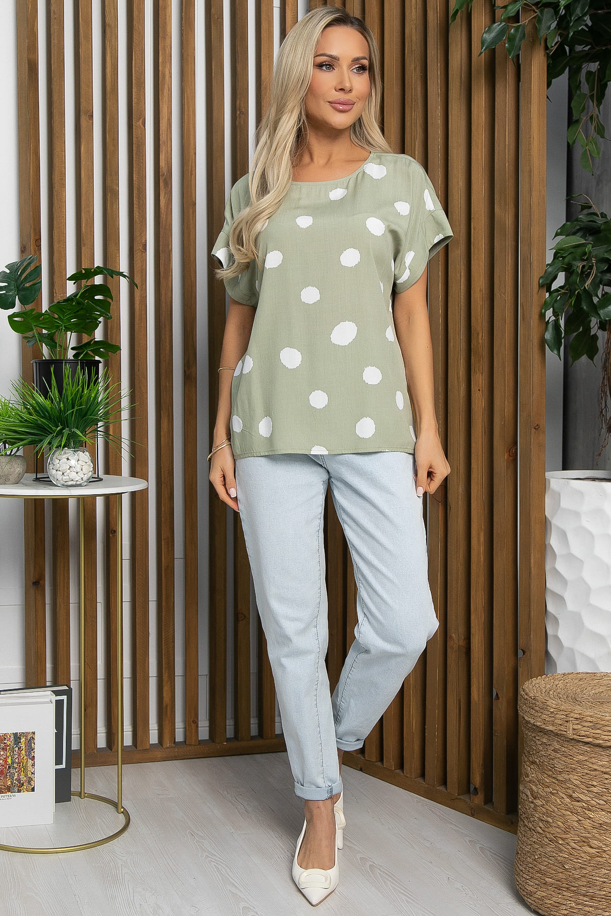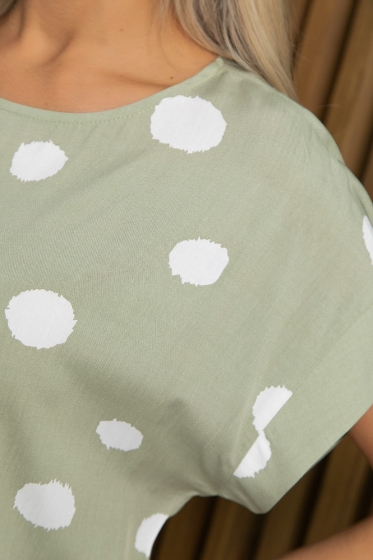 Футболка с принтом в горошек — это must-have для любого современного гардероба! Она идеально подходит для создания повседневных образов и легко комбинируется с самыми разнообразными вещами, позволяя создавать стильные ансамбли. Эта футболка обладает свободным кроем, спущенными плечами и манжетами, что придаёт ей непринуждённый вид.