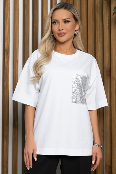 Белая футболка с ассиметричным кроем — станет настоящим украшением вашего гардероба! Она имеет оригинальный дизайн с имитацией кармана на груди, который украшен пайетками. Такая футболка подойдёт как для повседневных образов, так и для особых случаев. Свободный силуэт обеспечивает свободу движений и комфорт. Она прекрасно сочетается с джинсами и юбками, позволяя создавать разнообразные стильные образы.