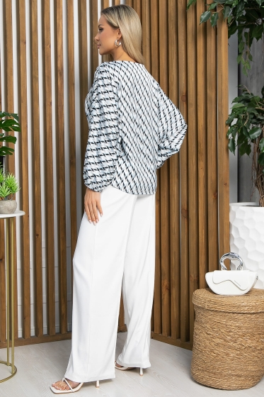 Изящная блузка с геометрическим принтом — универсальный вариант для создания как повседневных, так и деловых образов. Модель с рукавами «летучая мышь» и вырезом горловины в форме лодочки. Блузка облегает по бёдра, подчёркивая силуэт, а рукава по низу на резинке. Эта блузка станет отличным дополнением к юбкам или брюкам, позволяя создавать стильные и уверенные образы!