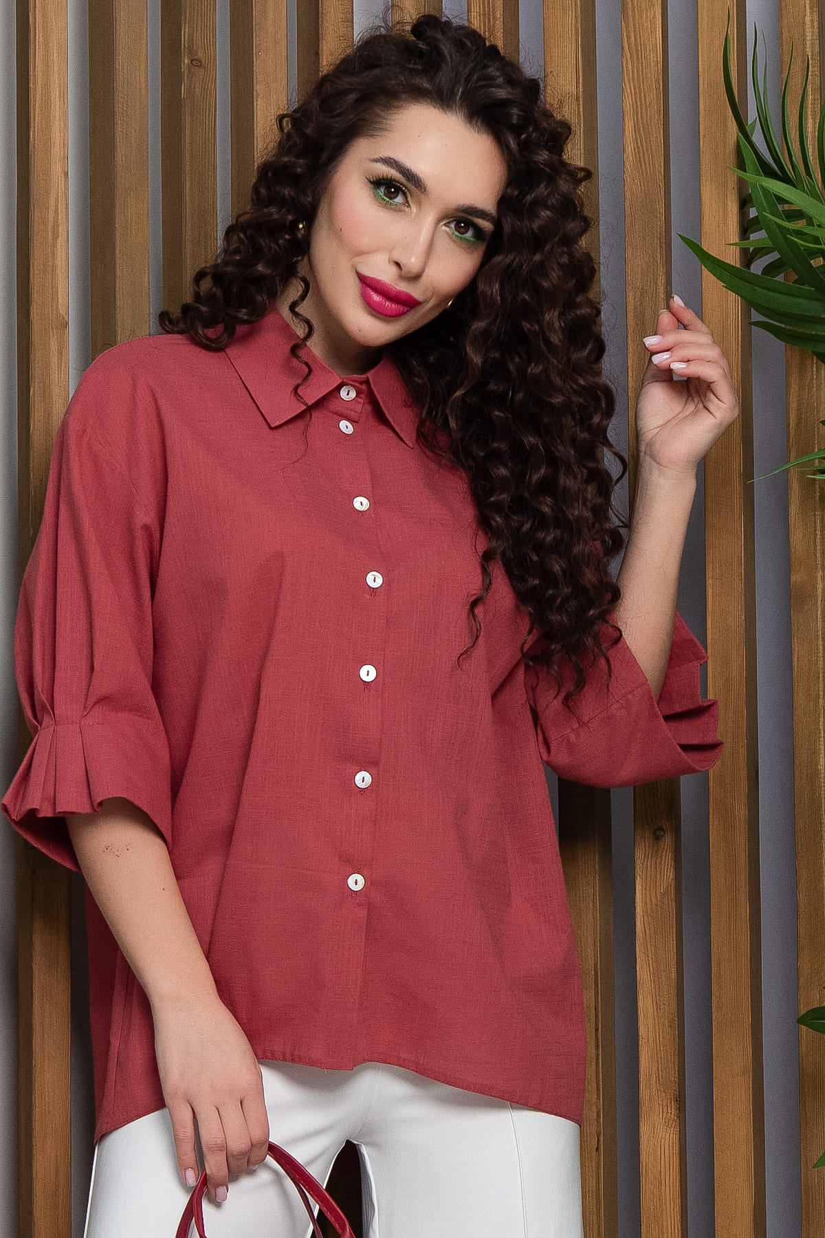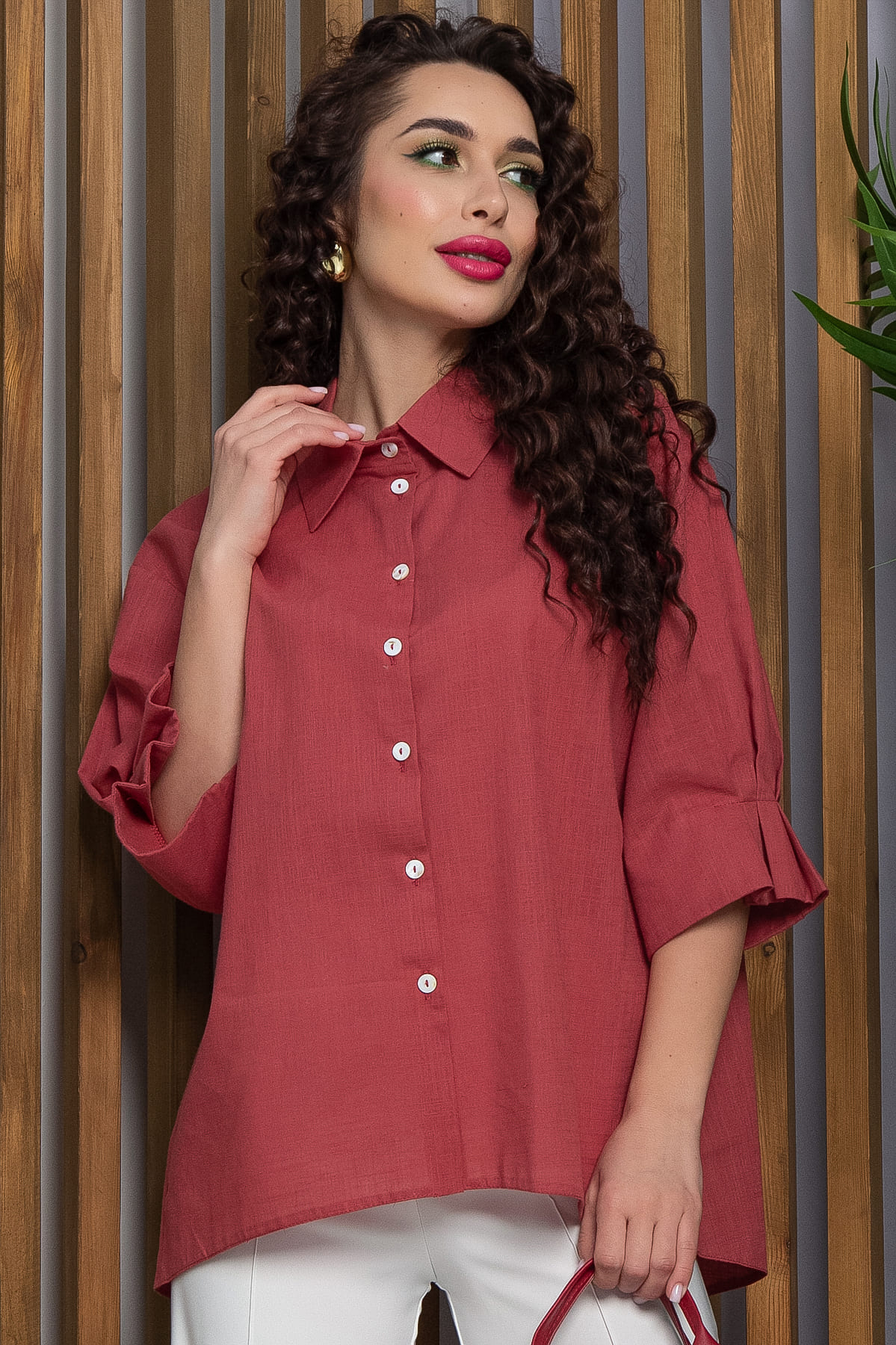 Льняная рубашка свободного кроя — это идеальный выбор для создания стильного и комфортного образа! Её отличительной чертой является разрез на спинке, который придаёт ей оригинальность. Люверсы, соединённые тканевой завязкой сзади, добавляют образу интересный акцент. Рукав длиной 3/4 с манжетами и защипами создаёт стильный и аккуратный вид.