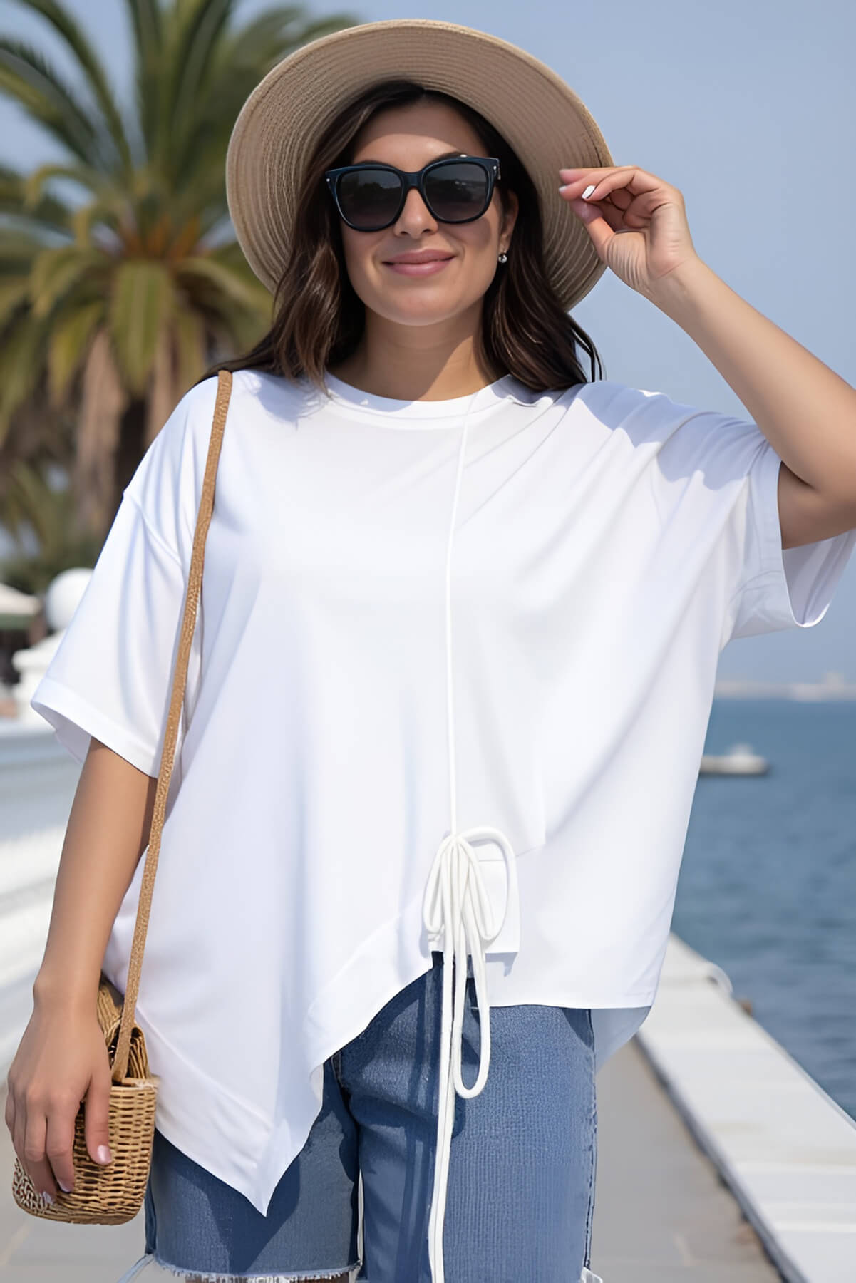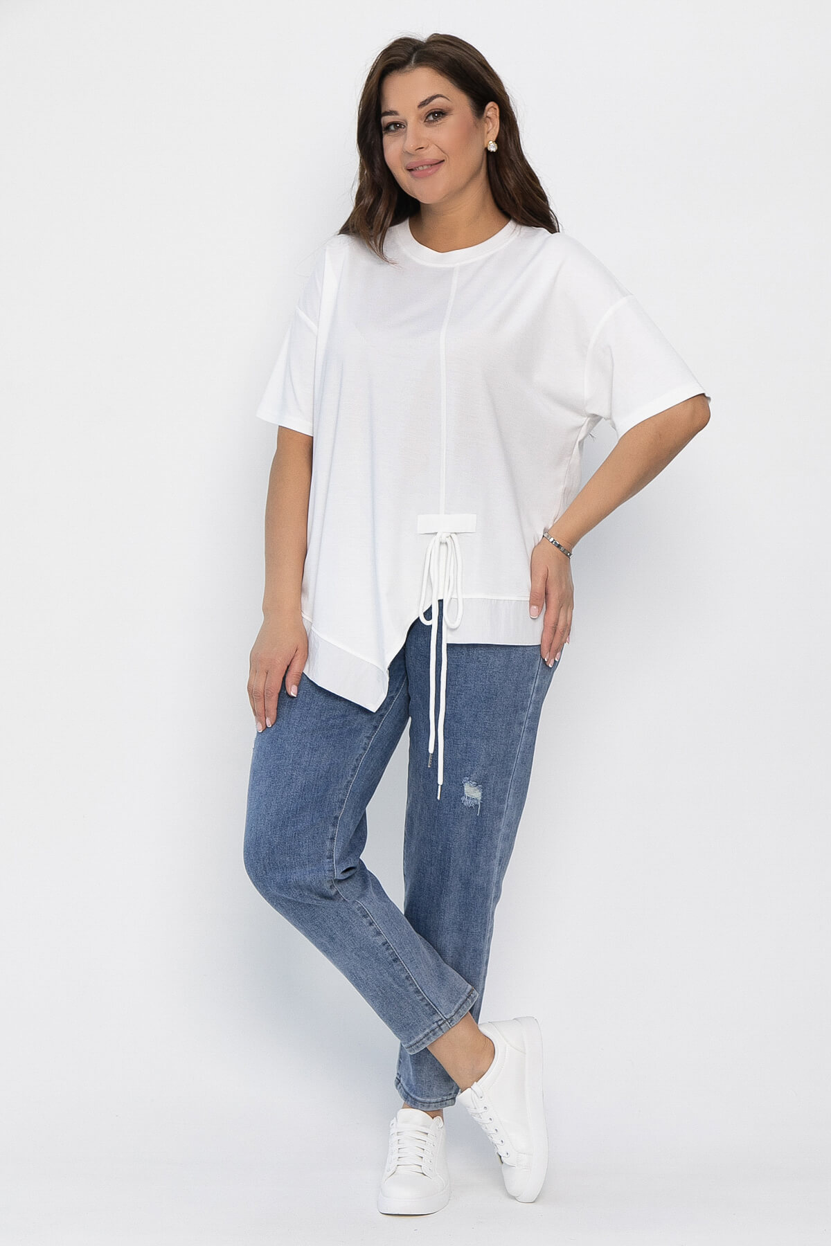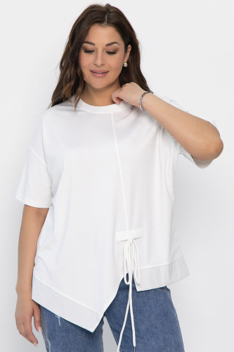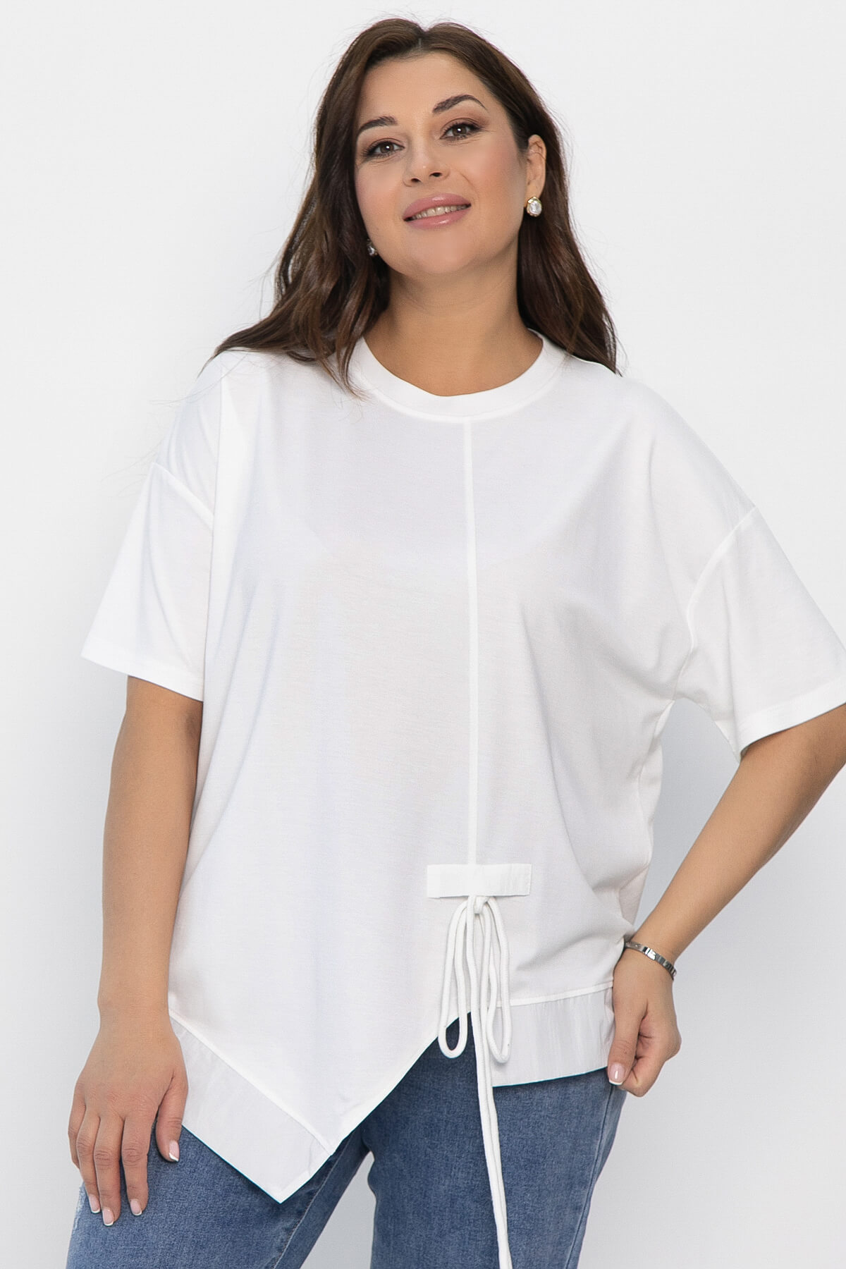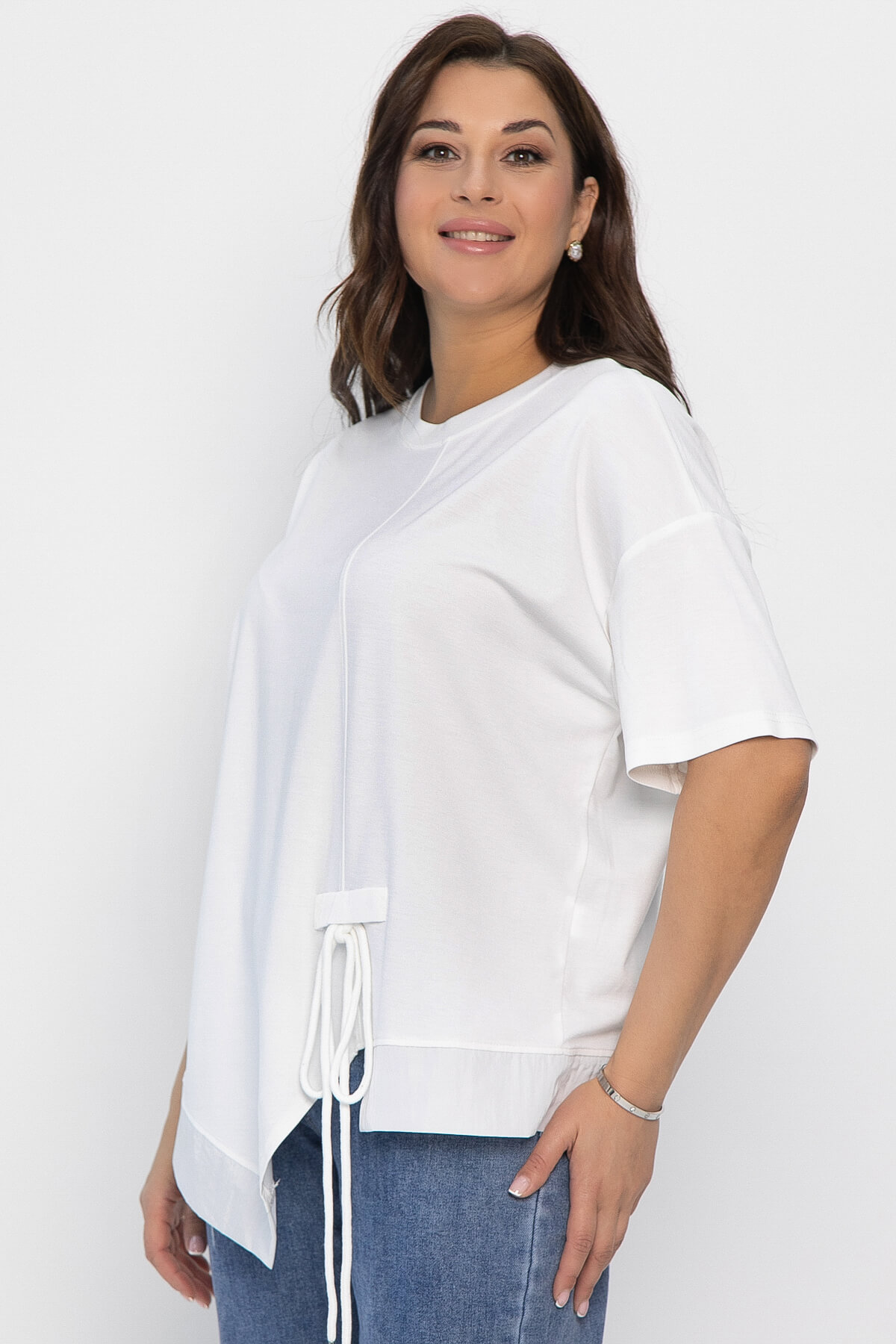 Оригинальная свободная блузка — идеальный выбор для тех, кто хочет подчеркнуть свою индивидуальность и выделиться из толпы. Модель с асимметричным кроем, украшенным шнуром, станет ярким акцентом в любом образе.