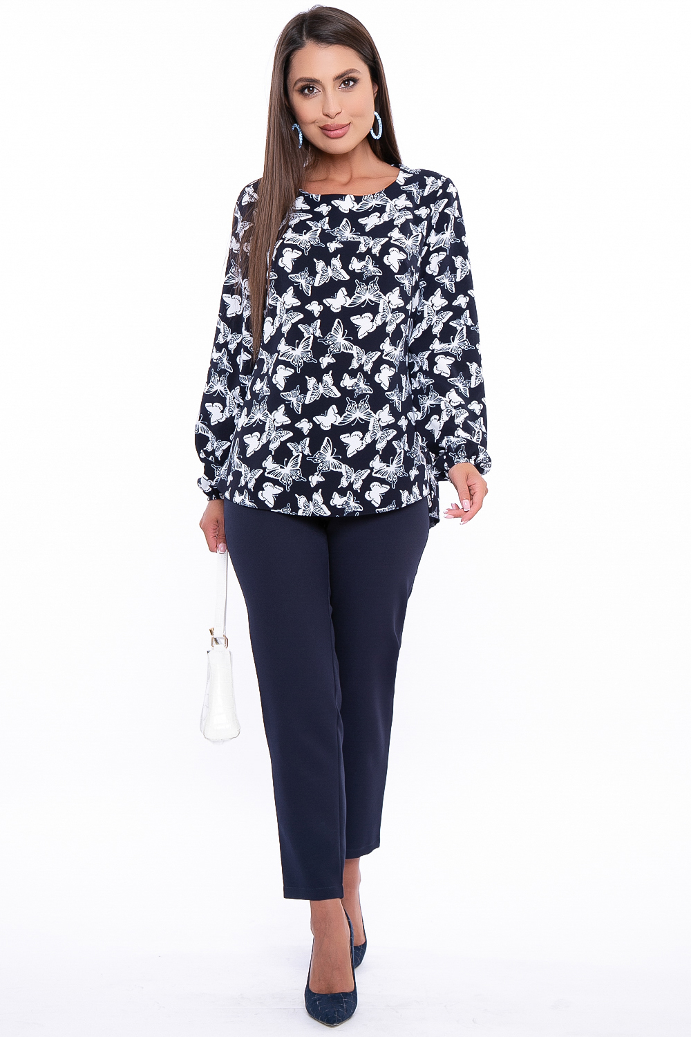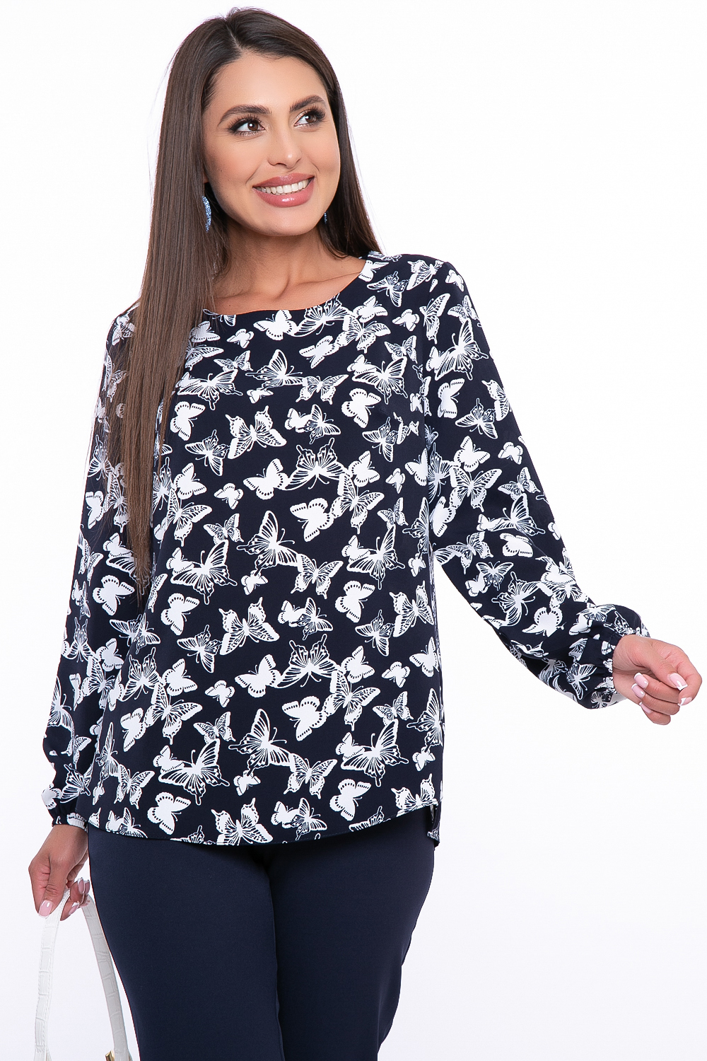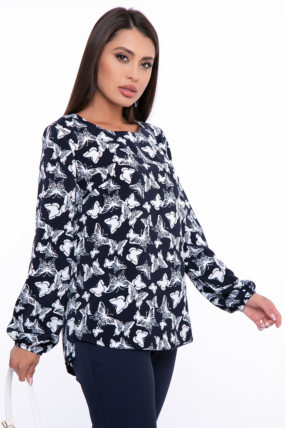 - Женственная блуза из синей ткани прекрасно дополнит Вашу базовую капсулу. Очень красивый рисунок бабочки;