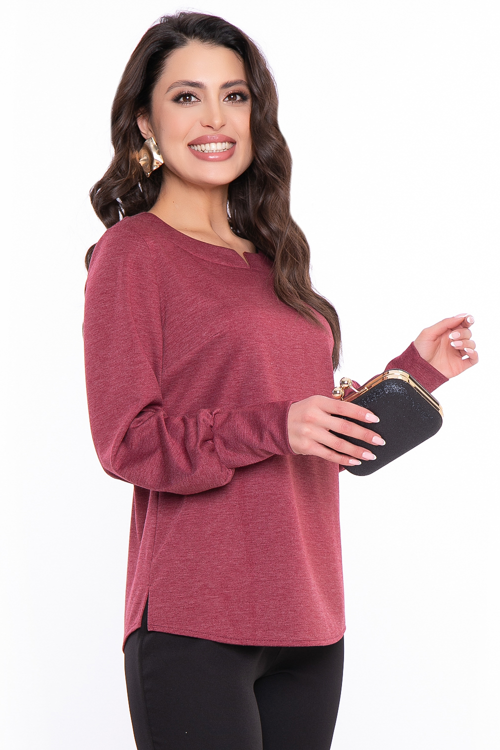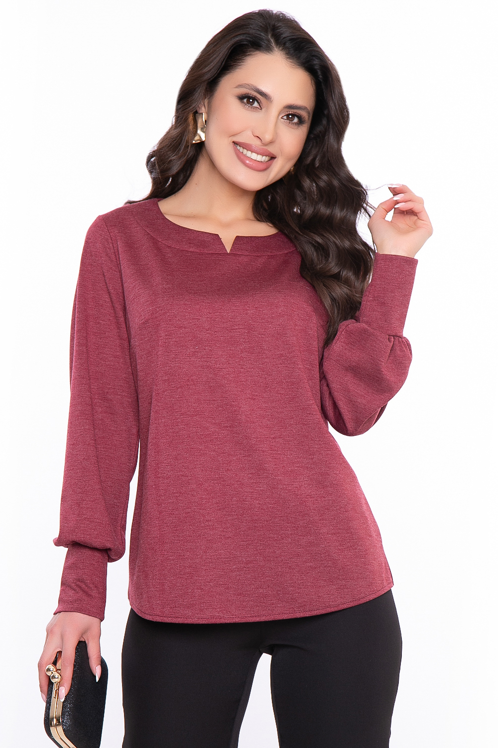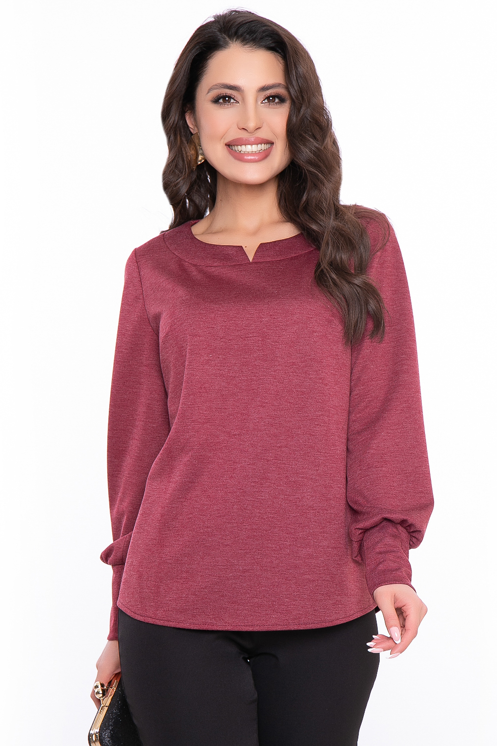 Базовый джемпер в бордовом оттенке с красивым акцентом в виде галочки на вороте.