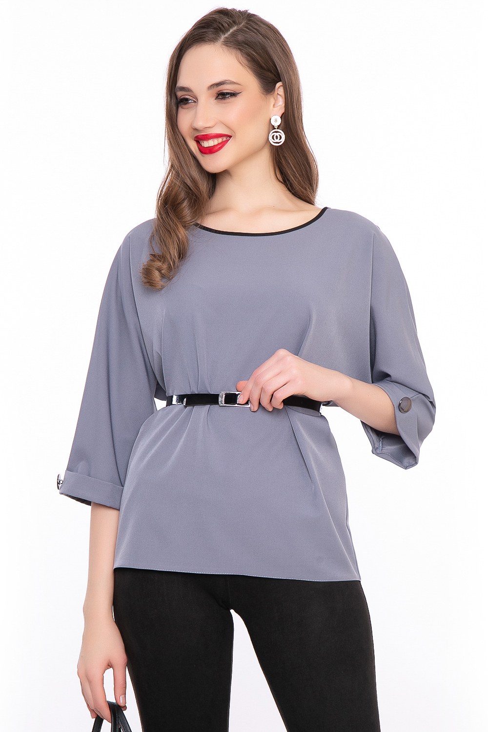 Идеальная блуза свободного кроя в сером оттенке. Можно надевать с поясом, подчеркивая линию талии, либо же без него. Блуза свободного кроя, вырез горловины округлый, обработан чёрной окантовкой. Поясок в комплекте, позволяет красиво подчеркнуть талию. Рукав цельнокроеный, фасон "летучая мышь", семь восьмых. Рукав широкий, низ украшен отворотом с пуговицей;