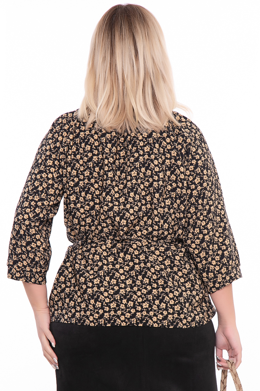 Очаровательная блуза свободного кроя с завязками на талии. Округлый вырез горловины с разрезом на трёх пуговках. Рукав втачной, три четверти.