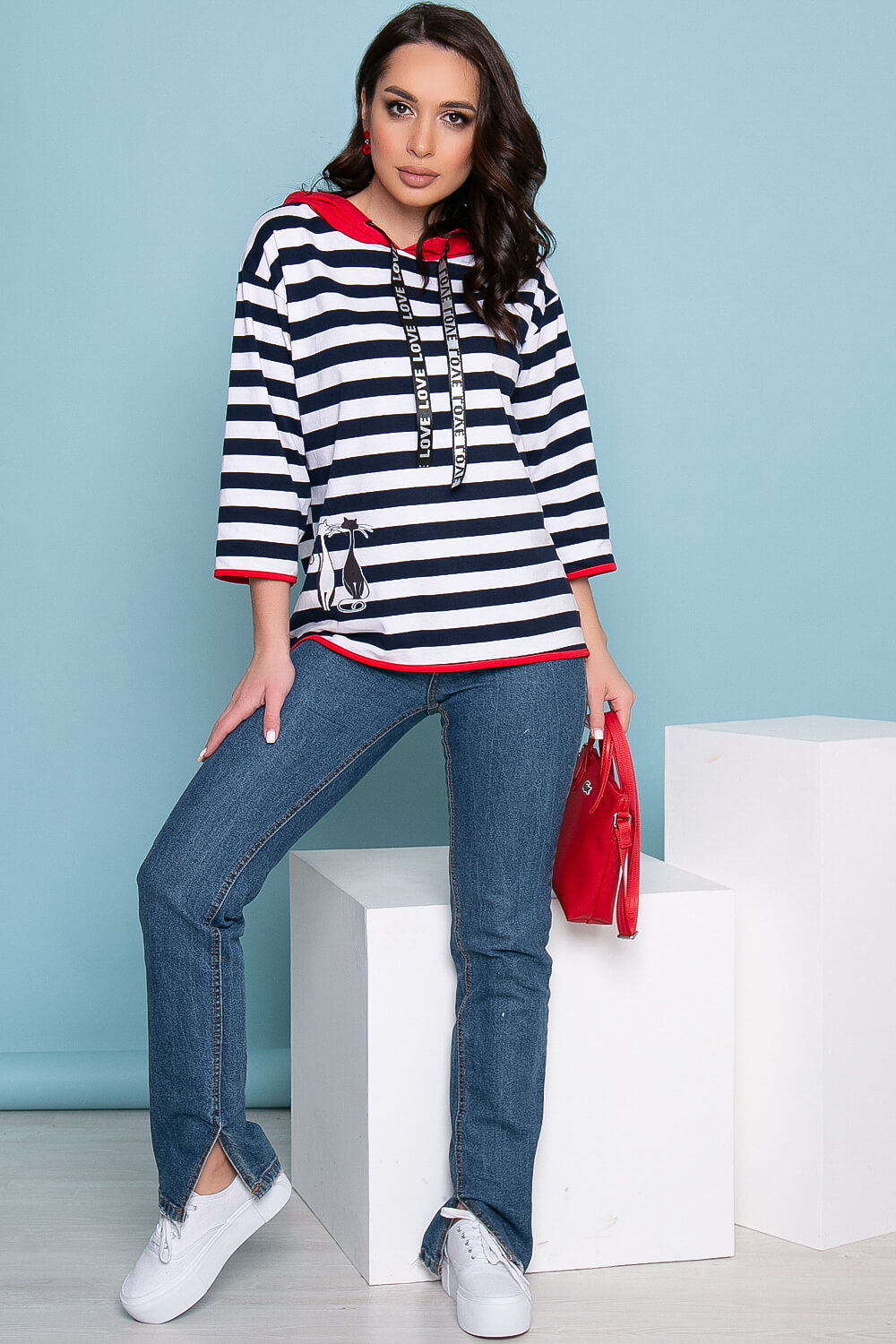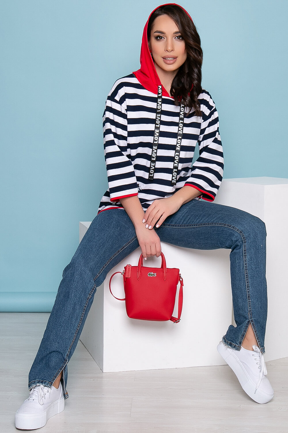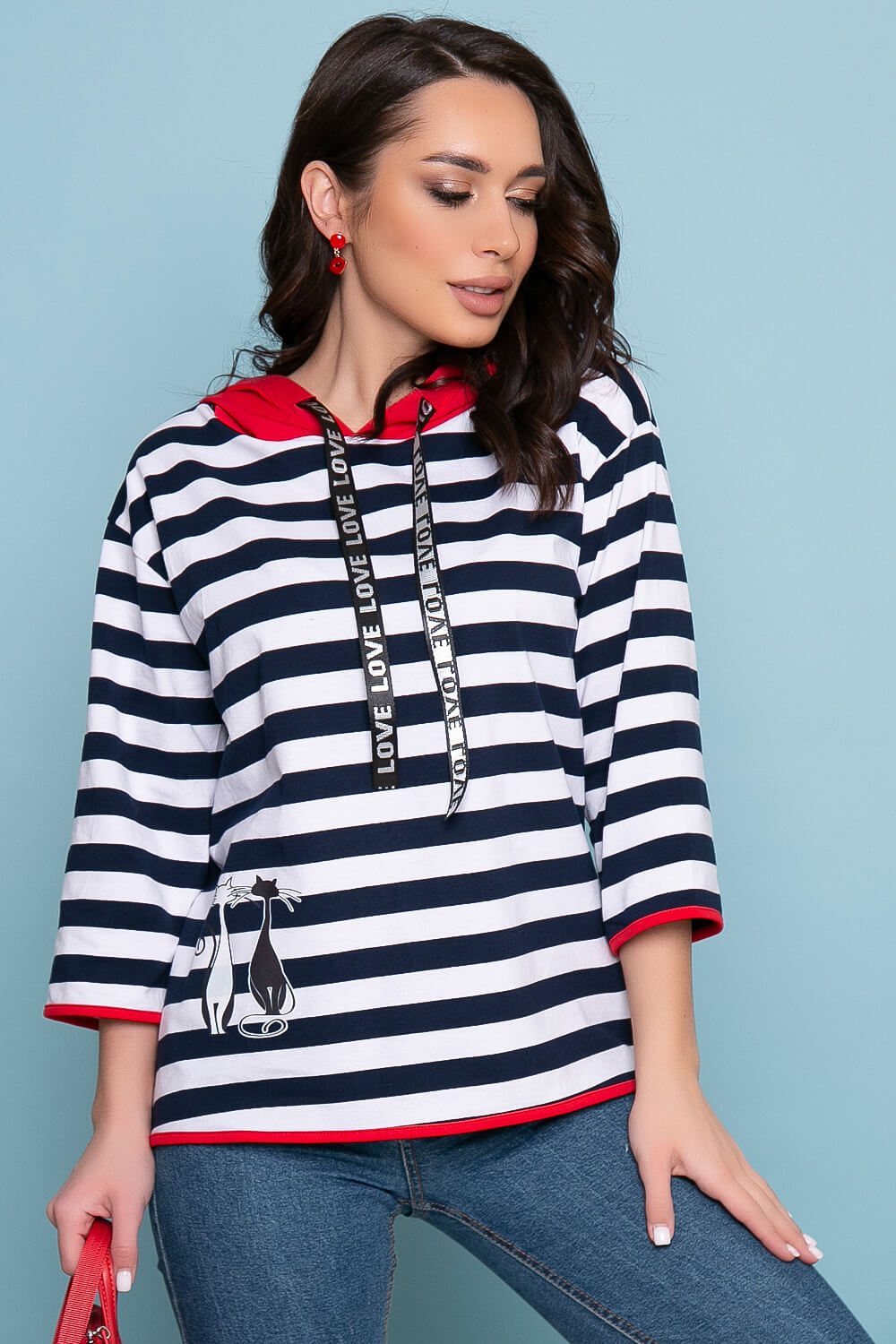 Футболка с рукавом 3/4 из плотного трикотажа с ярким капюшоном - просто находка для весенне-летнего сезона. Прекрасно сочетается с джинсами, лосинами, брючками, а капюшон спасёт вас от возможных сюрпризов погоды, тем более, что он добавит яркий акцент образу. Футболка свободного кроя, рукав втачной, три четверти. В капюшон вдета плотная лента. Низ футболки украшают два очаровательных котика.