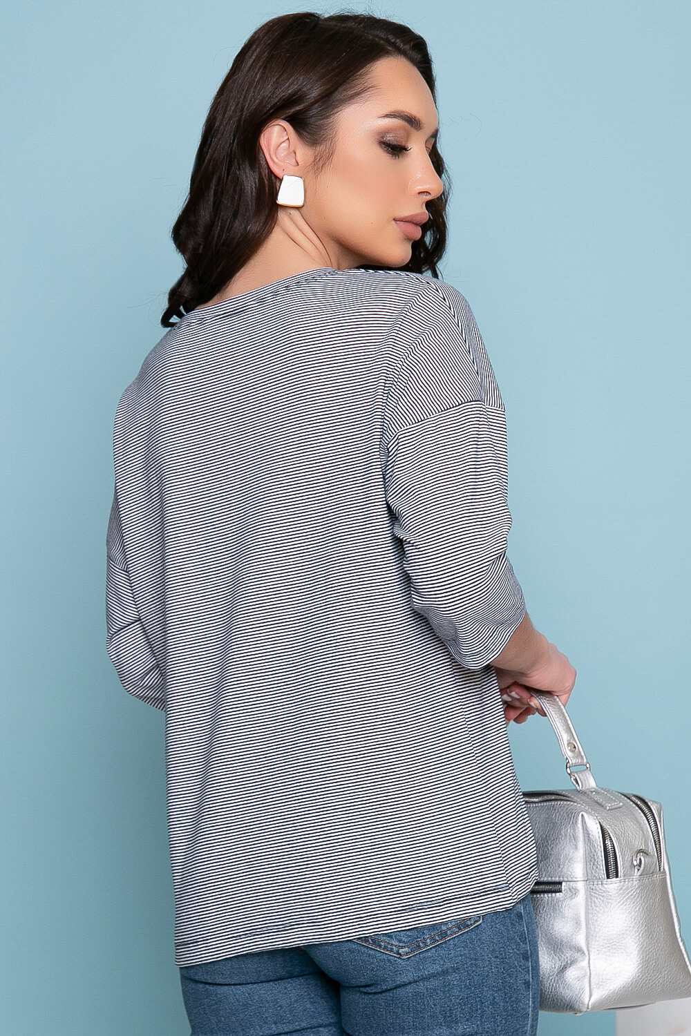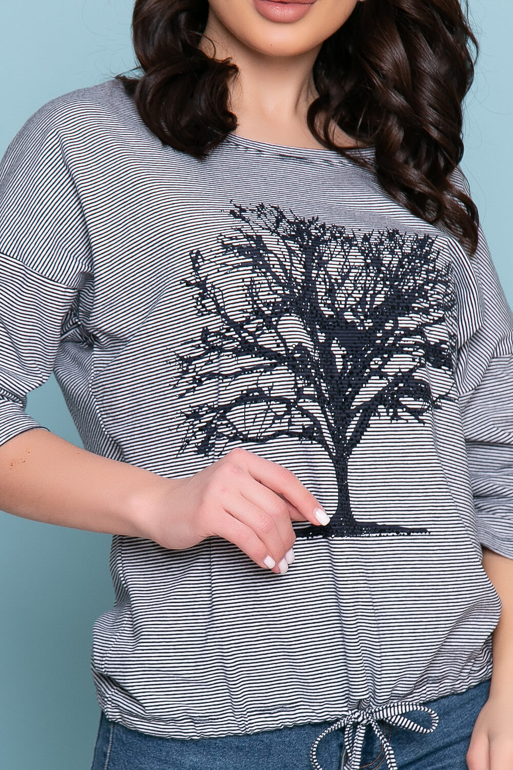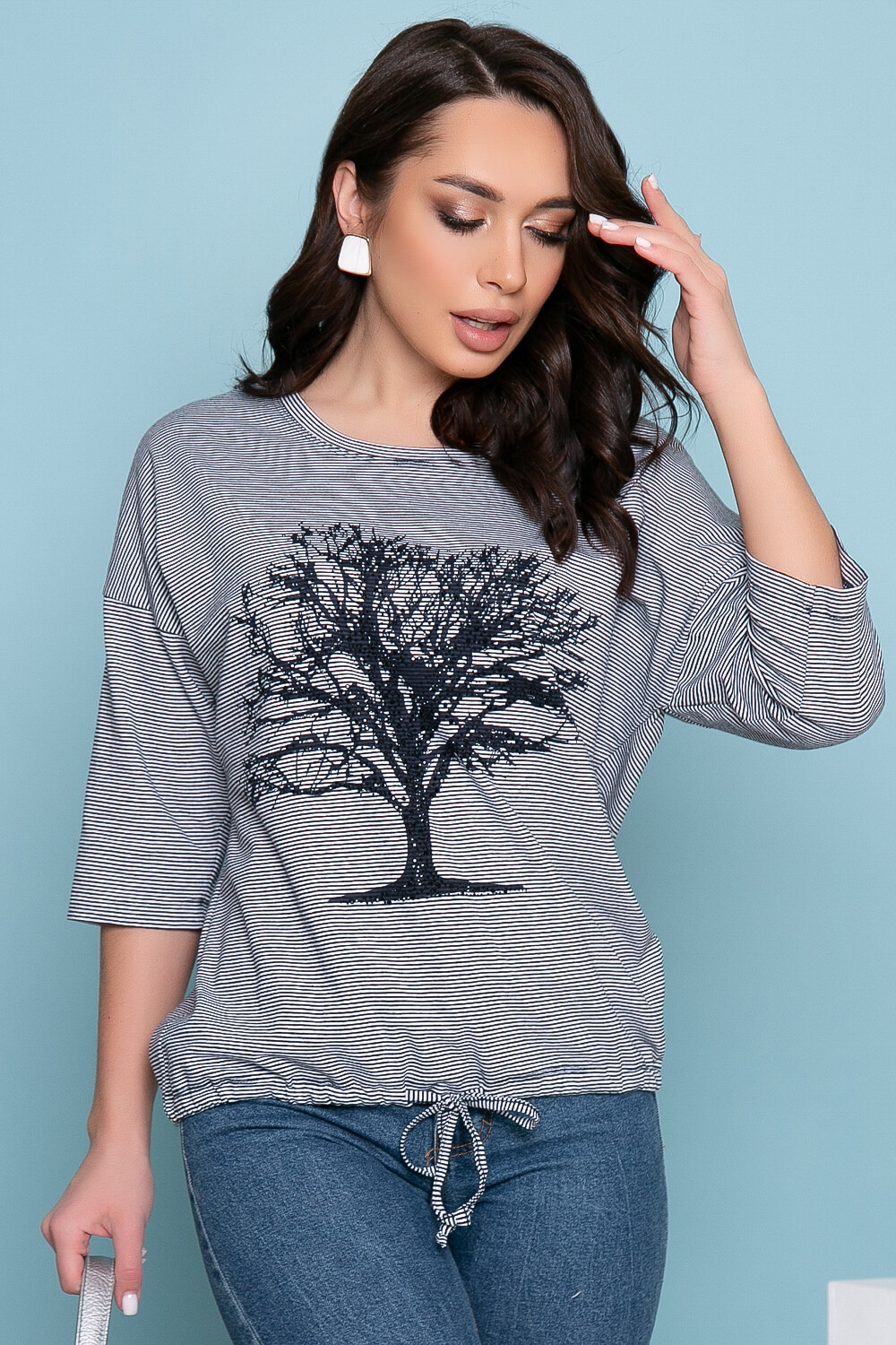 Футболка в мелкую полоску и рисунком в виде дерева, украшенного термо-стразами. Прекрасно сочетается с джинсами, лосинами, брючками. Футболка свободного кроя, рукав втачной, три четверти, плечевой шов спущен. По низу футболки - кулиска.