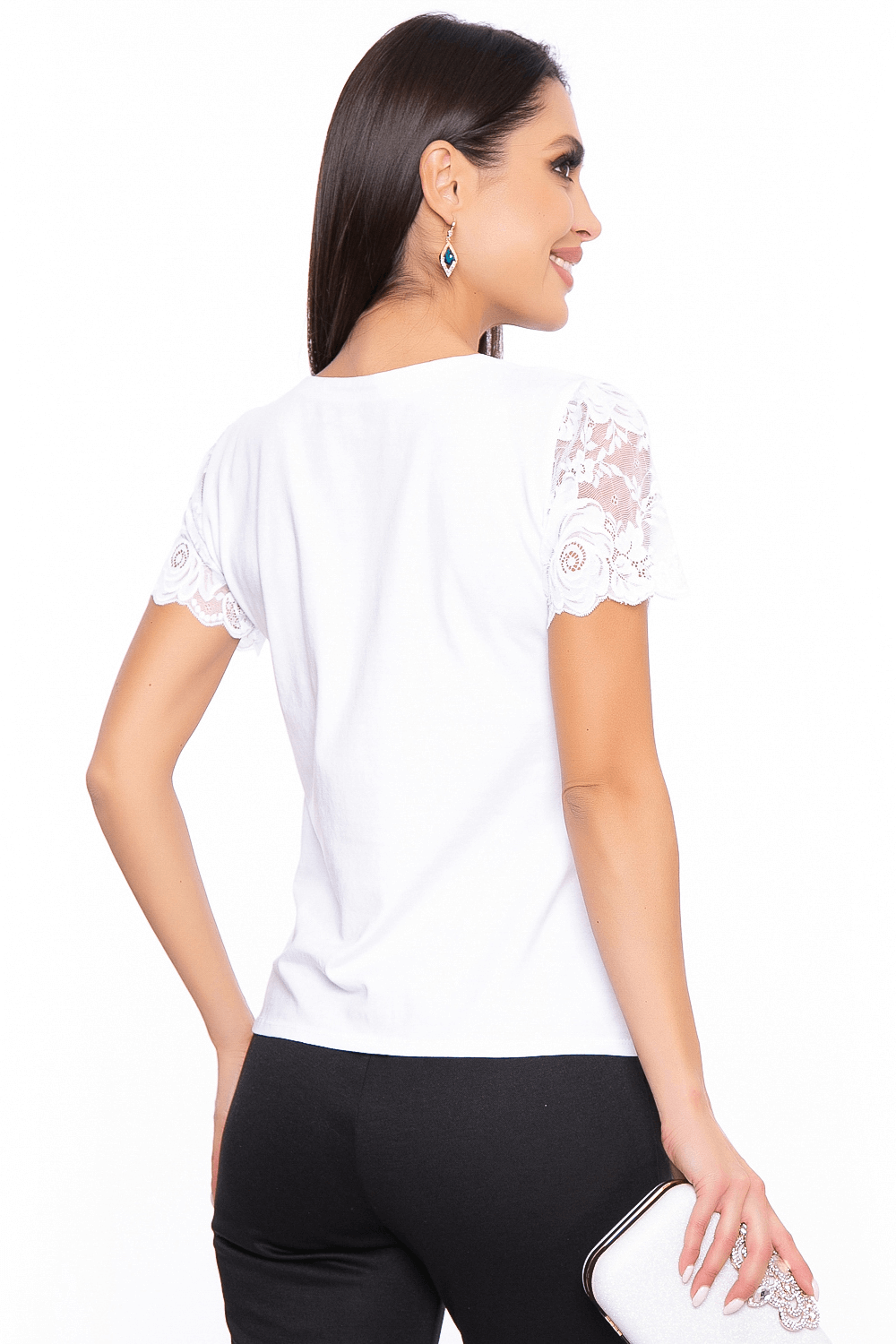 Блуза базовая белая из хлопка с кружевом - ХИТ продаж снова в наличии! Стильная и удобная трикотажная блуза прекрасно будет комбинироваться с любым низом. Её можно надеть под жакет или кардиган. Блуза прилегающего силуэта со вставками из эластичного гипюра. V-образный вырез горловины, рукав короткий, втачной, выполнен также из гипюра. Блуза без замков и застежек.