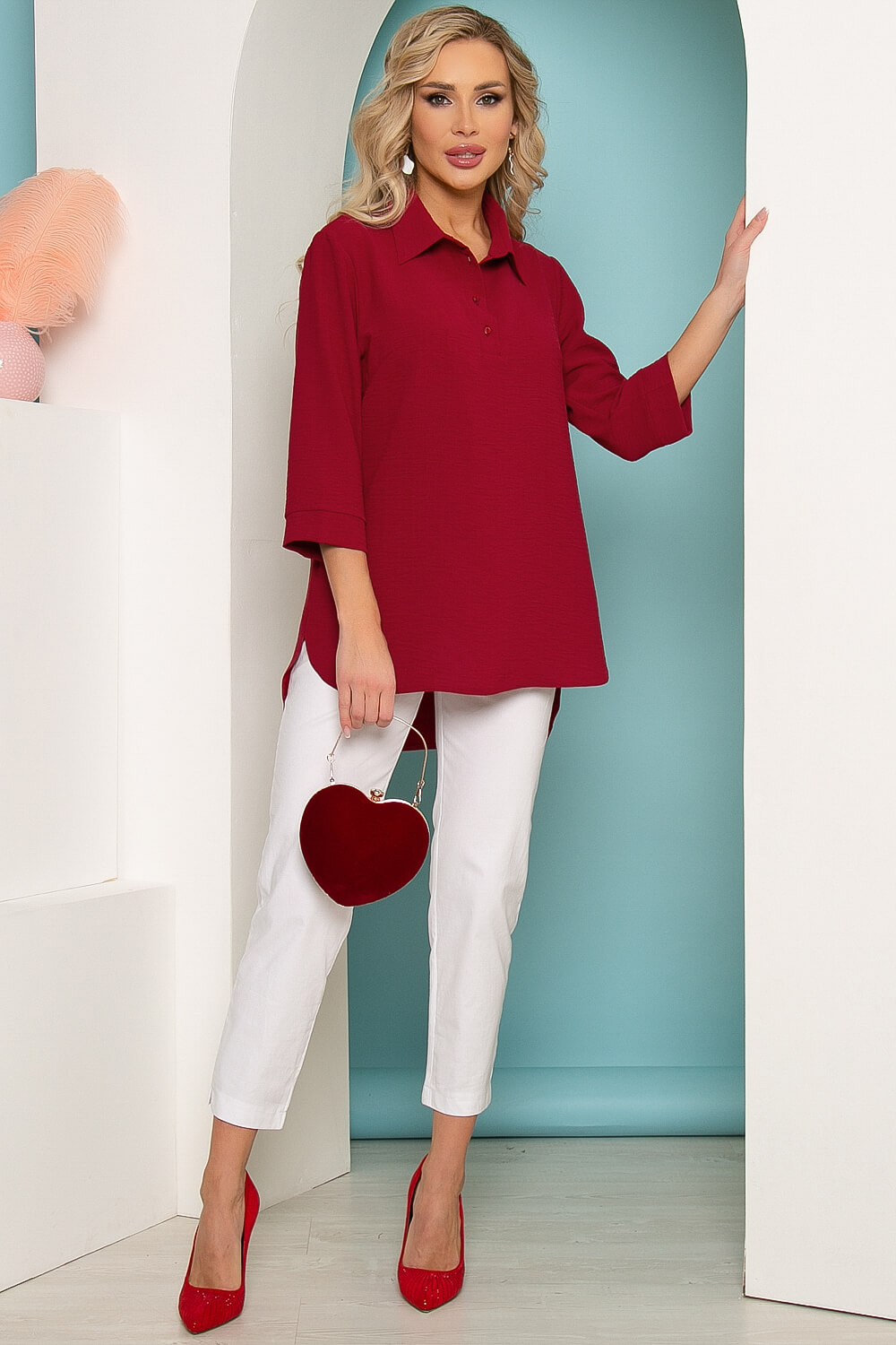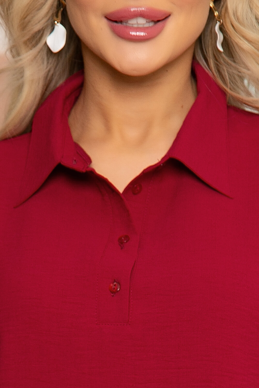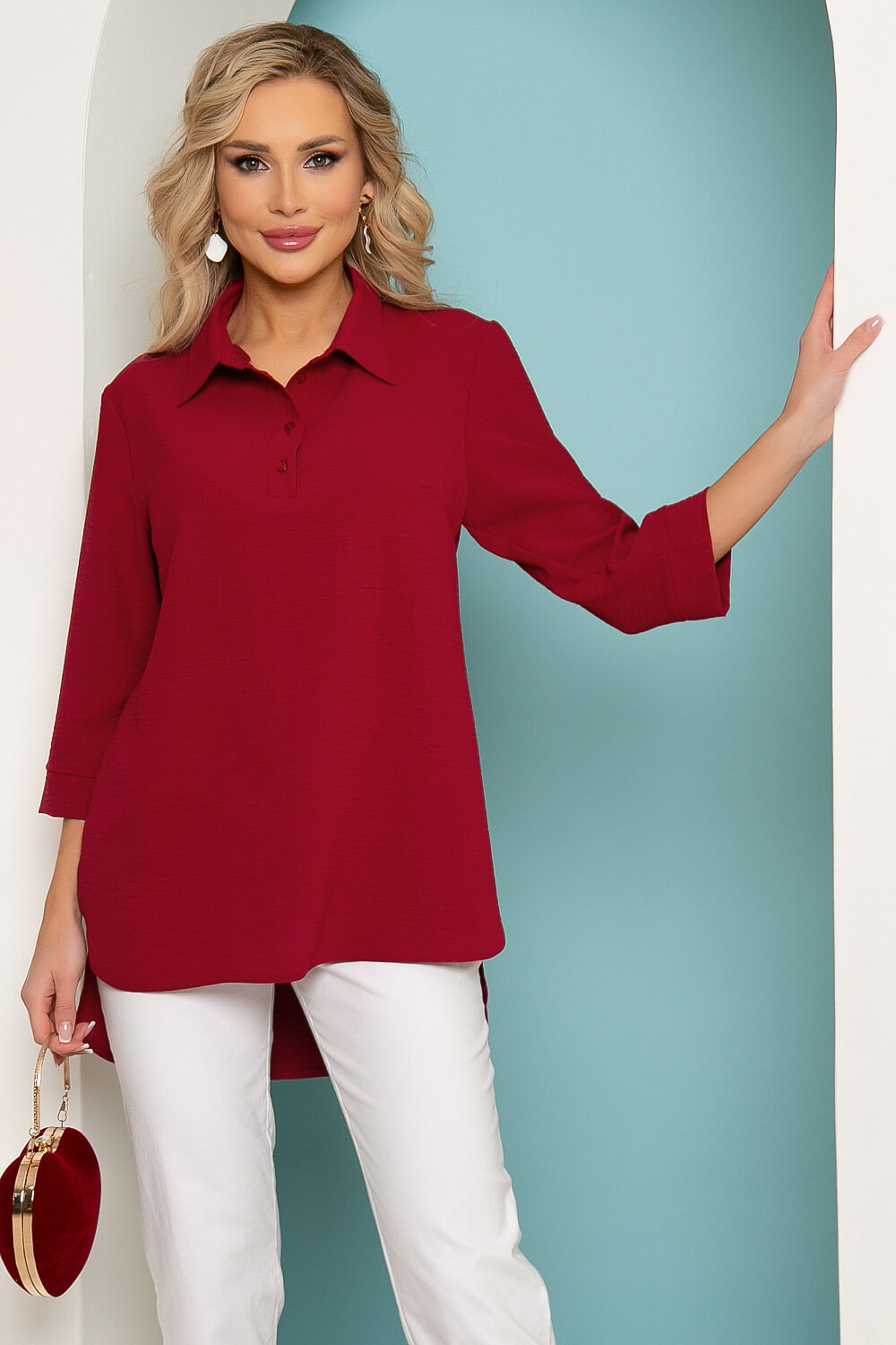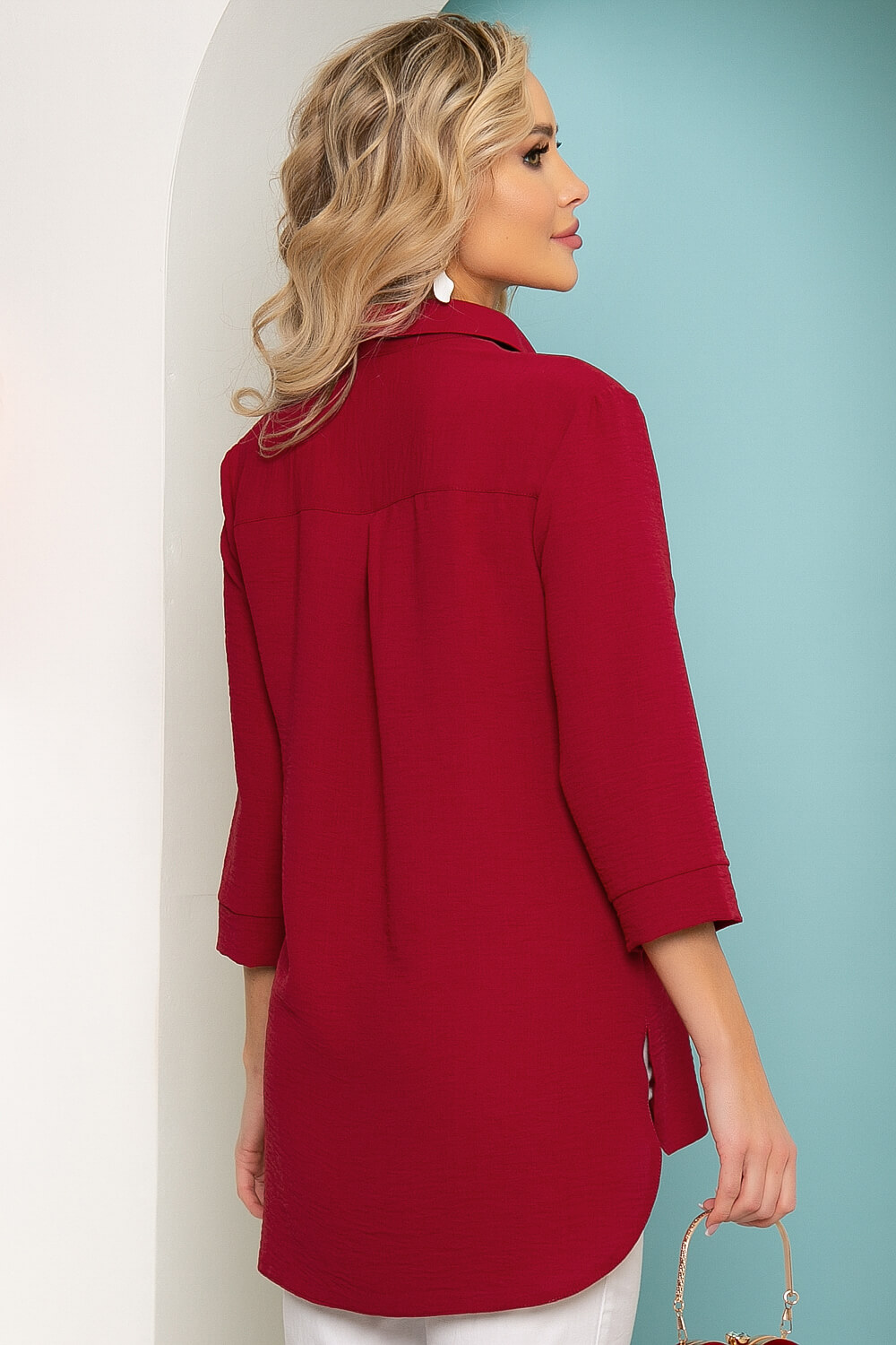 Лёгкая блуза свободного кроя в новом красивом цвете. Блуза с удлиненной спинкой, края скруглены, по бокам разрезы. Классический отложной воротничок, по переду застёгивается на 4 пуговицы. Рукав три четверти, на манжете.