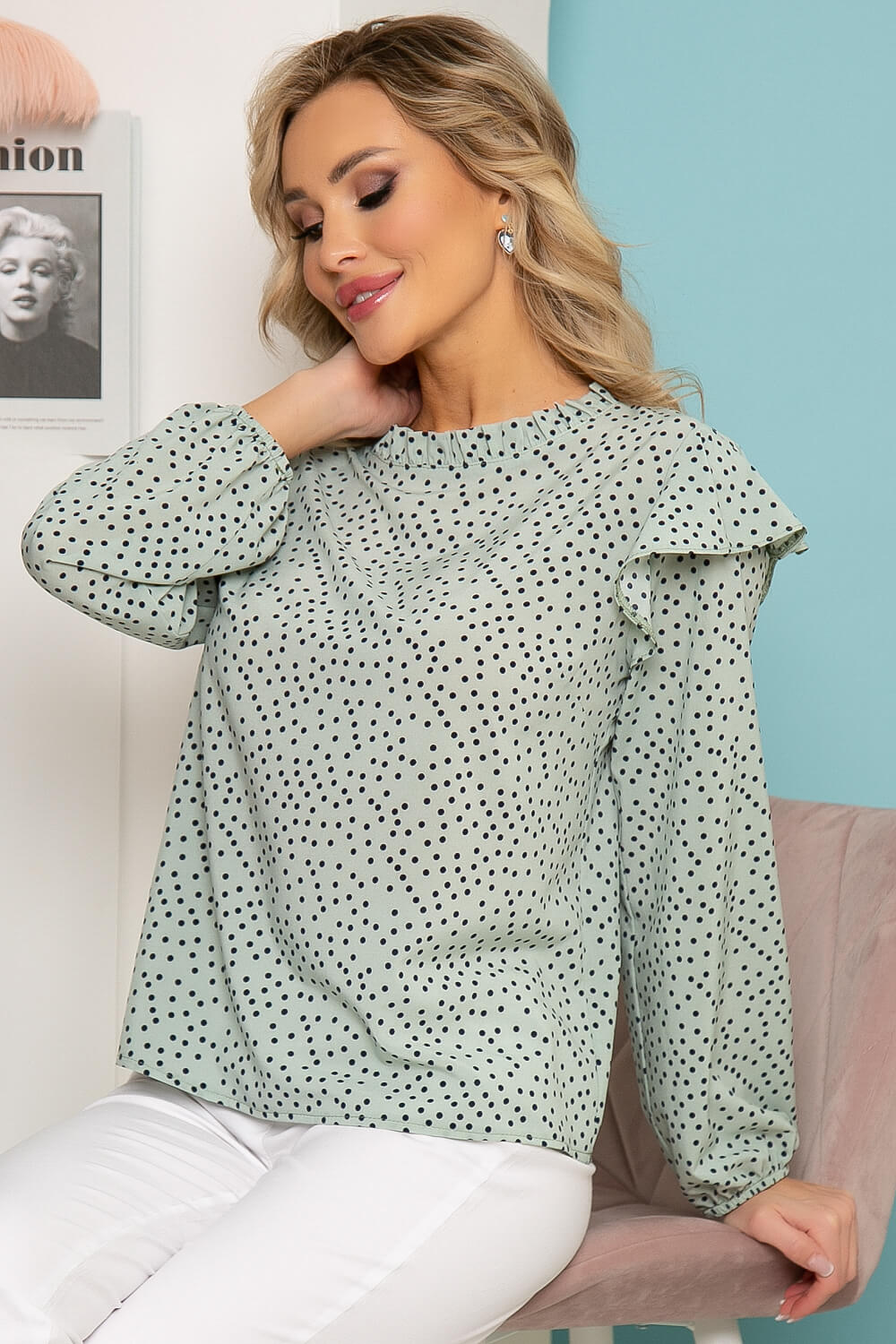 Блуза в горошек для создания привлекательного образа. Свободный крой, рукав втачной, длинный, по низу на резинке. В плечевых швах воланы-крылышки, округлый вырез горловины, оформленный сборкой. По спинке застёжка "Петля-пуговица".