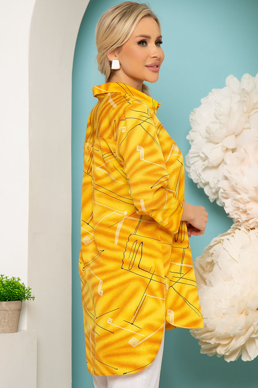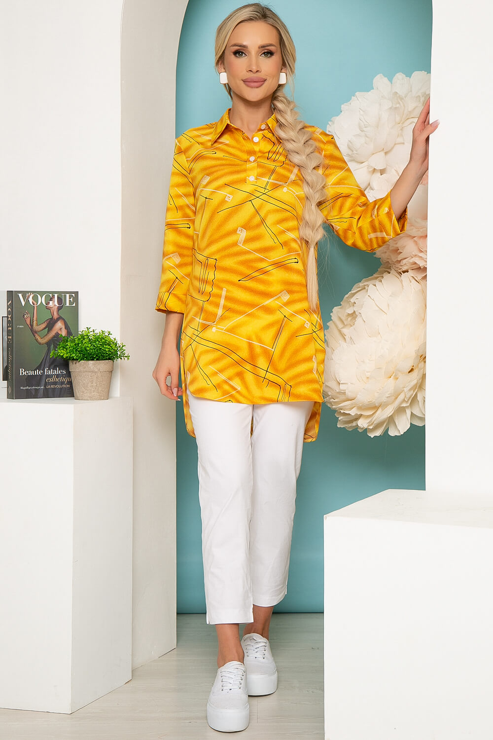 Яркая рубашка хорошо подойдёт для повседневных летних образов. Отлично сочетается с голубыми джинсами и белыми брюками. Рубашка свободного кроя, спинка удлинена, по бокам разрезы, края скруглены. Рукав три четверти, на манжете. V-образный вырез горловины, отложной воротничок, застёгивается на пуговки. По спинке отрезная кокетка.