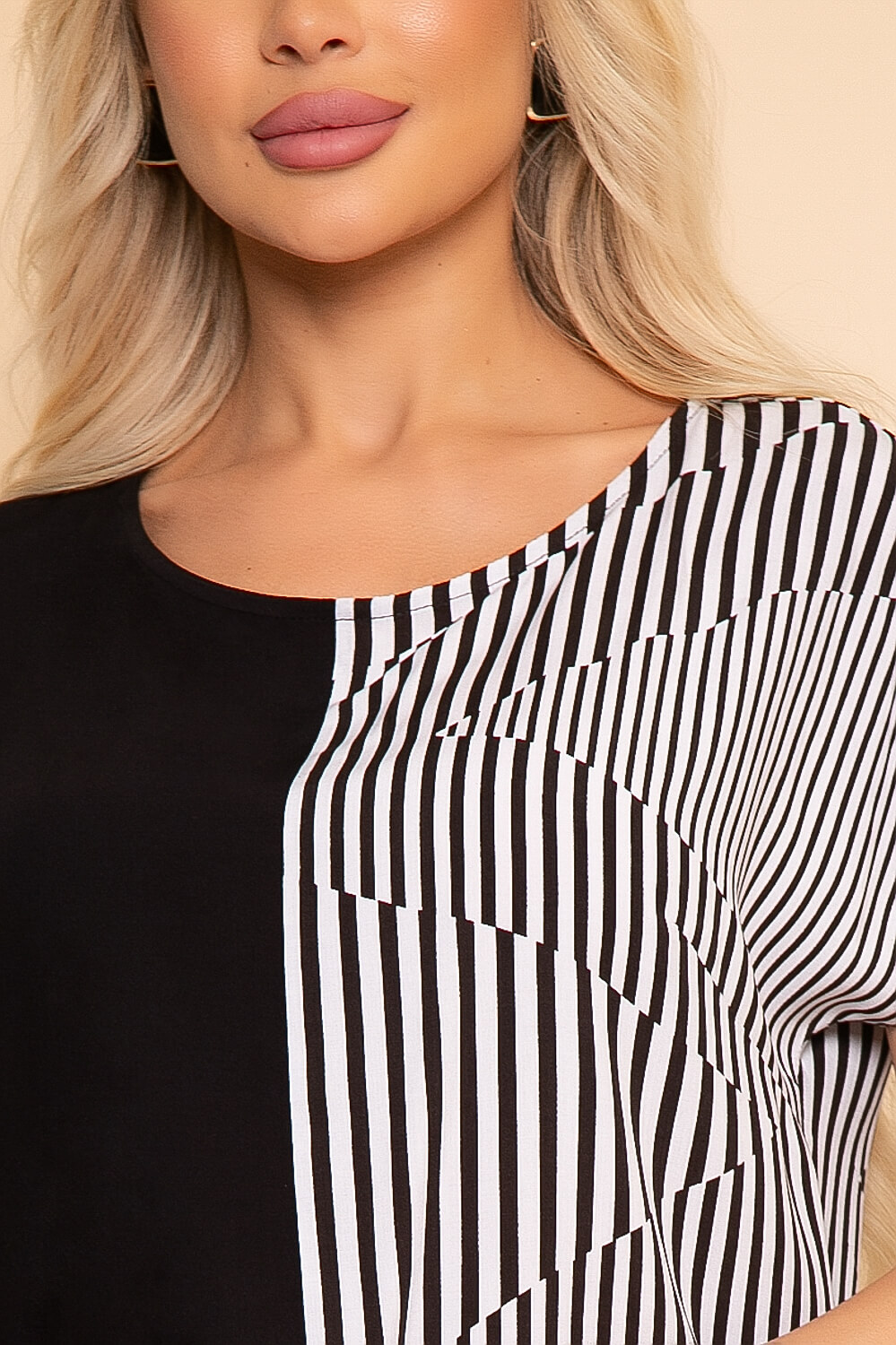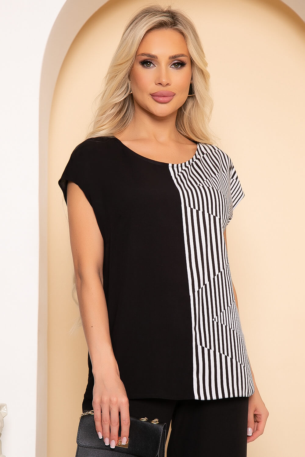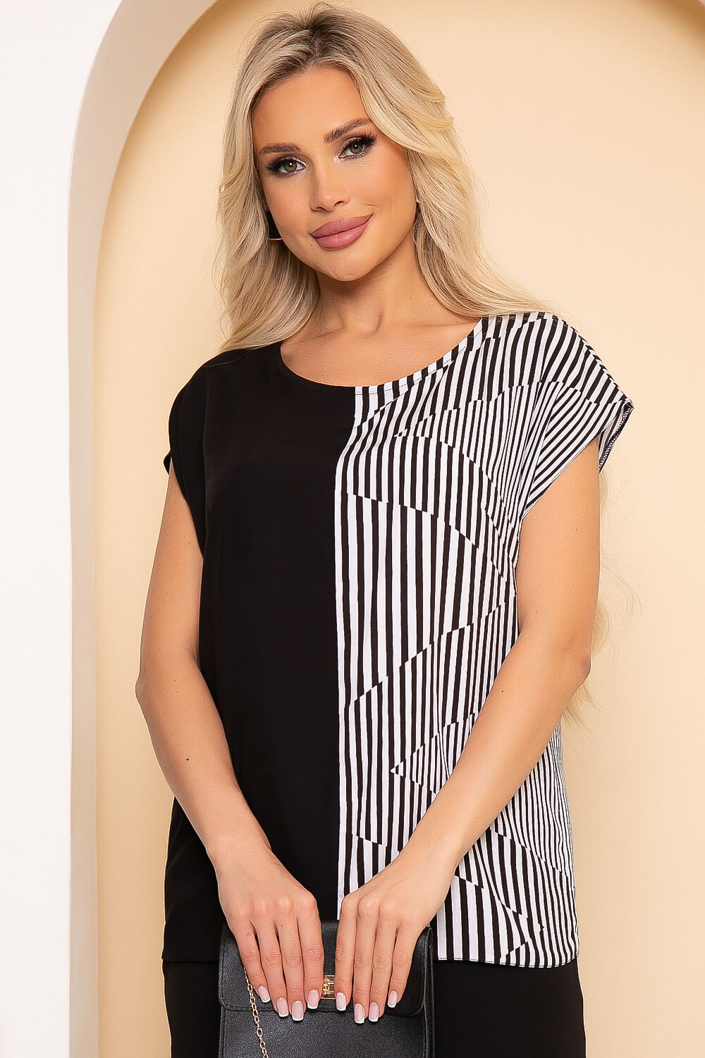 Блуза полуприлегающего силуэта без рукава из штапеля в классическом сочетании чёрного и белого цветов. Мягкий, округлый вырез горловины, по груди вытачки. По спинке и переду проходит шов, соединяющий две расцветки ткани.