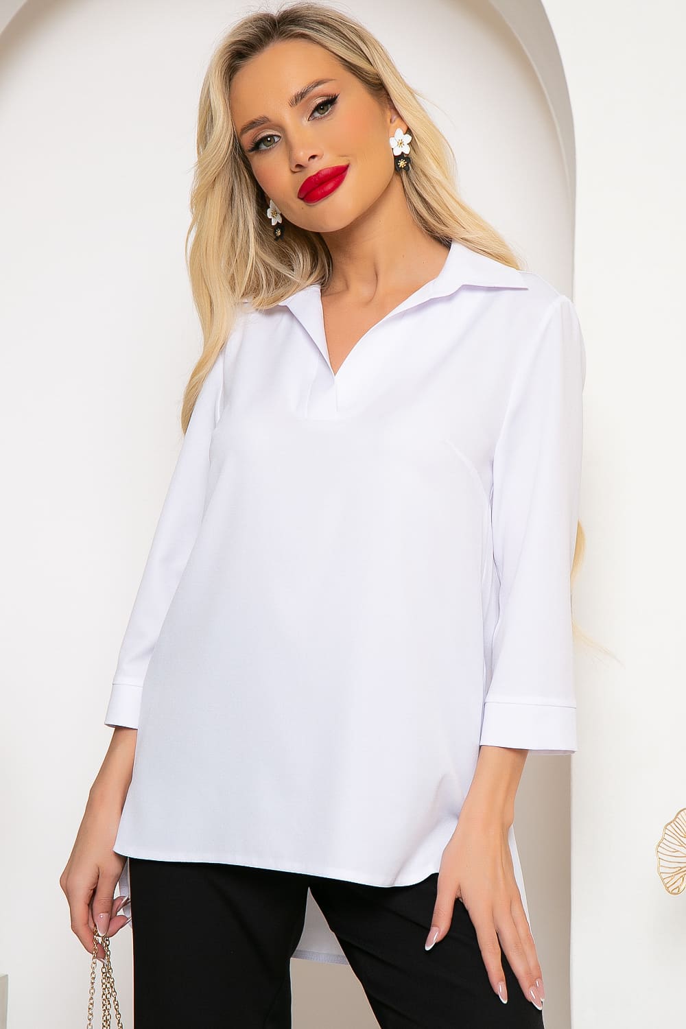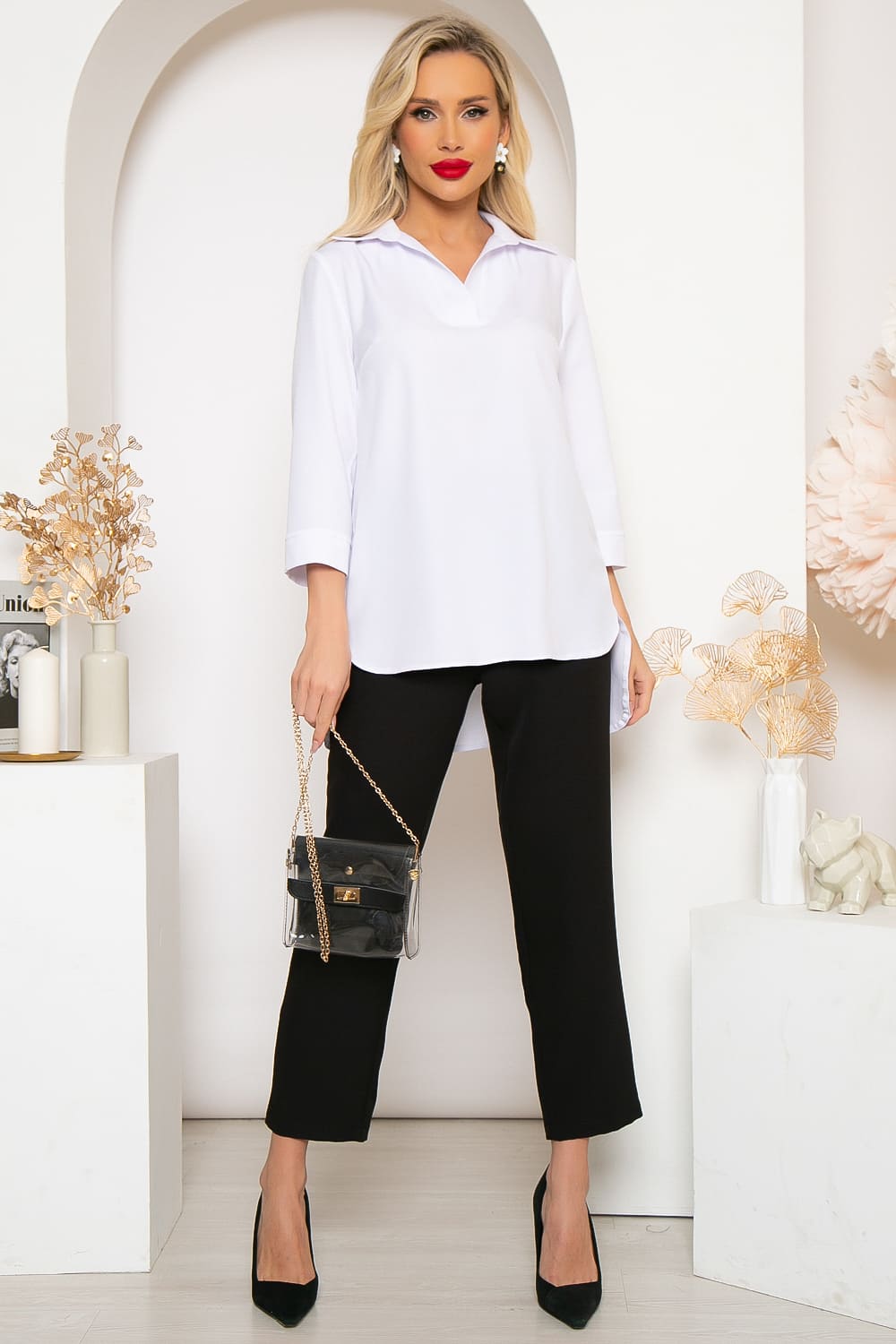 Белая женская рубашка свободного классического кроя будет стильно комбинироваться с любым низом. Рукав три четвертых, на манжете. V-образный вырез горловины, отложной воротничок. По спинке отрезная кокетка, заложена декоративная складка. Спинка удлинена, низ закруглен.