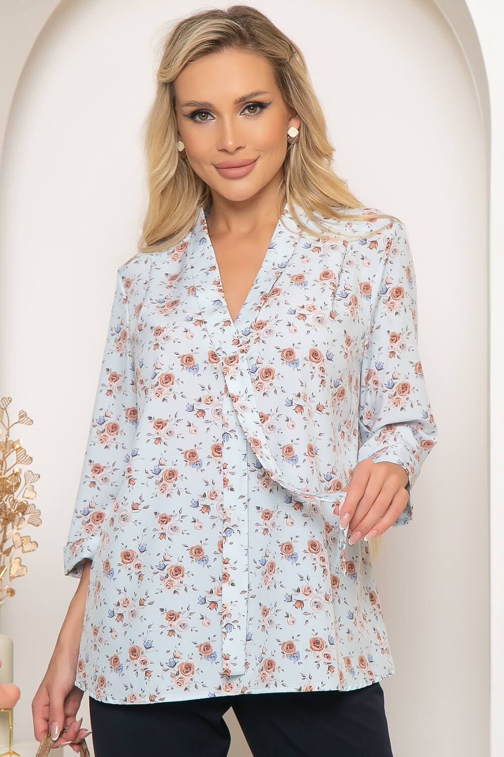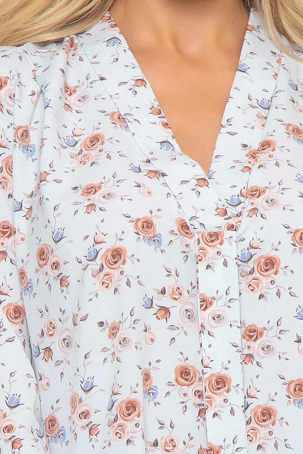 Блуза прямого силуэта, выполнена из очень приятной к телу ткани, в нежно-голубом оттенке с цветочным принтом. Рукав втачной, 3/4, низ рукава с отворотом. По спинке отрезная кокетка, заложена декоративная складка. Воротник отложной, мягко переходит в галстук, который можно завязать на бант.