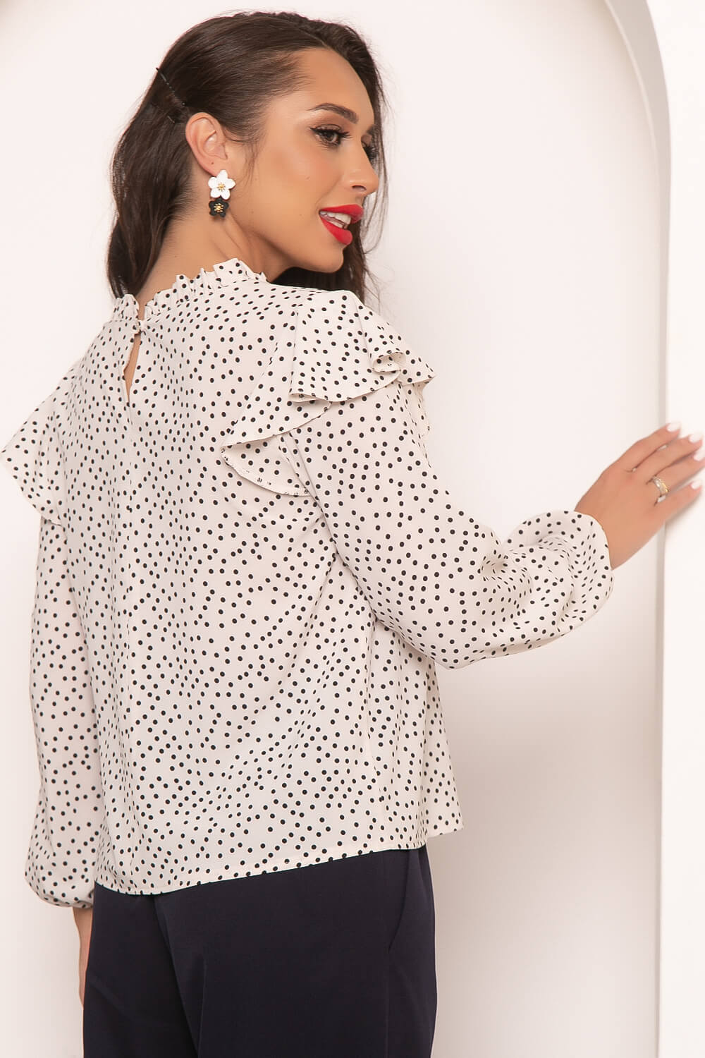 Блуза в горошек для создания привлекательного образа. Свободный крой, рукав втачной, длинный, по низу на резинке. В плечевых швах воланы-крылышки, округлый вырез горловины, оформленный сборкой.
