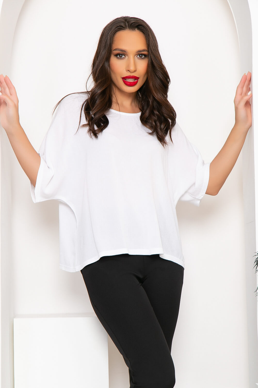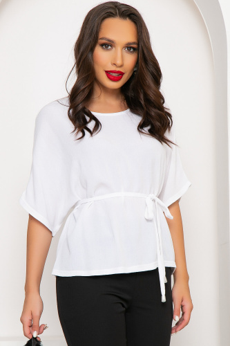 Блуза свободного кроя выполнена из очень приятной к телу ткани в базовом белом оттенке. Рукав цельнокроенный, укороченный. Округлая горловина блузы обработана обтачкой. В комплект входит тонкий пояс из основной ткани с пластмассовыми наконечниками.