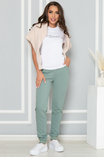 Брюки из футера в красивом пыльно-мятном оттенке помогут в создании красивого повседневного образа. Они отлично подойдут для занятий спортом. Талия на резинке, по низу брин - манжеты. В боковых швах есть удобные карманы.